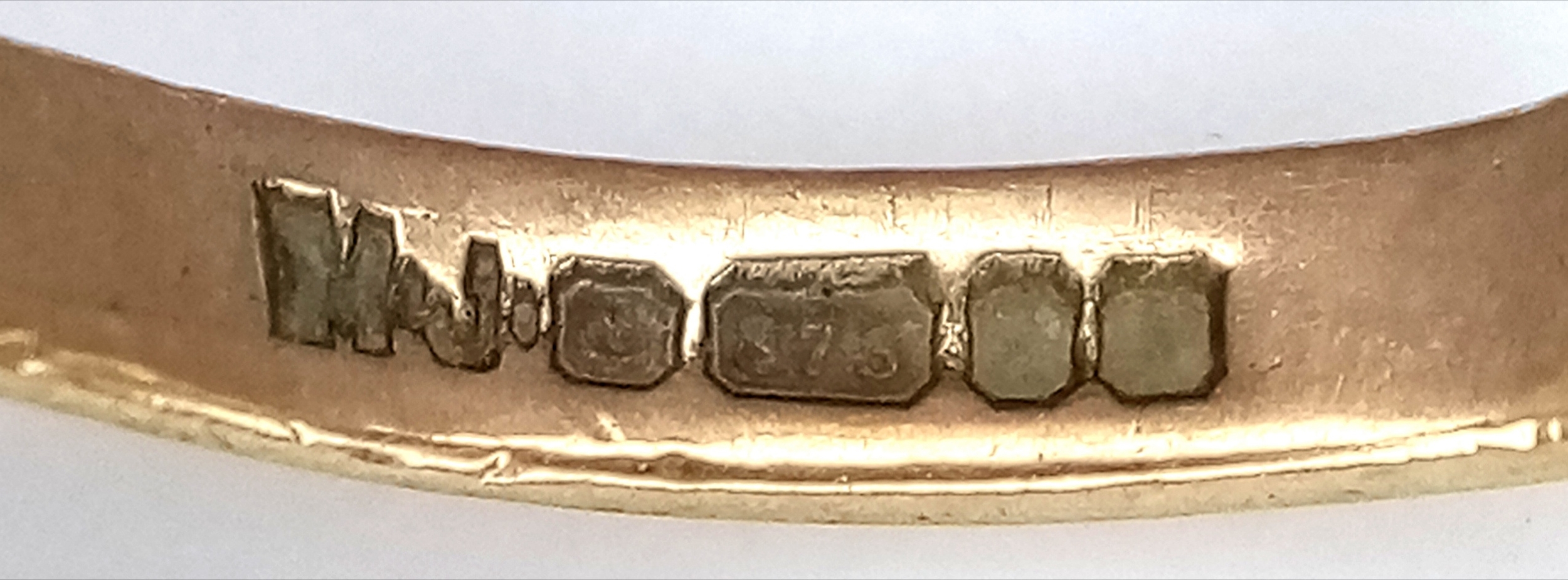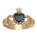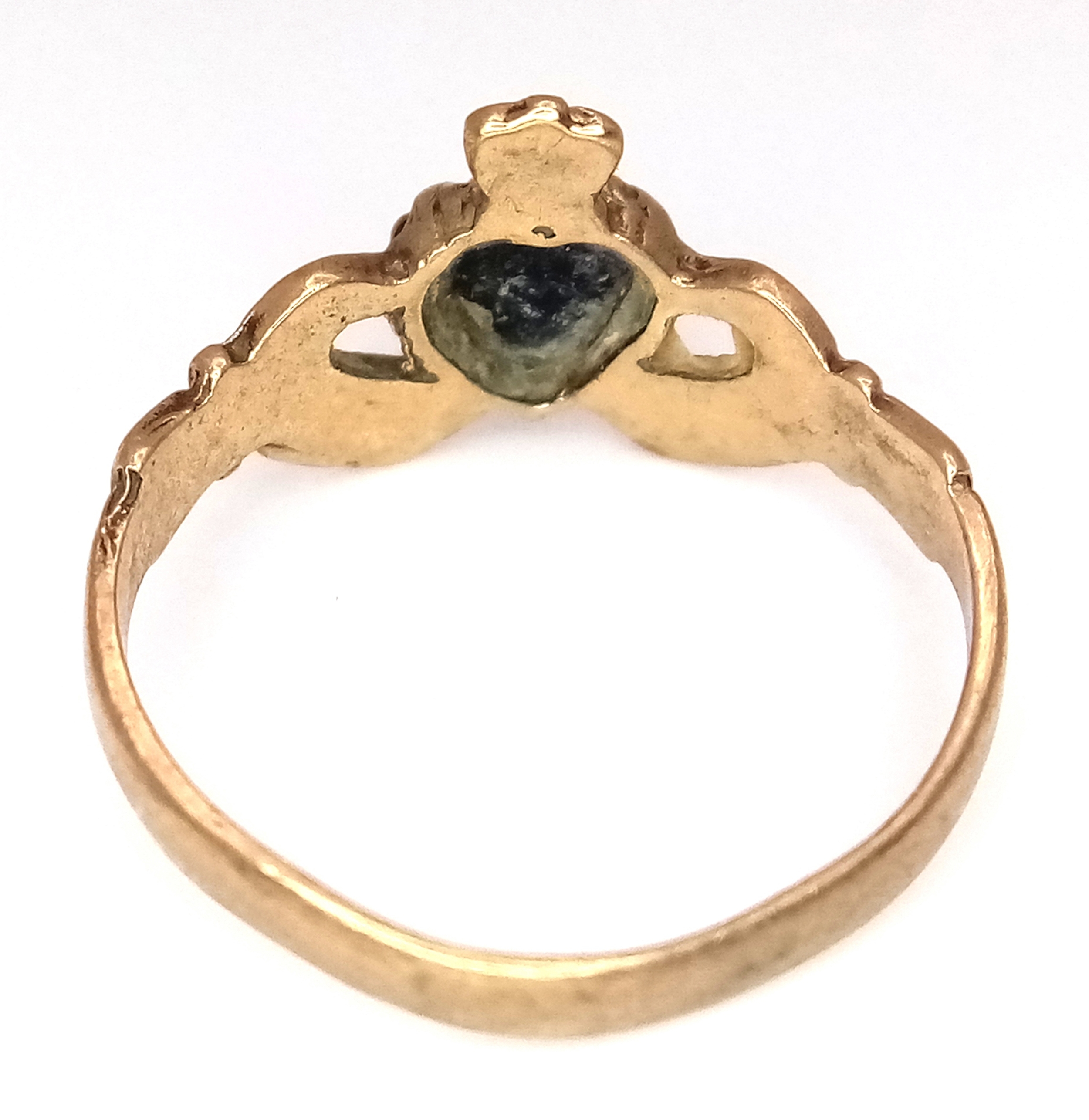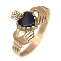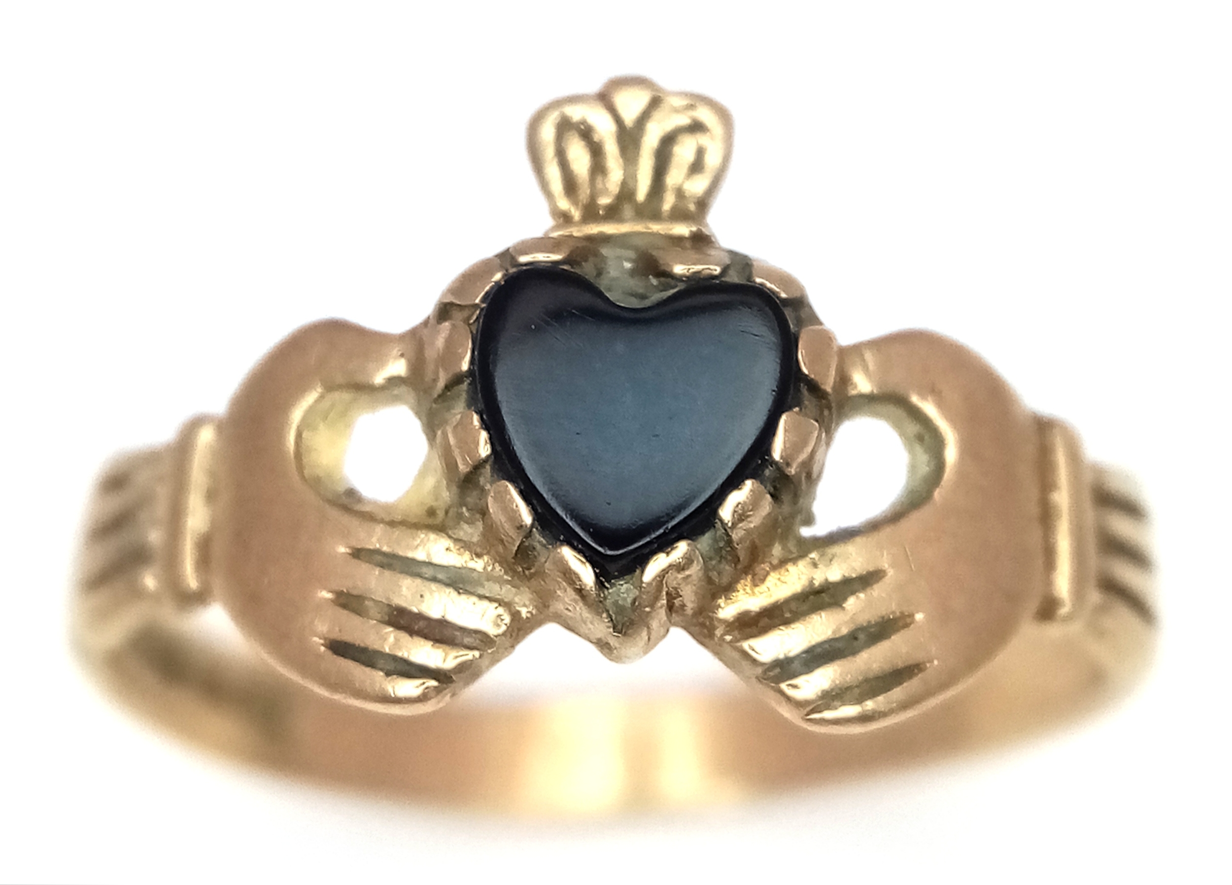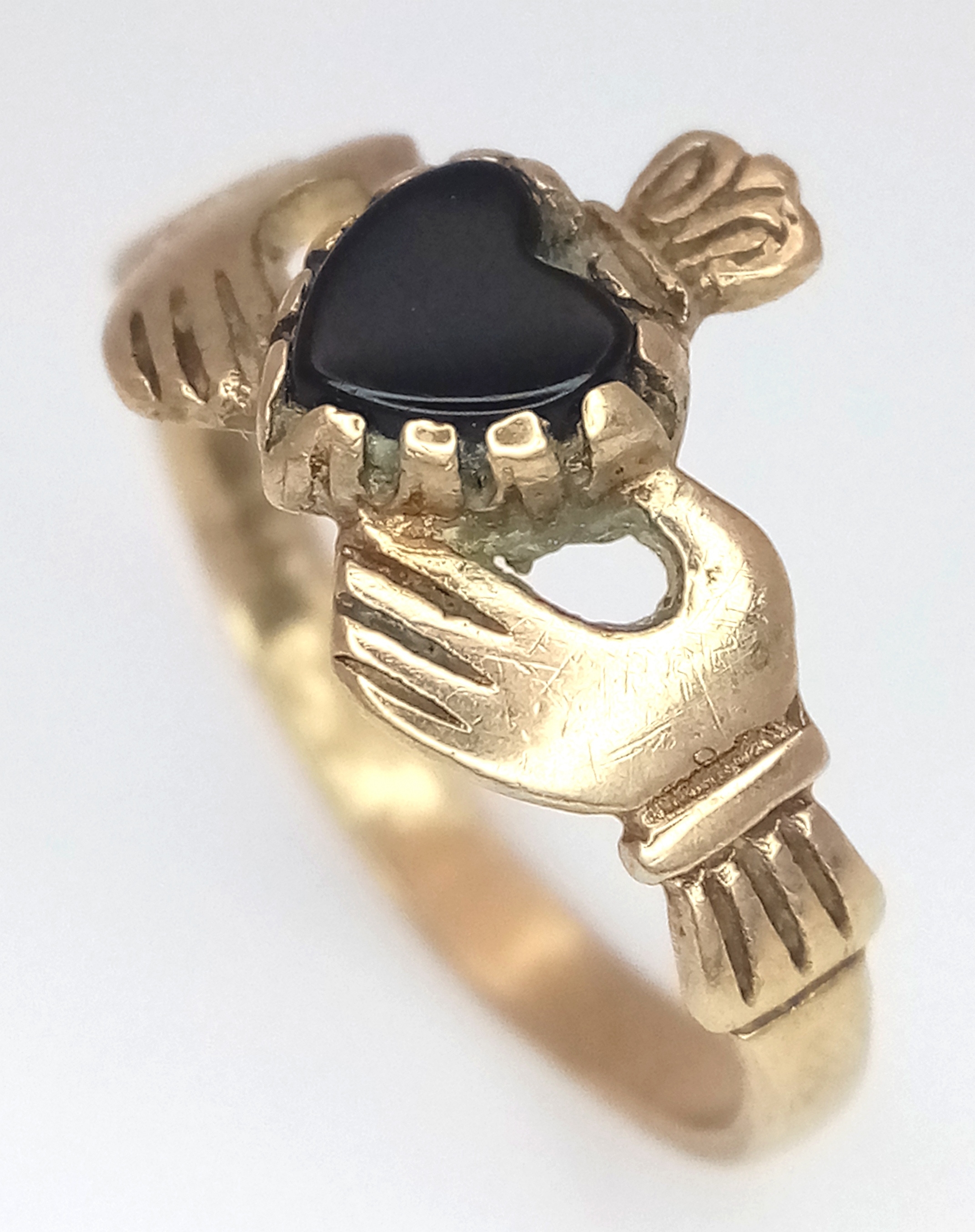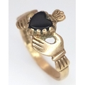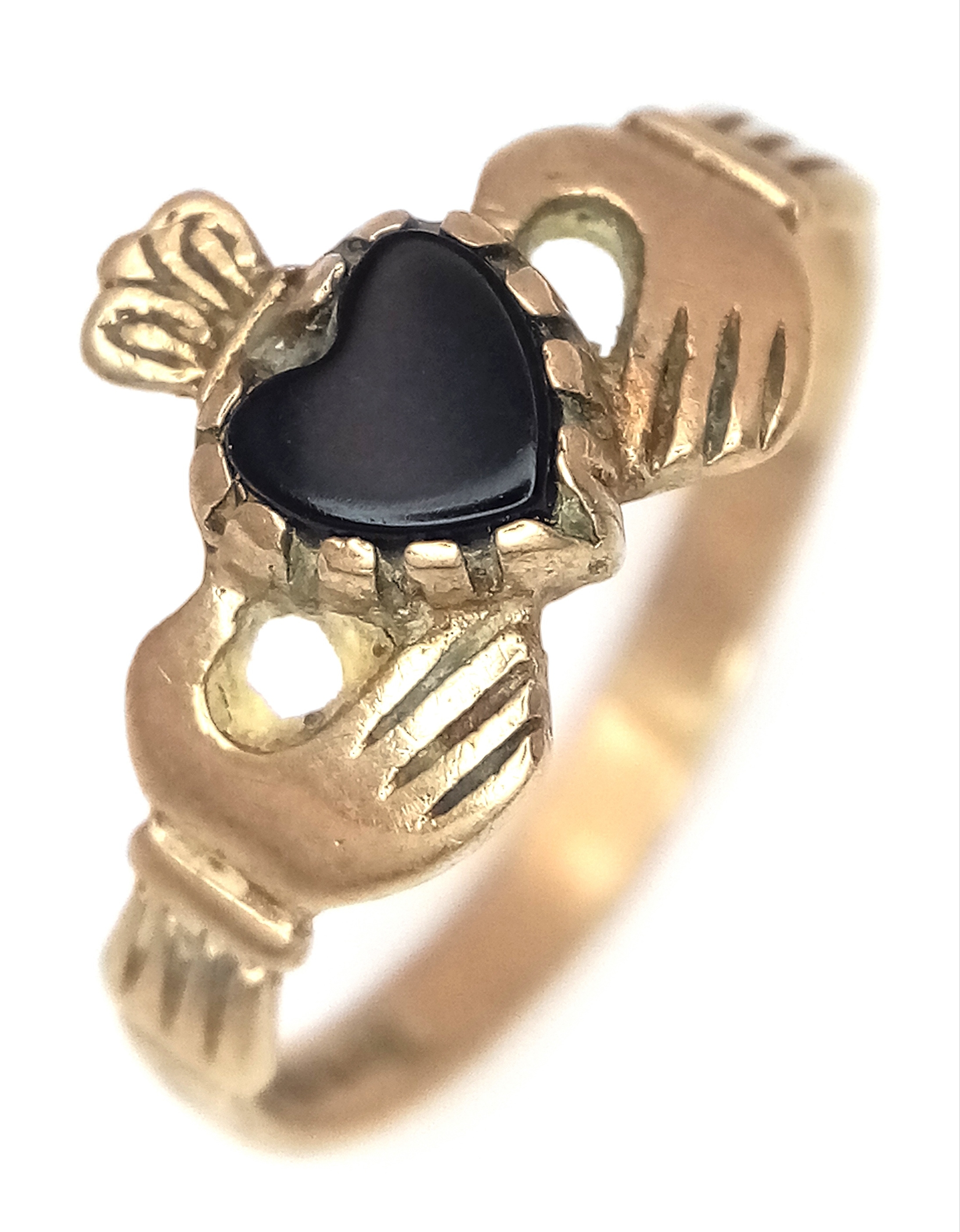 A 9K Yellow Gold Onyx Claddagh Ring. Size K. 1.55g.