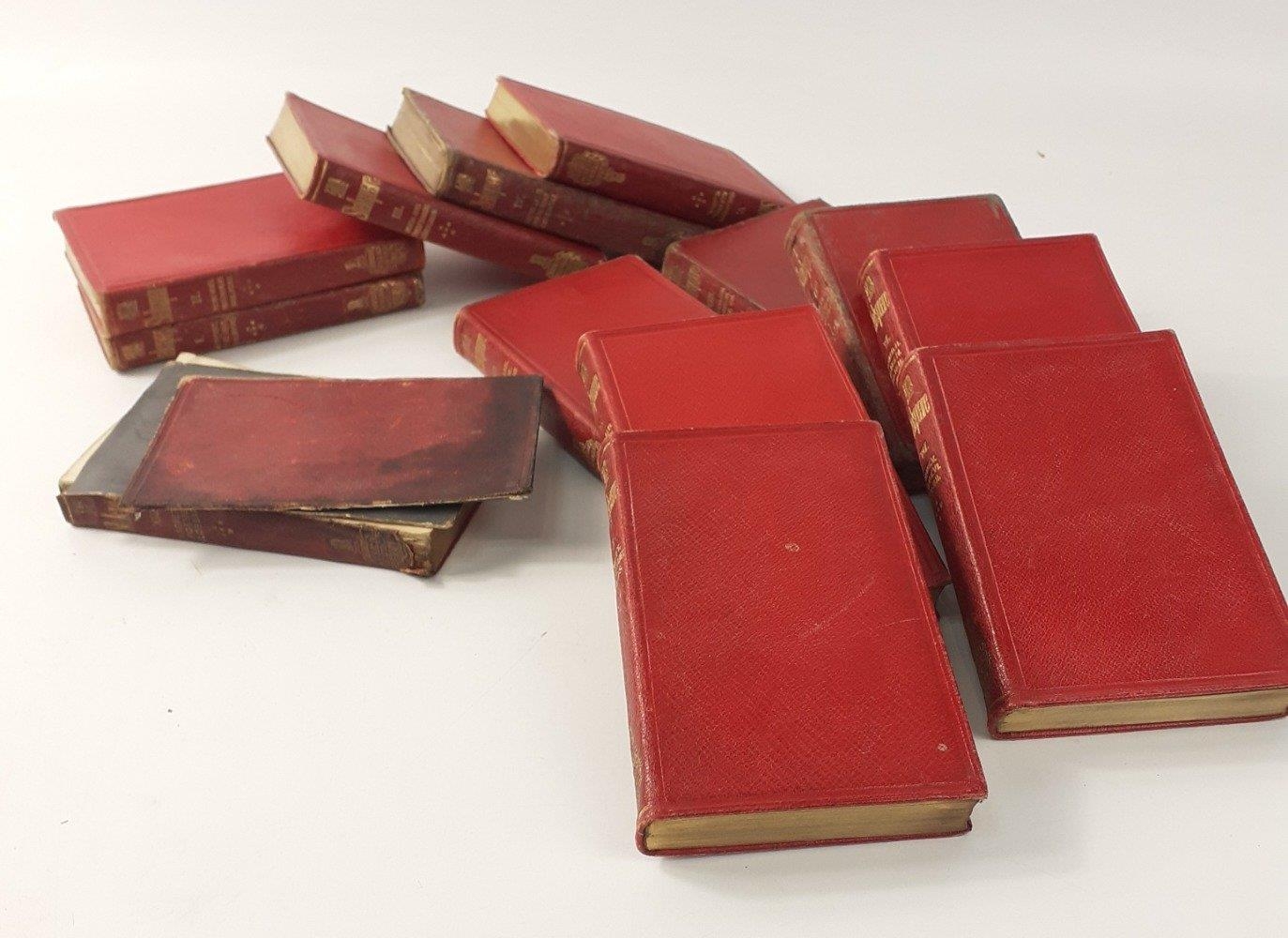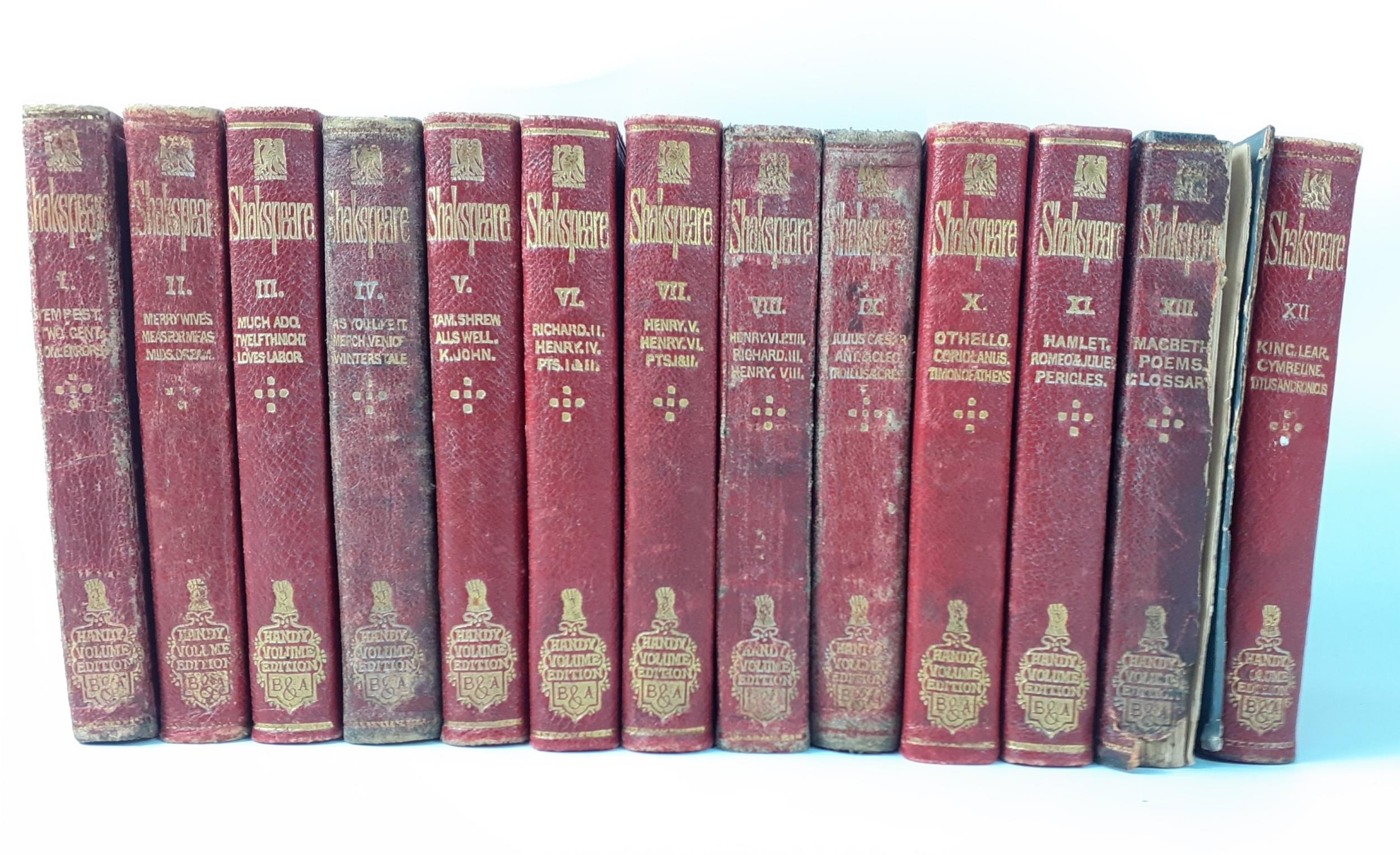 VINTAGE COLLECTIBLE - LONDON c1870's - Thirteen volumes of the The Handy-Volume Shakespeare published by Bradbury, Agnew & Co, no pub. date, with red leather bindings and gilt lettering. One volume has one detached front cover, the rest show some wear but generally fair condition
