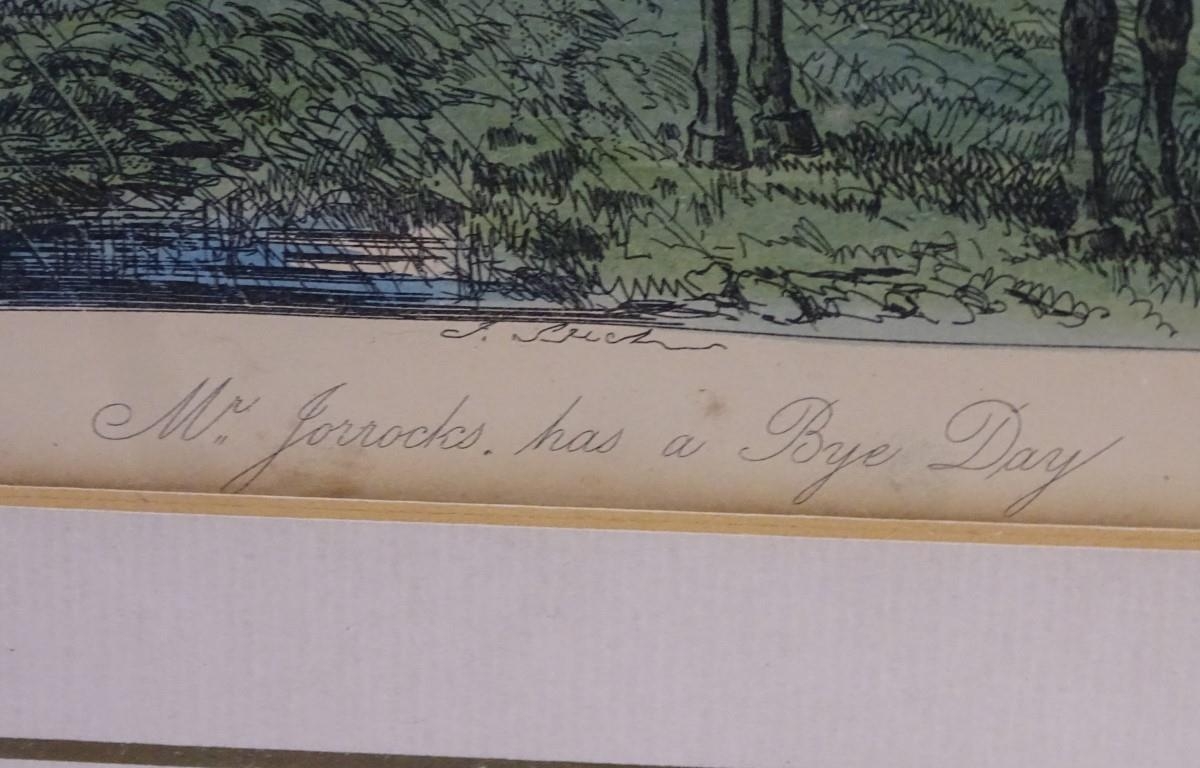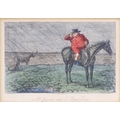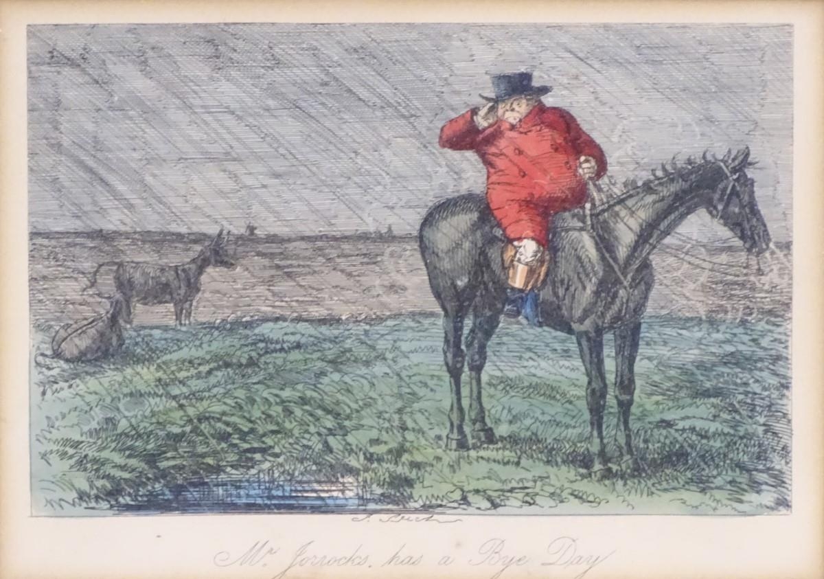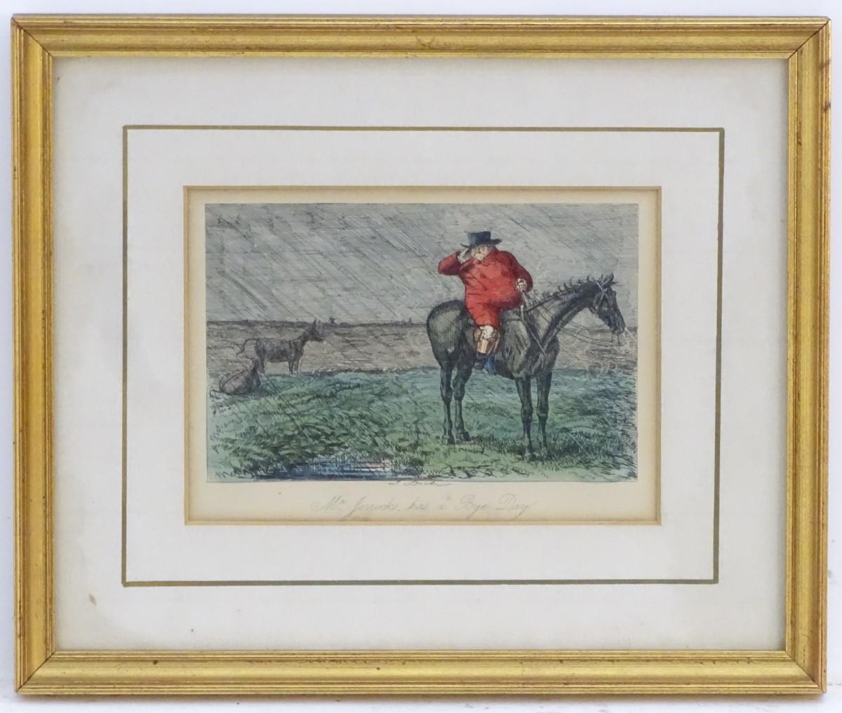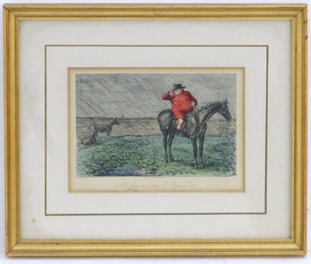 After John Leech (1817-1864), Hand coloured engraving, Mr Jorrocks has a Bye Day, Mr Jorrocks on horseback in the rain Illustration from Handley Cross, or Mr Jorrocks's Hunt, by Robert Smith Surtees. Titled under. Approx. 4 1/4'' x 6 3/4''