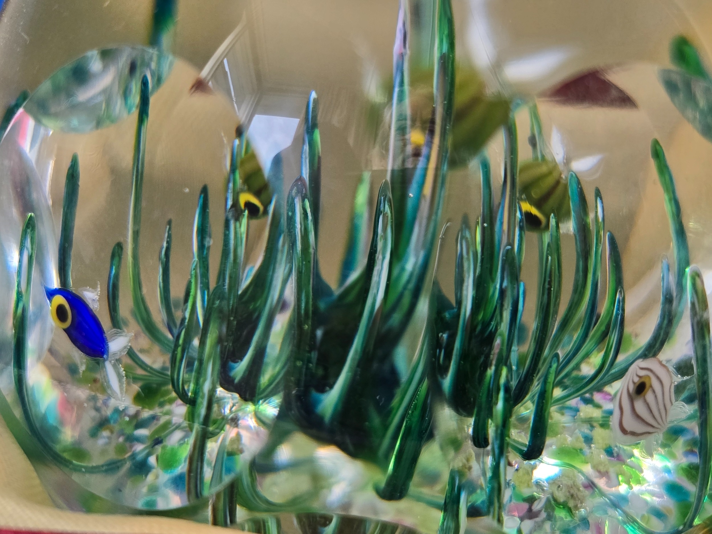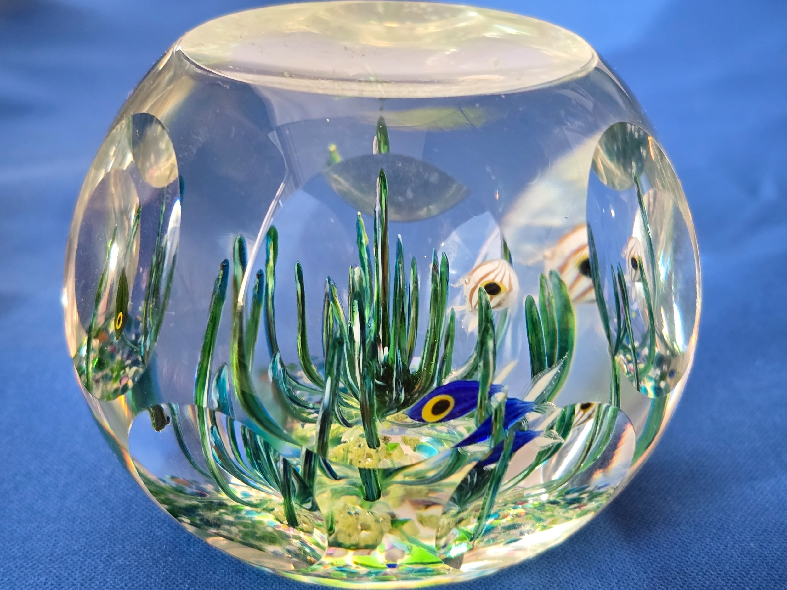Perthshire paperweights - 1980I "Tropical Fish" unusual. Appearance of fish swimming amongst seaweed. . Faceted, Excellent condition. Box and Cert. 76mm diam.