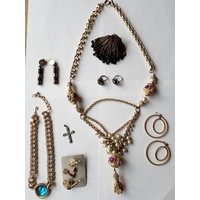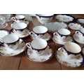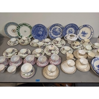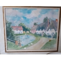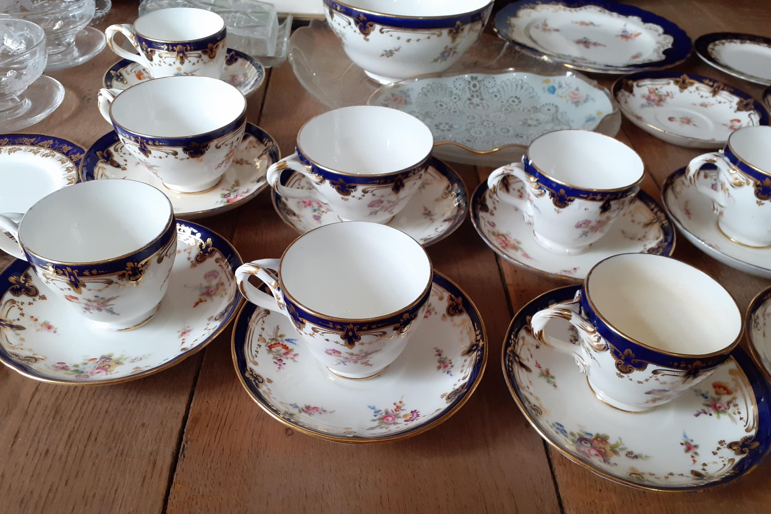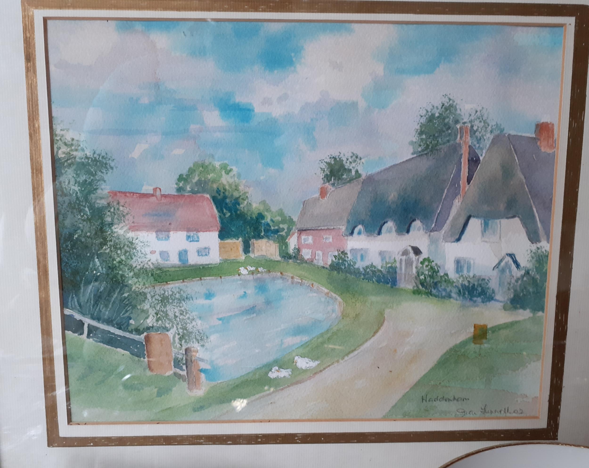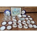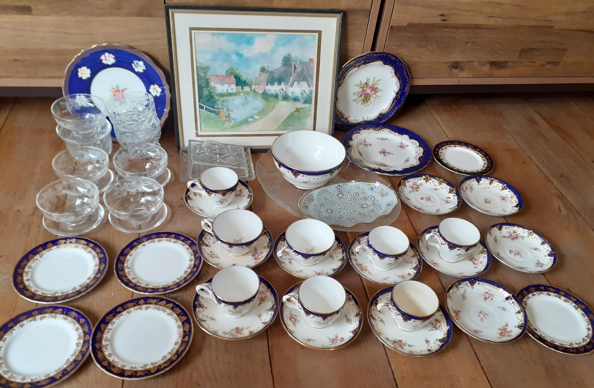 Late Victorian/early Edwardian tea cups, saucers, plate and sugar bowl having a white ground with blue and gilt band and floral decoration together with 6 Royal Worcester 'Arundel' side plates, mixed ceramics, glass and a Haddenham watercolour of the pond