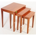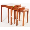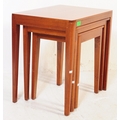 A contemporary teak wood graduating nest of tables of Danish influence. Each nesting table raised on quadrille style shaped supports united by stretchers.