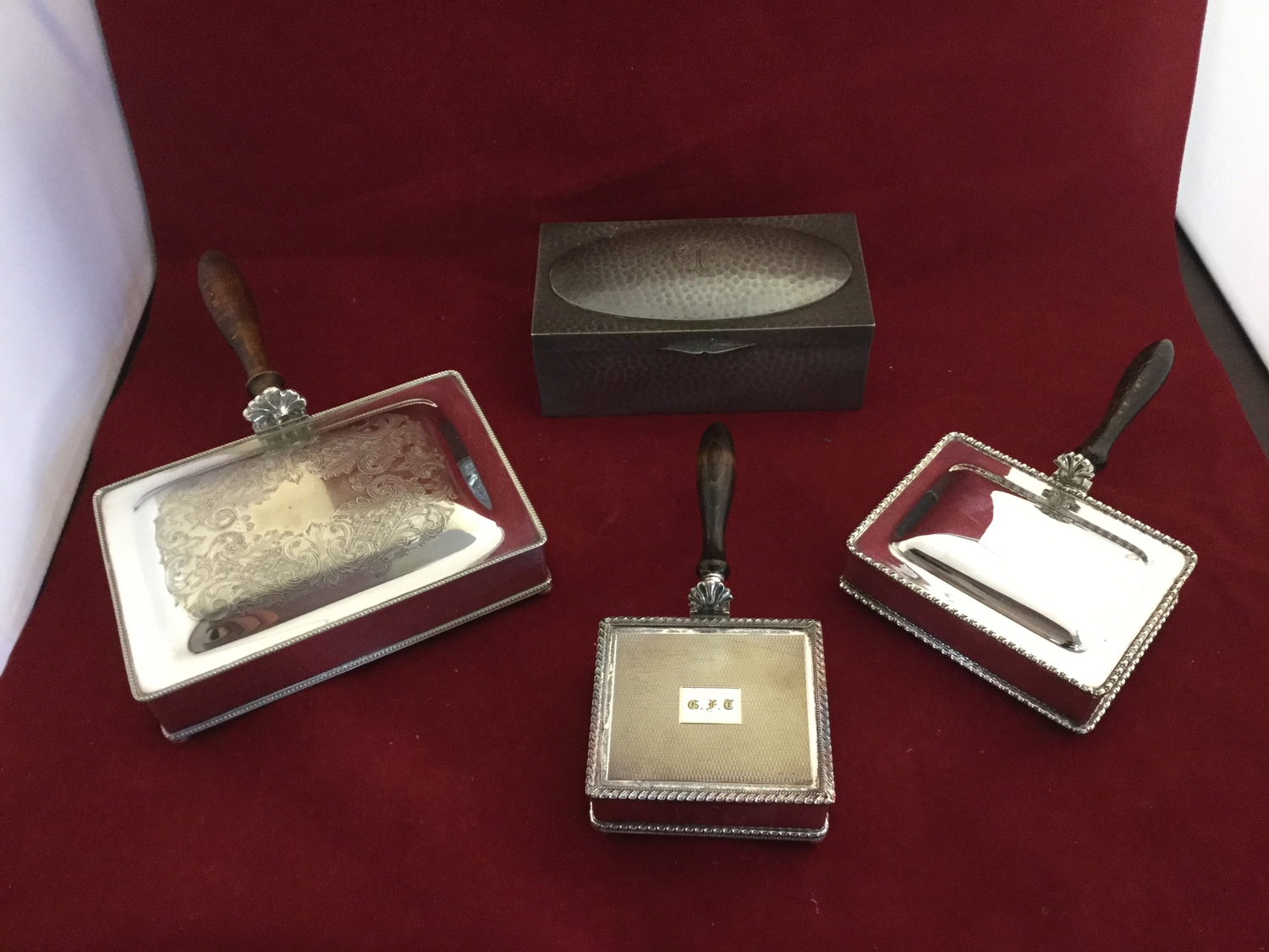 Three silver plated cigarette boxes, each handled, and a pewter cigarette box (4) -