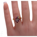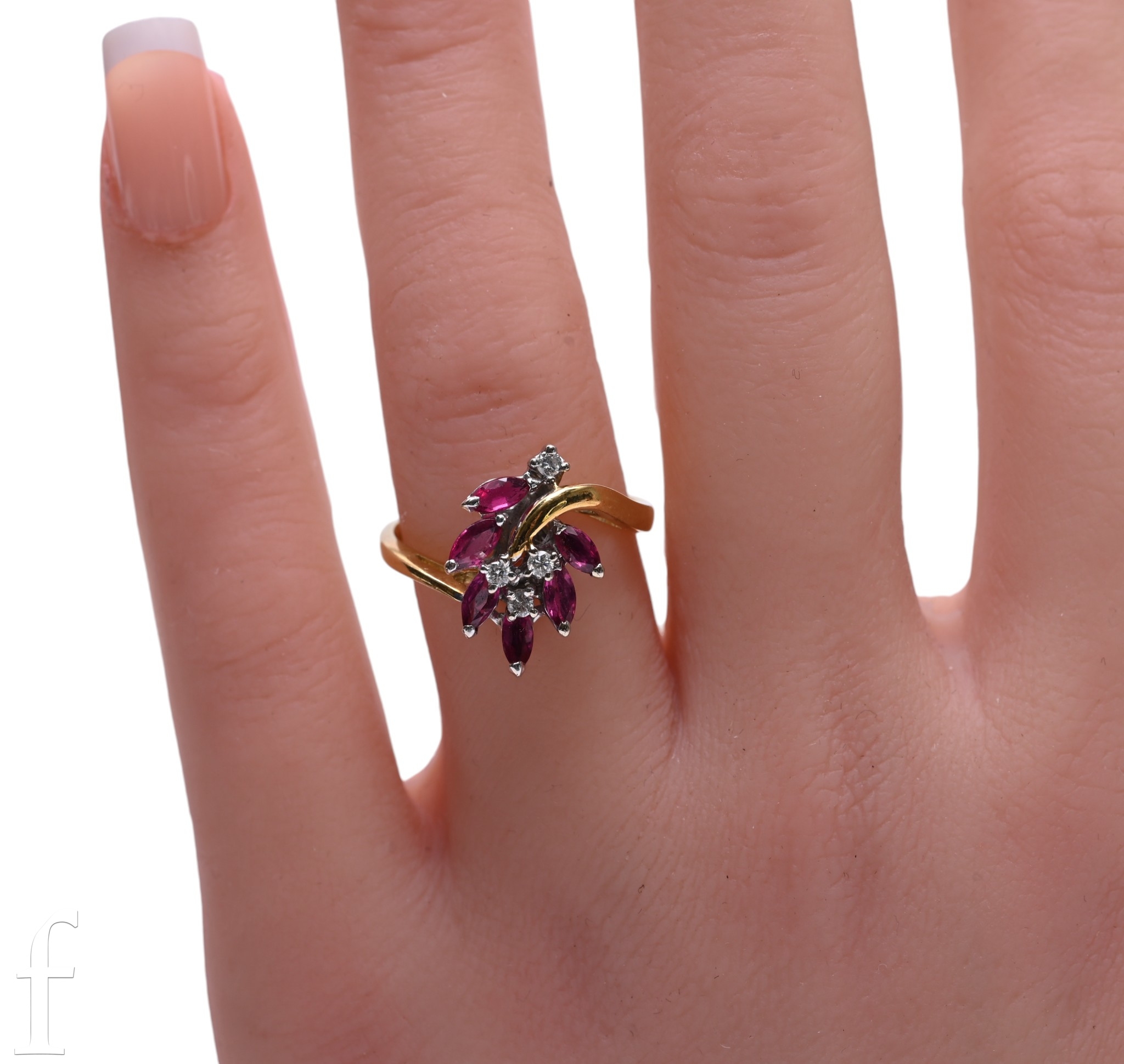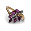 A ruby and diamond ring, of trailing flower design, set with six pear-cut rubies and four brilliant-cut diamond highlights, hallmarked for 18 carat gold, total weight 4.1g, ring size N.