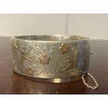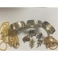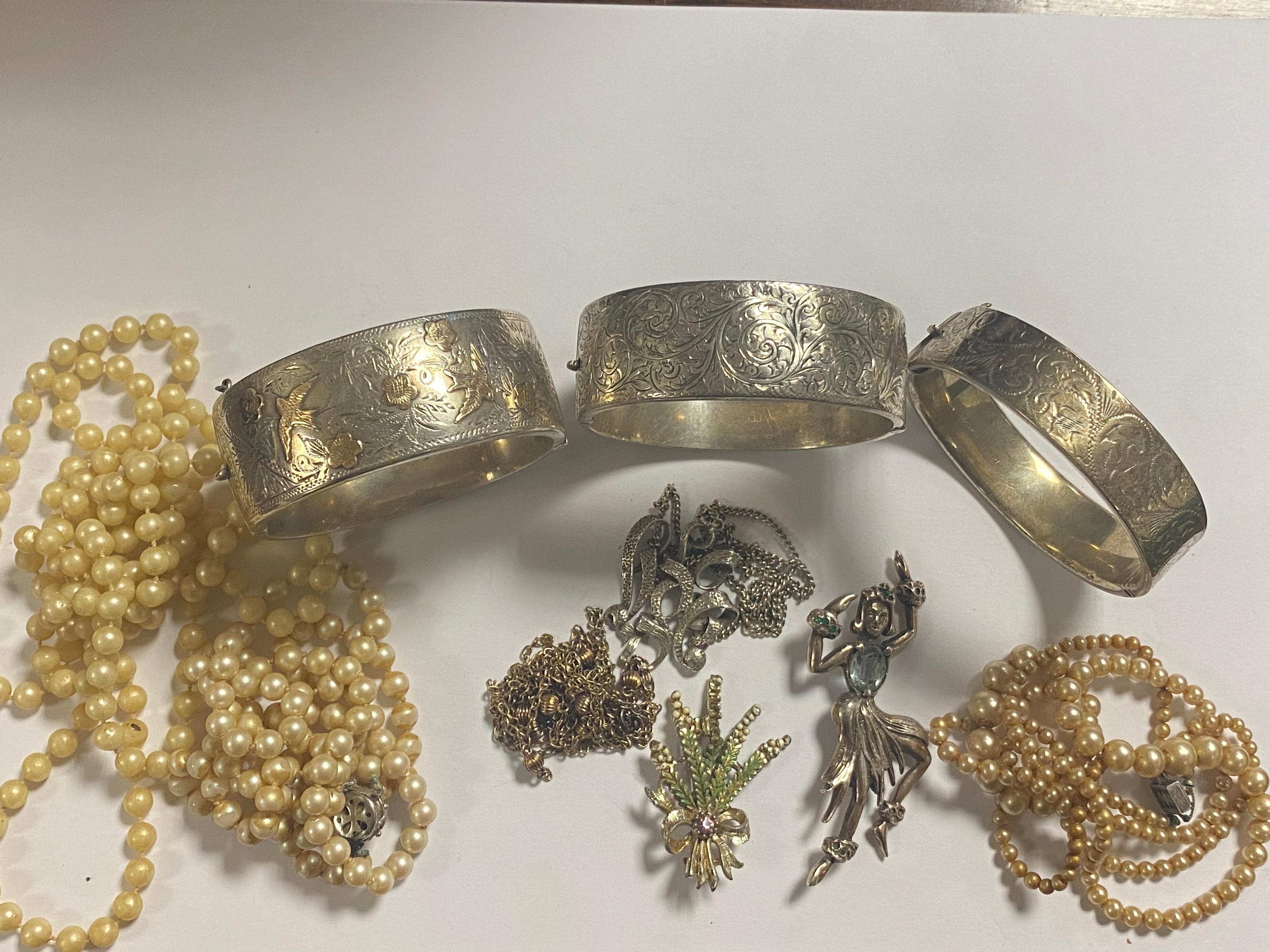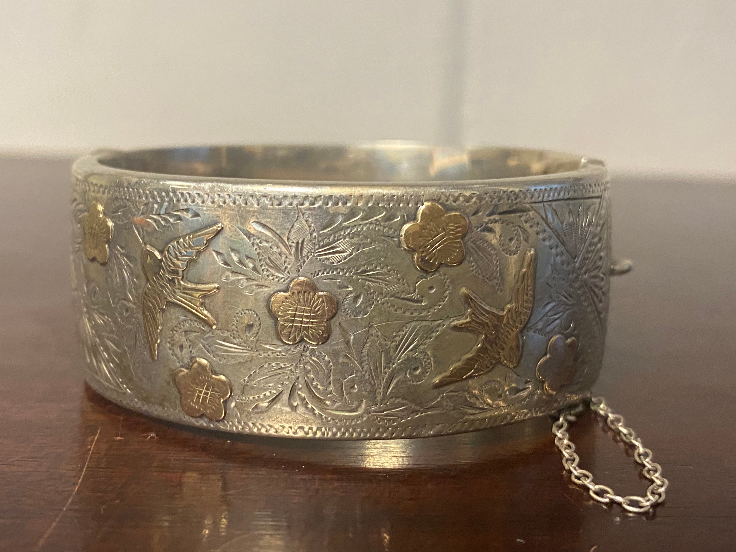 An Aesthetic style silver hinged bangle, with gold highlights, two other silver bangles and a small quantity of costume jewellery -