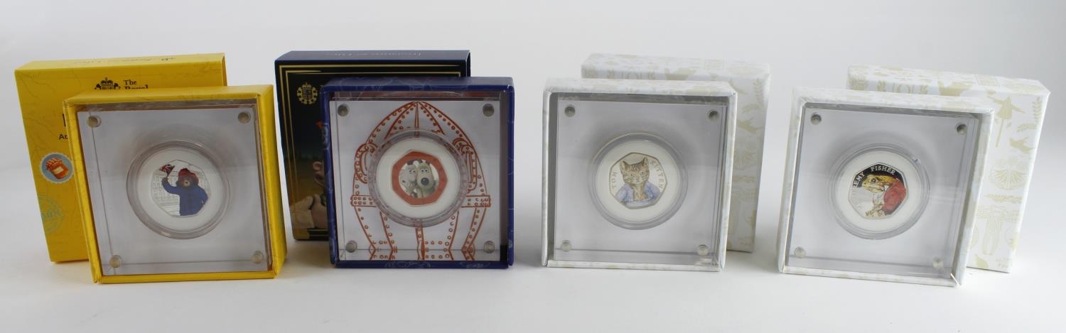 GB Royal Mint silver proof 50p's (4) clear block picture coins: Beatrix Potter Tom Kitten 2017, Jeremy Fisher 2017, Paddington at the Palace 2018, and Wallace & Gromit 2019, FDC cased with certs and sleeves.