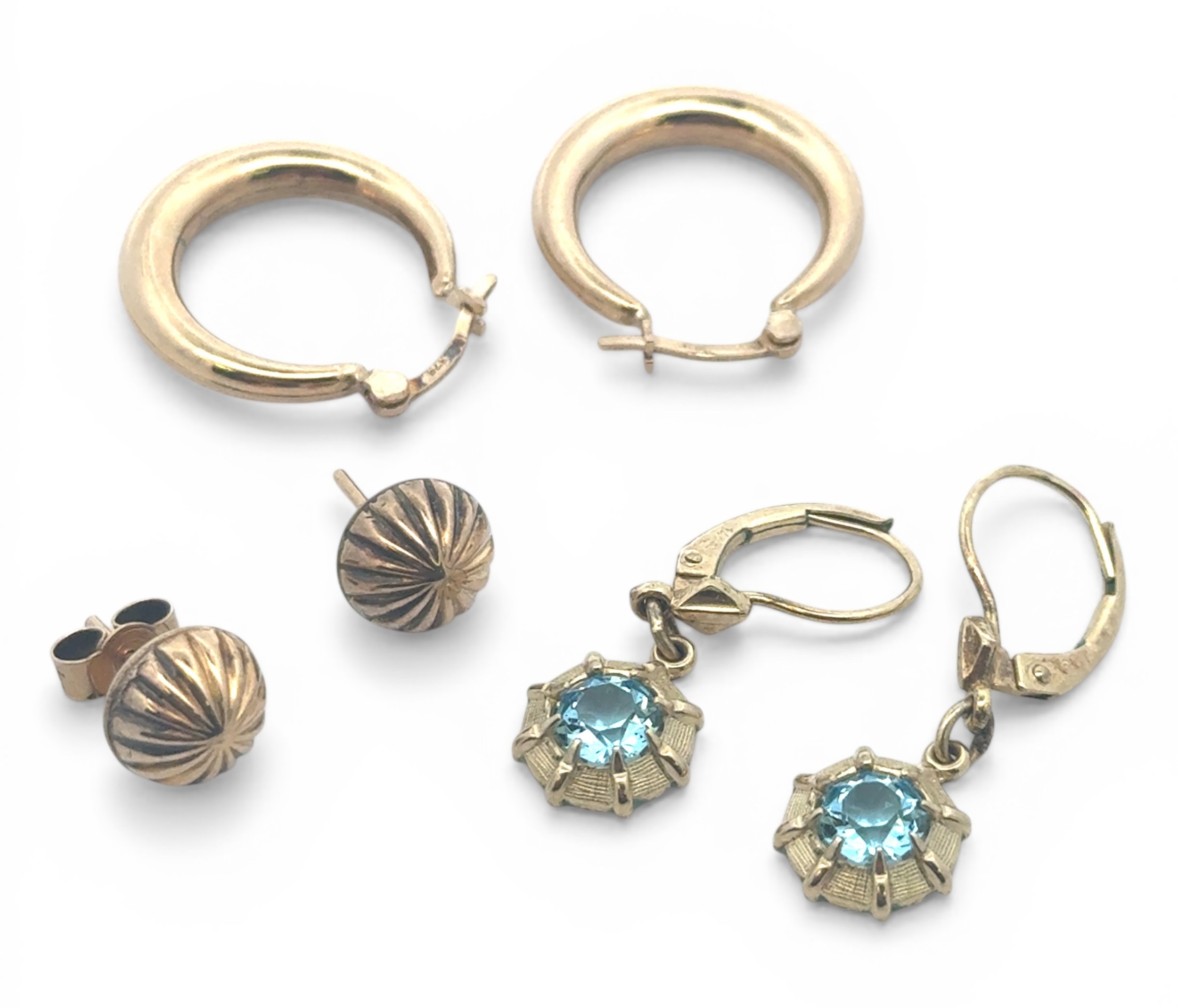 Three pairs of gold earrings to include a pair of 9ct gold hoop earrings, a pair of 9ct gold circular studs with butterfly backs, and a pair of octagonal blue stone earrings stamped 14ct, 1.79g. 3.9g combined.