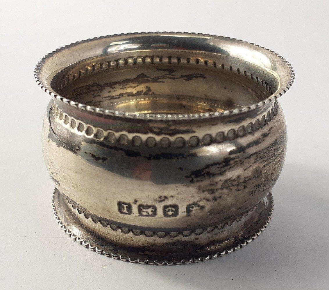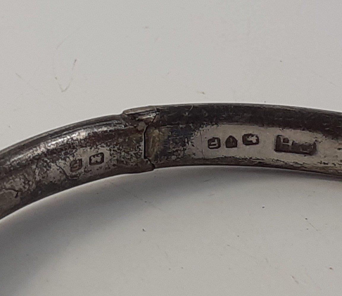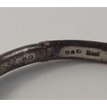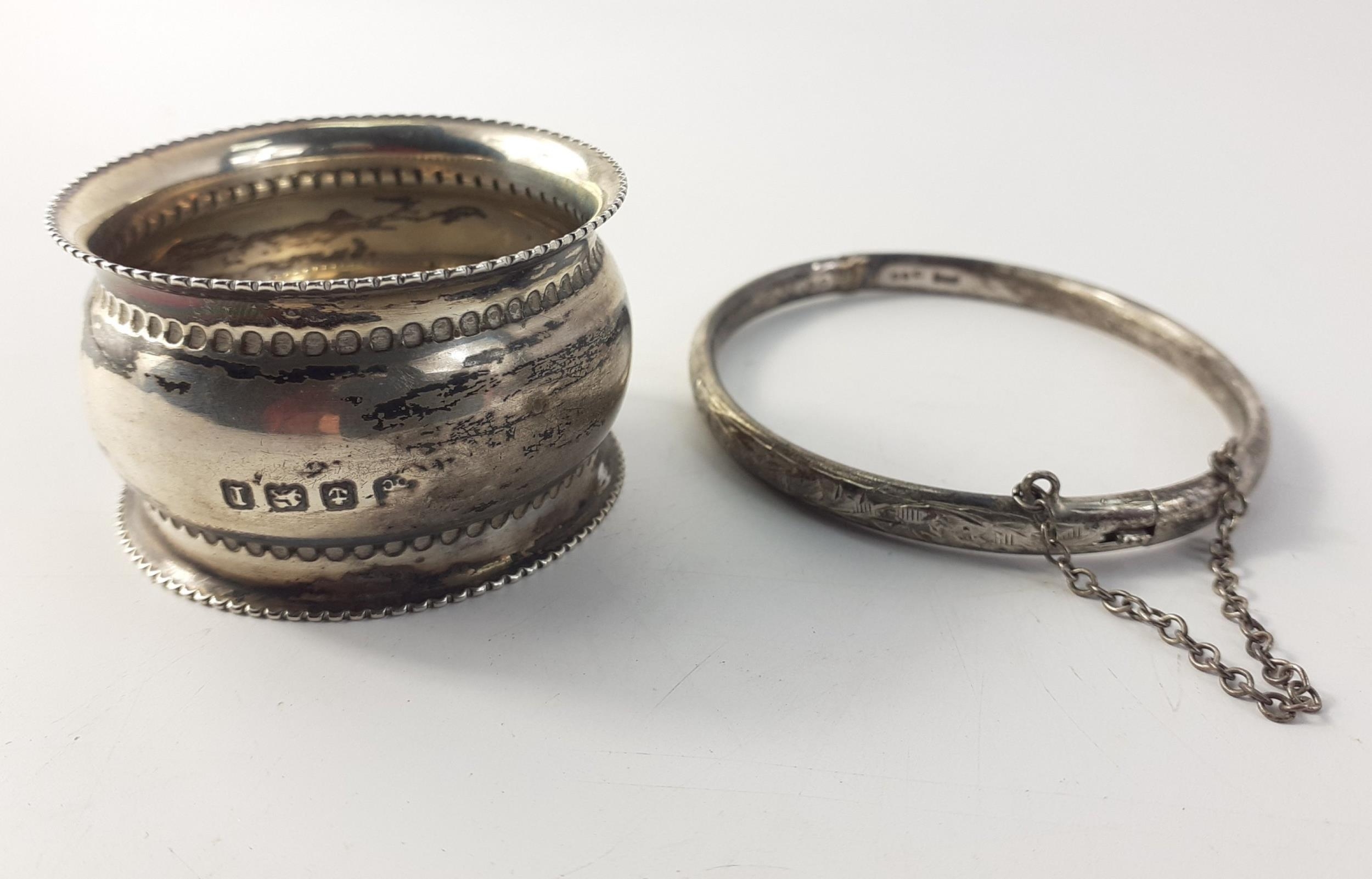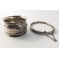 A silver hallmarked bangle with safety chain, (Chester? 1956) weight 7g approx, and a silver napkin ring hallmarked for Birmingham 1857 weight 19g approx