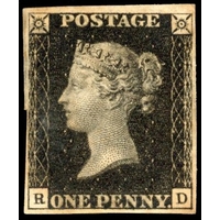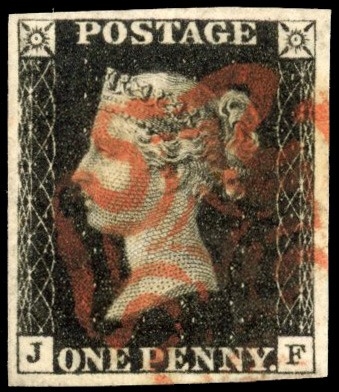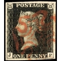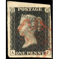 1840 1d intense black Plate 7 (JF) four close to good margins, cancelled by neat red MC, very fine. SG 1 cat £45