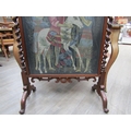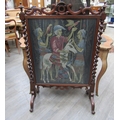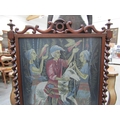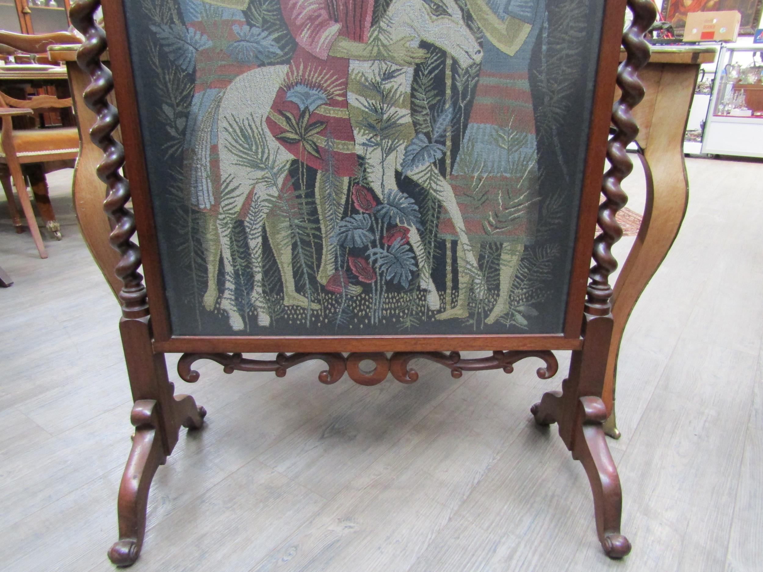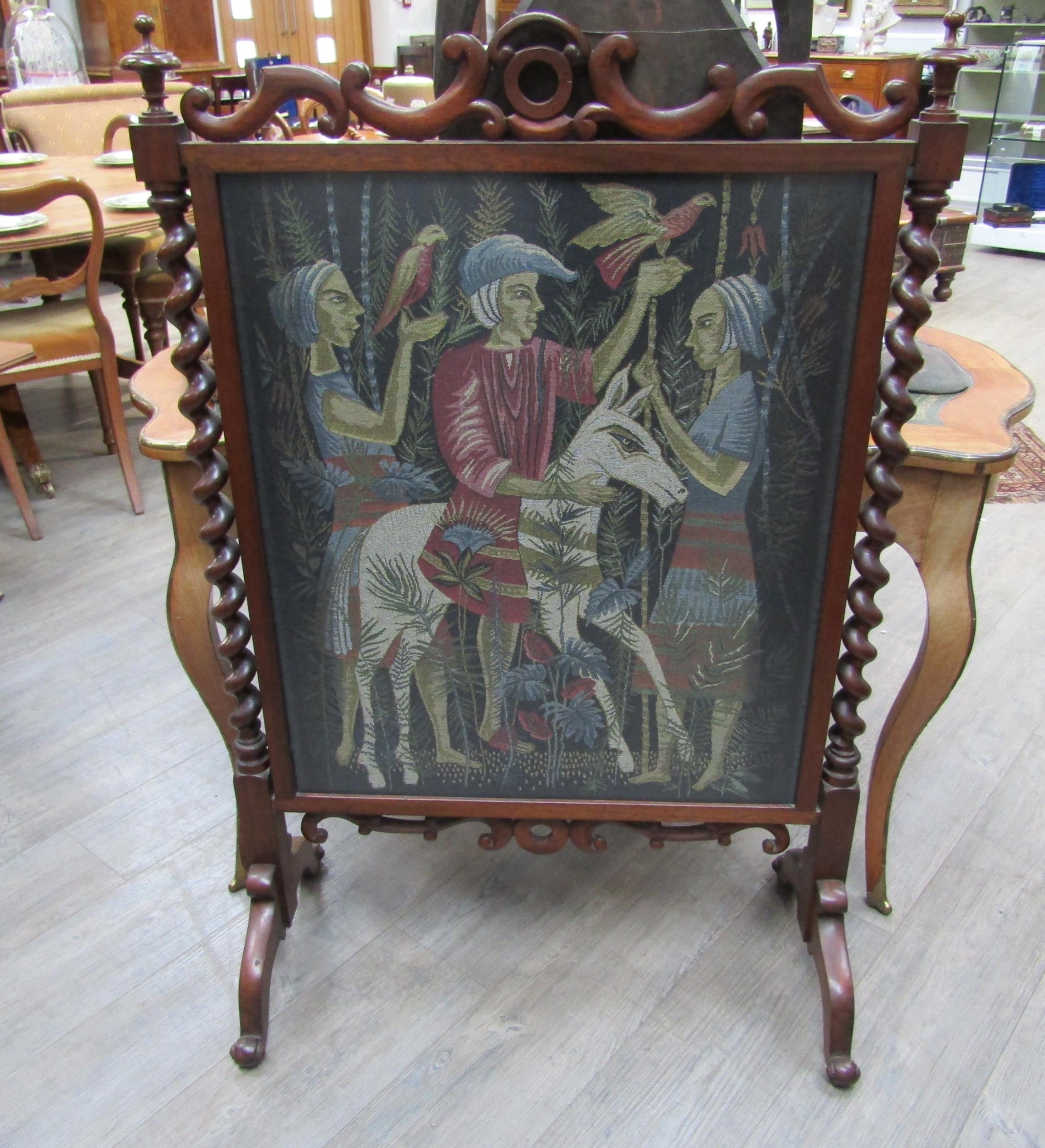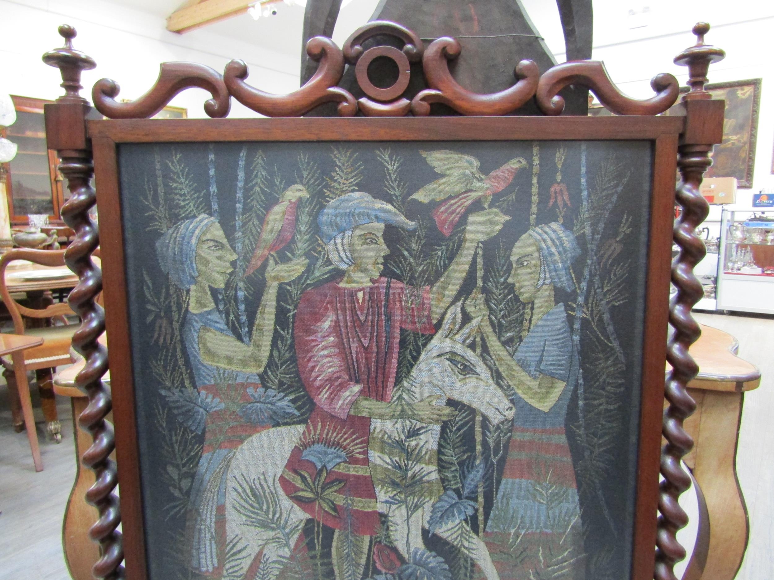 A rosewood fire screen with barley twist supports and finials on outswept feet, tapestry scene of figures surrounded by animals, 122cm x 81cm