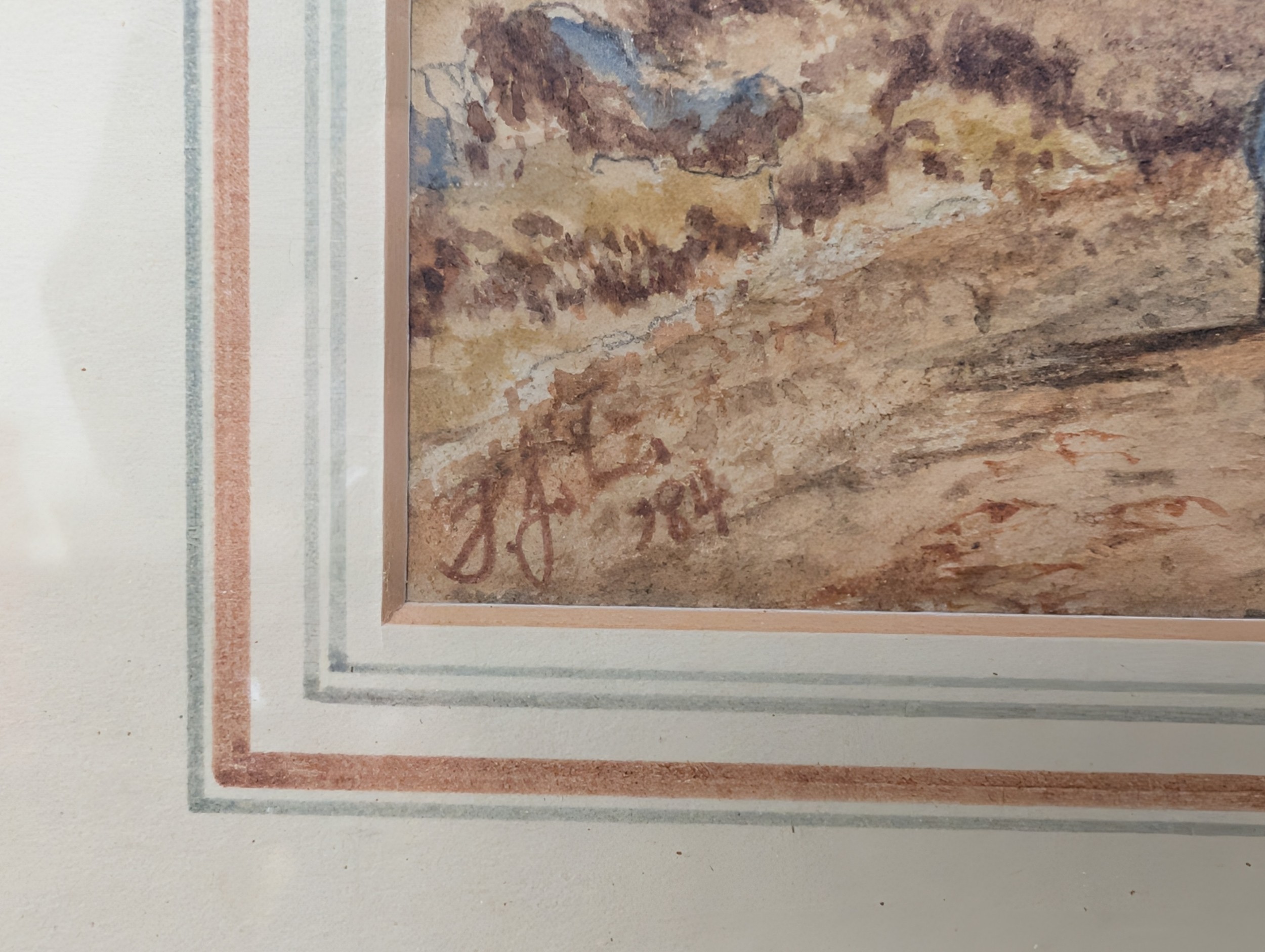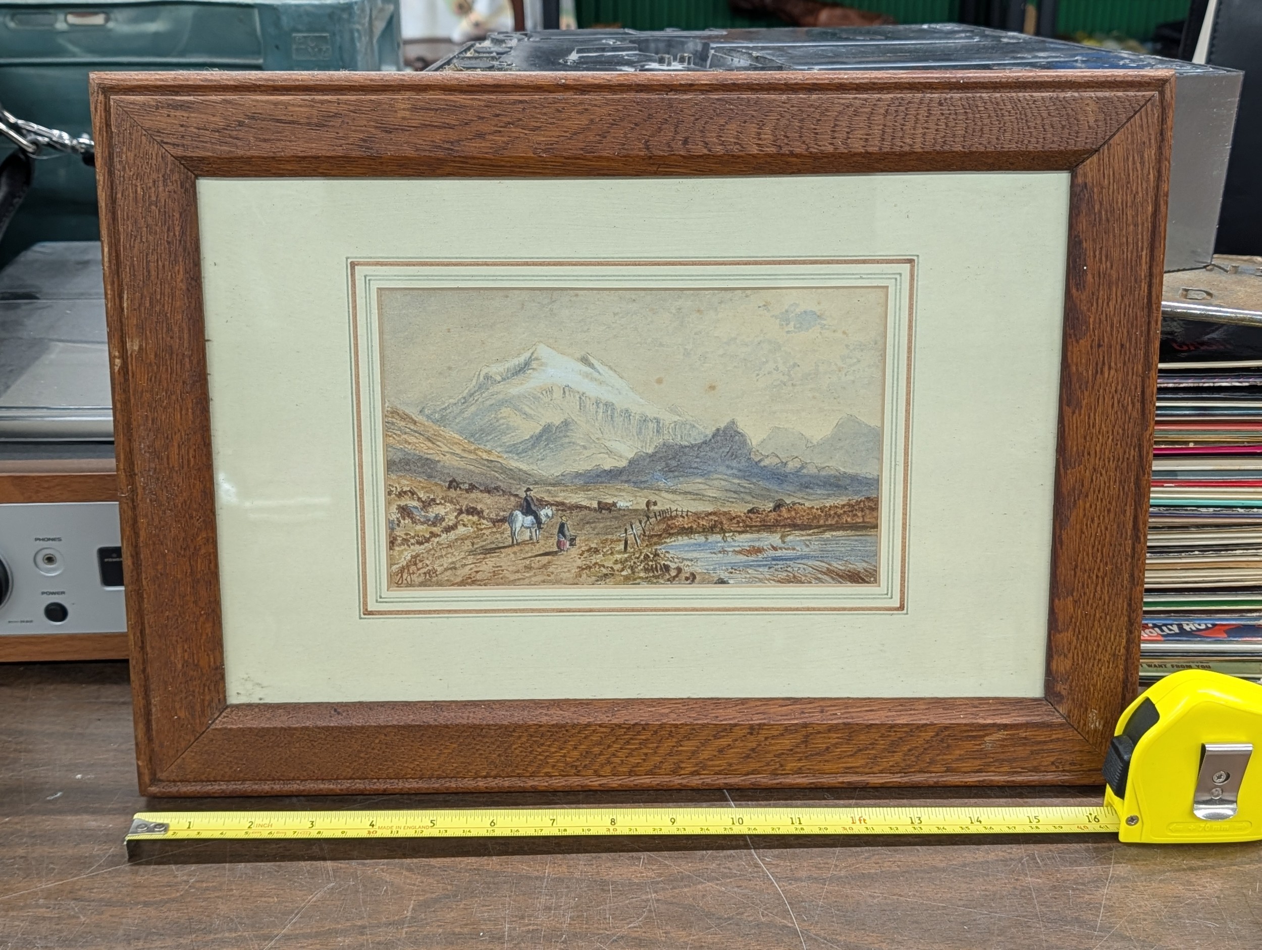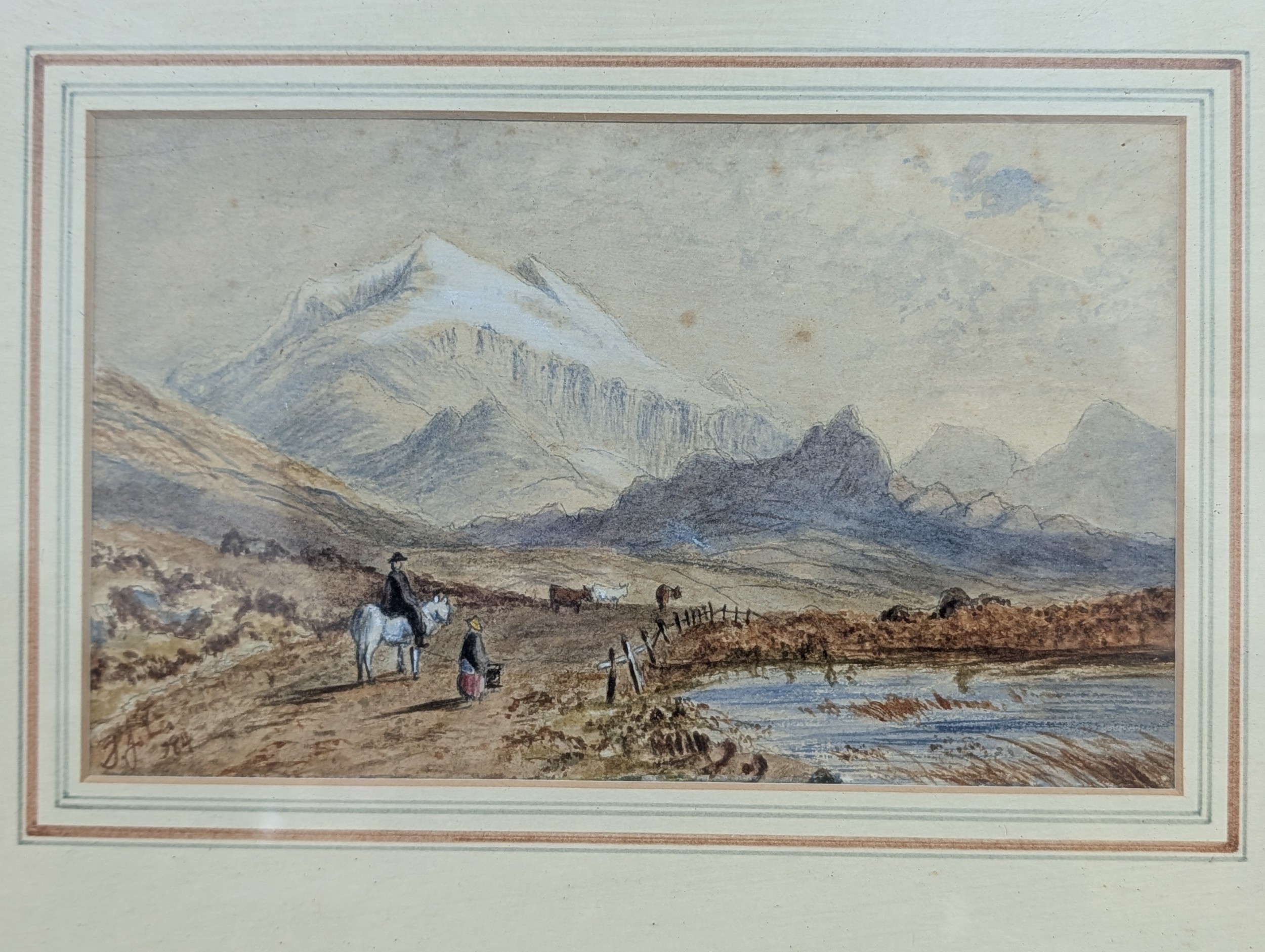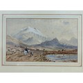 17.25 x 12.25" Framed & Mounted Mountain Landscape Water Colour with Figures, Signed (unable to recognise) and Dated 1884