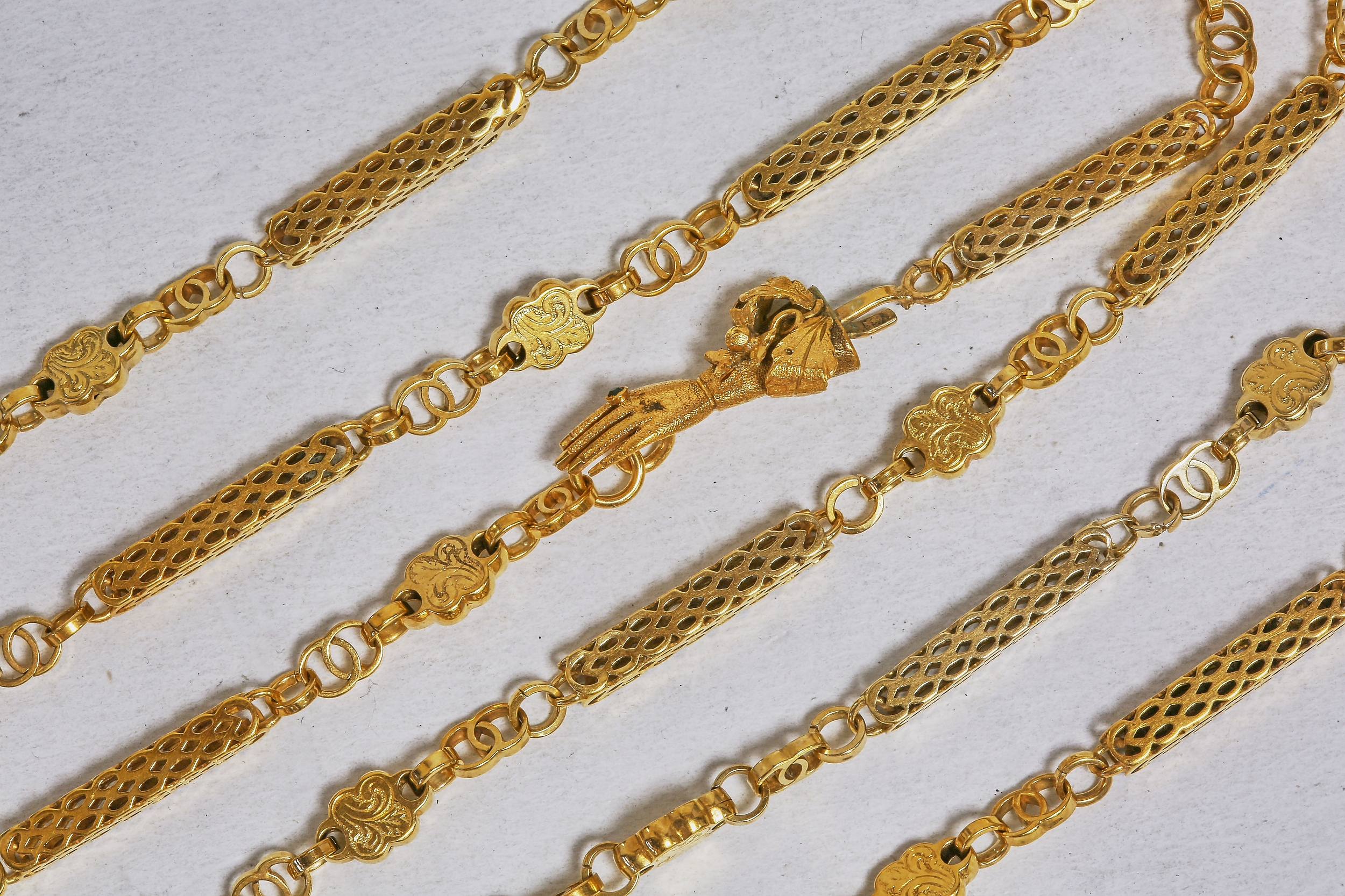 FANTASTIC GOLD VICTORIAN GUARD CHAIN WITH AN EMERALD HAND CLASP