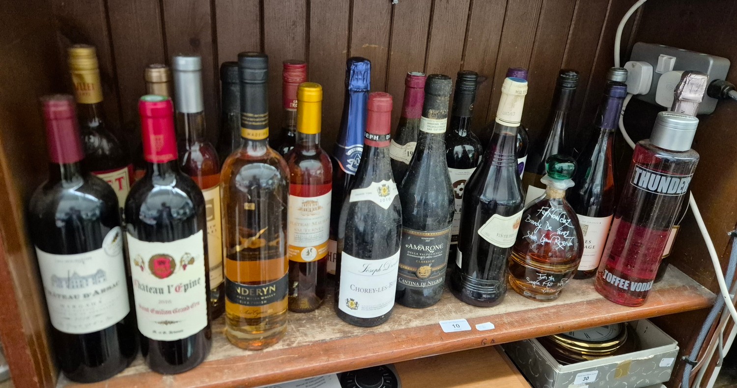 Approx 22 bottles of alcohol including brandy/Irish malt whisky in split bottle, Toffee Vodka, wine, Sauternes wine