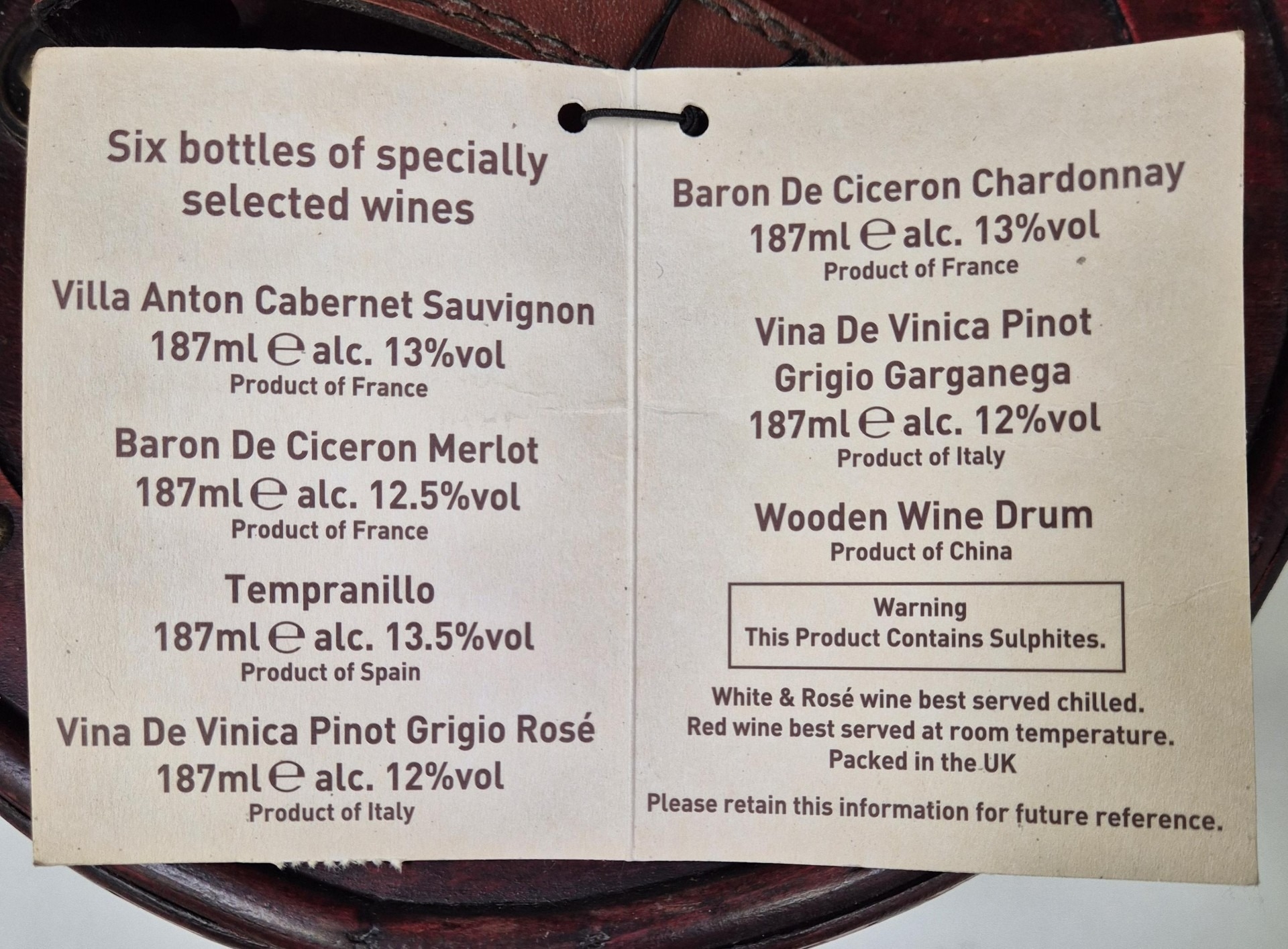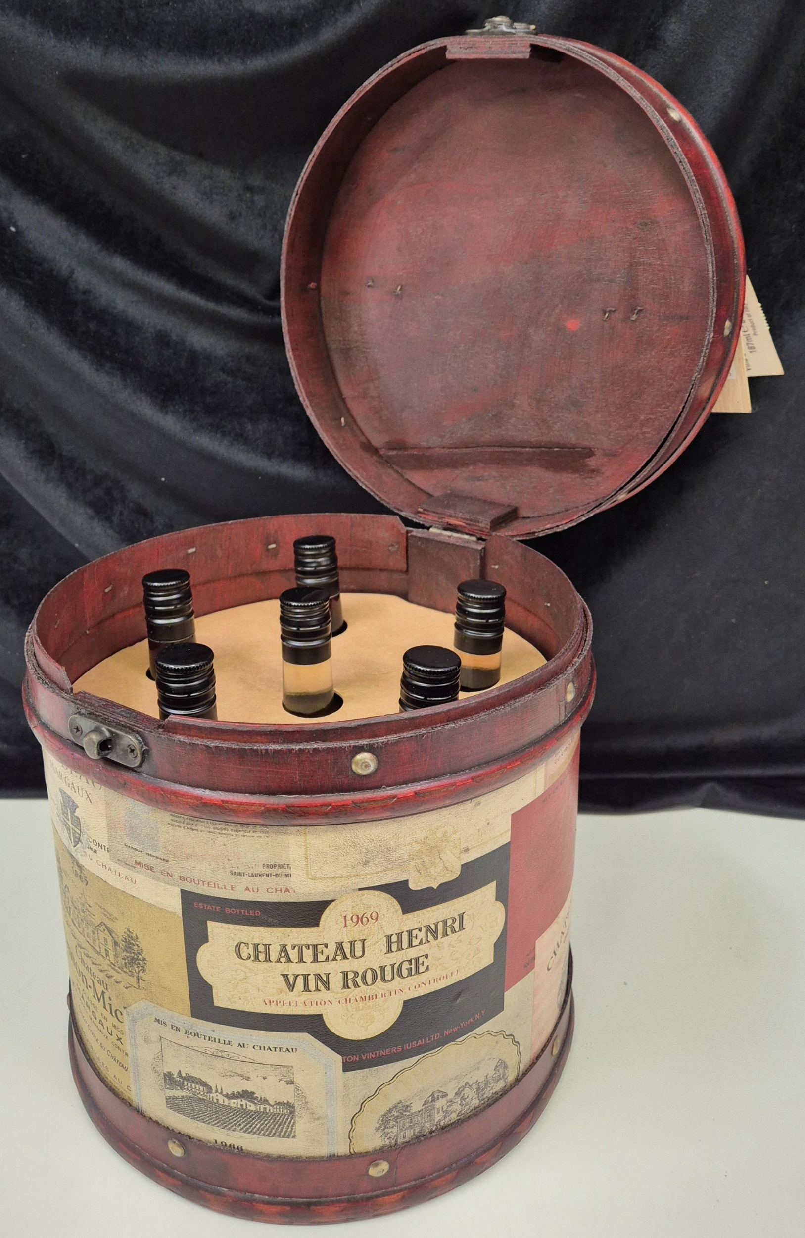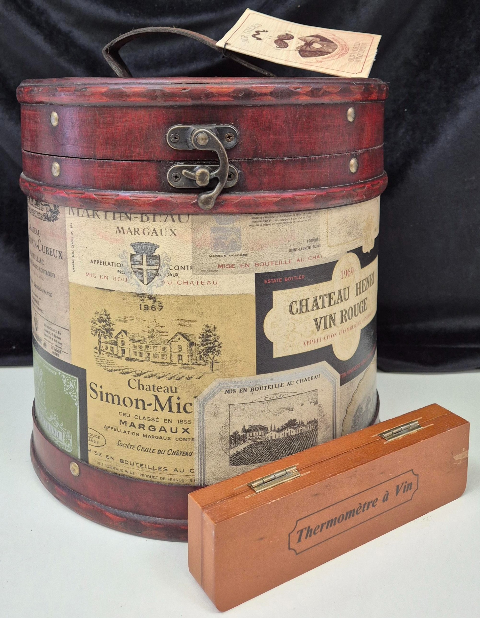 Mr Giles Old World Wine Drum gift set of 6 bottles of red wine (187ml), together with a vintage wine thermometer. ***Proof of age will be required before goods are released***.
