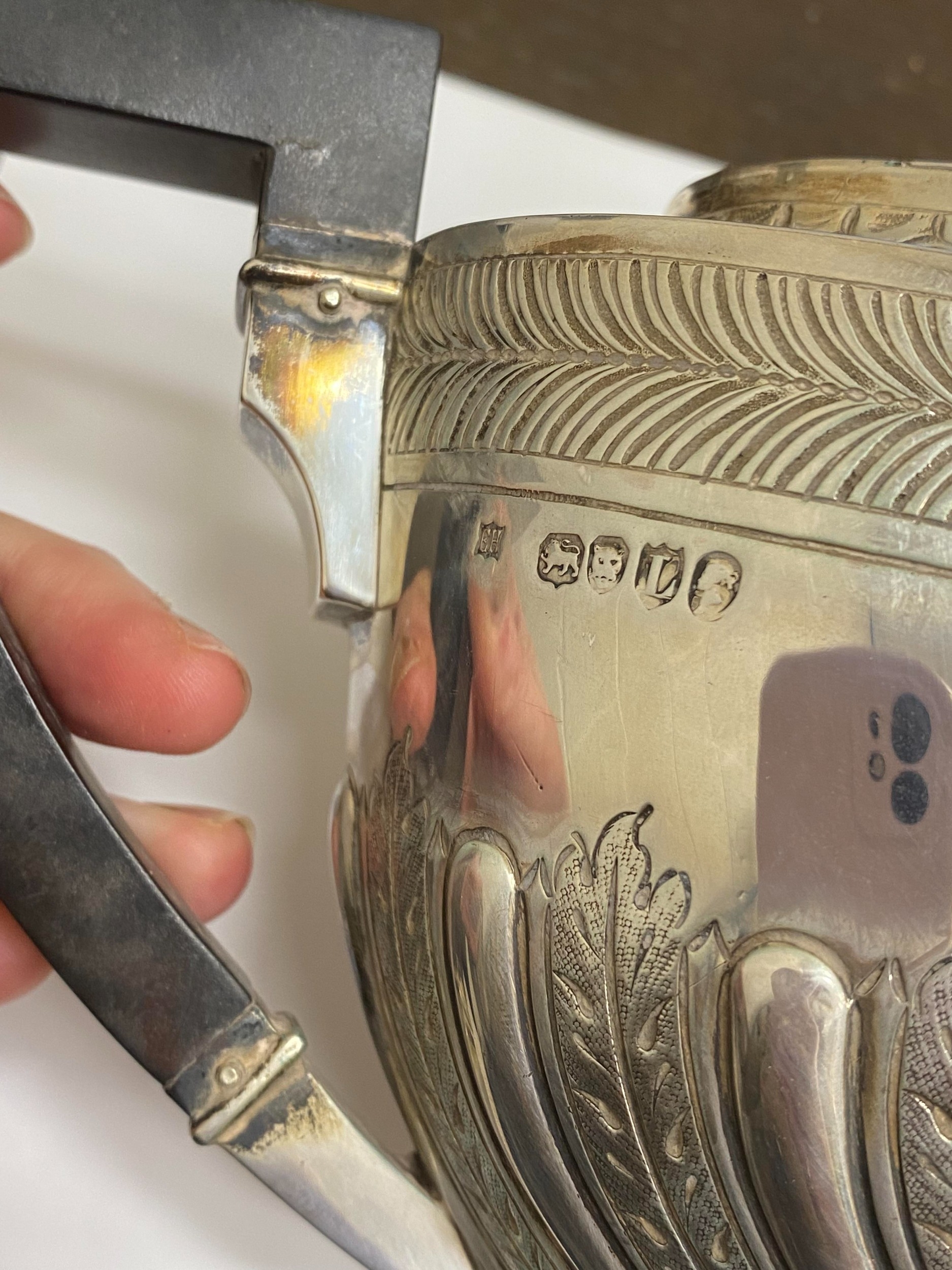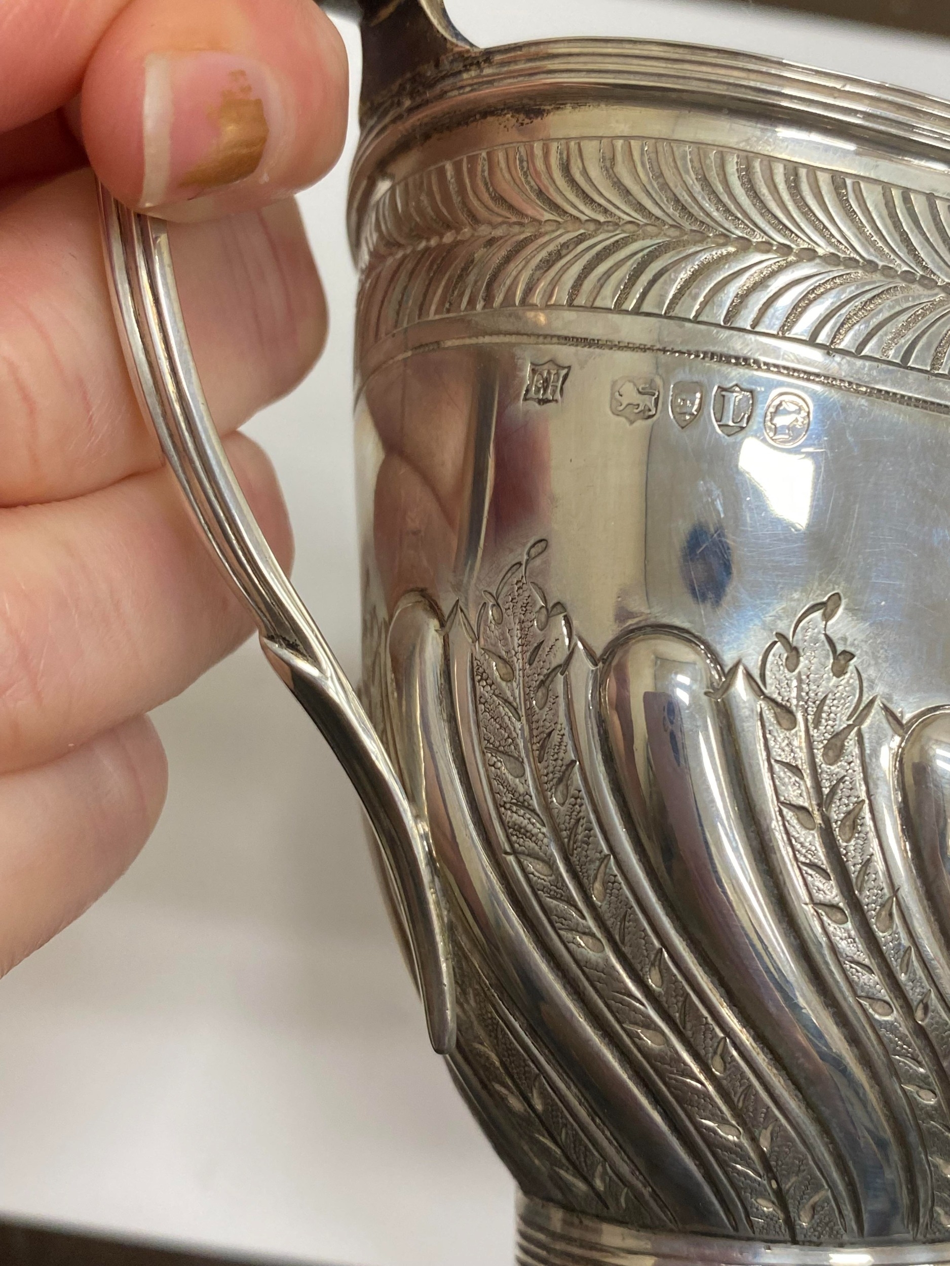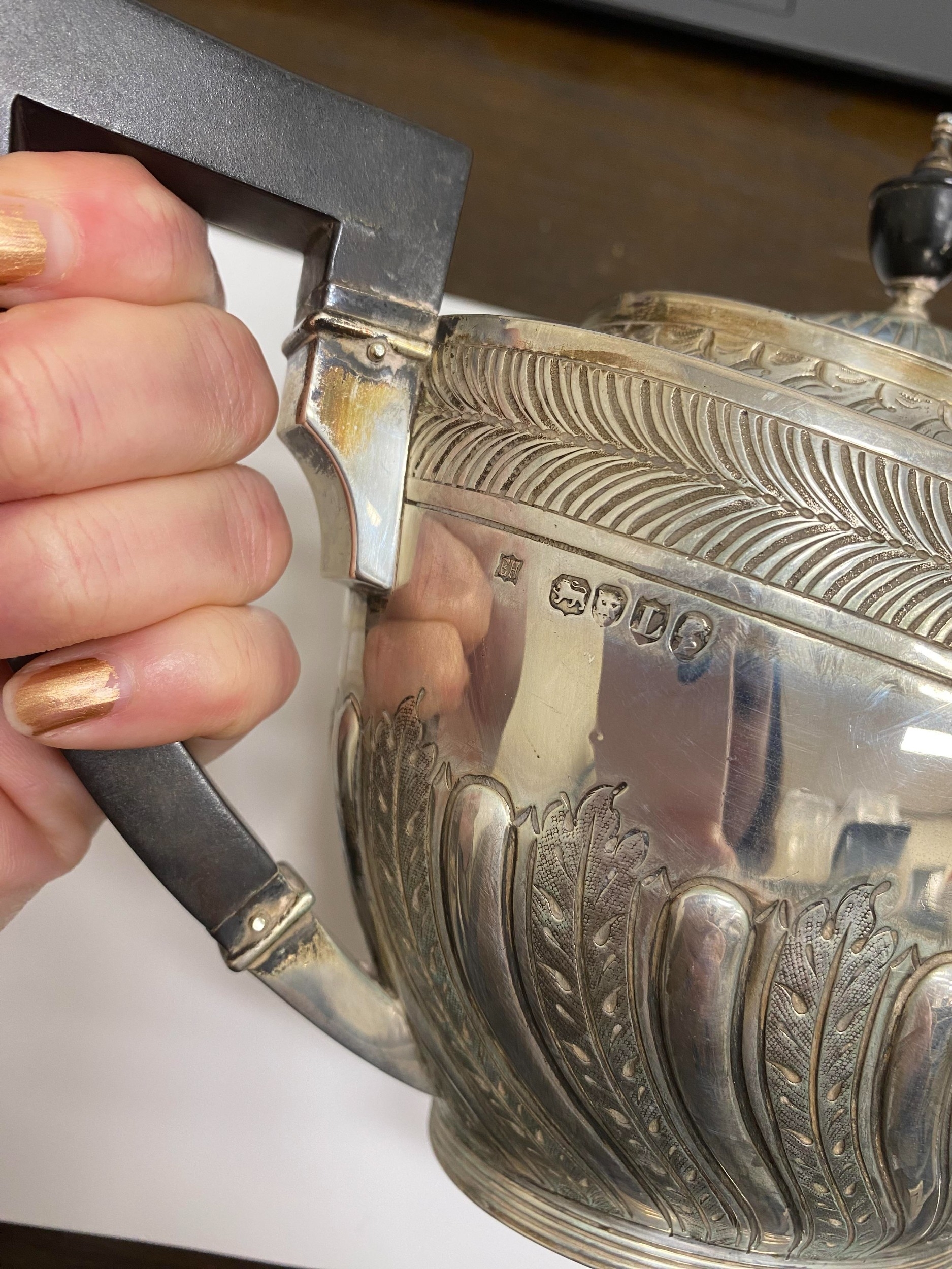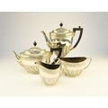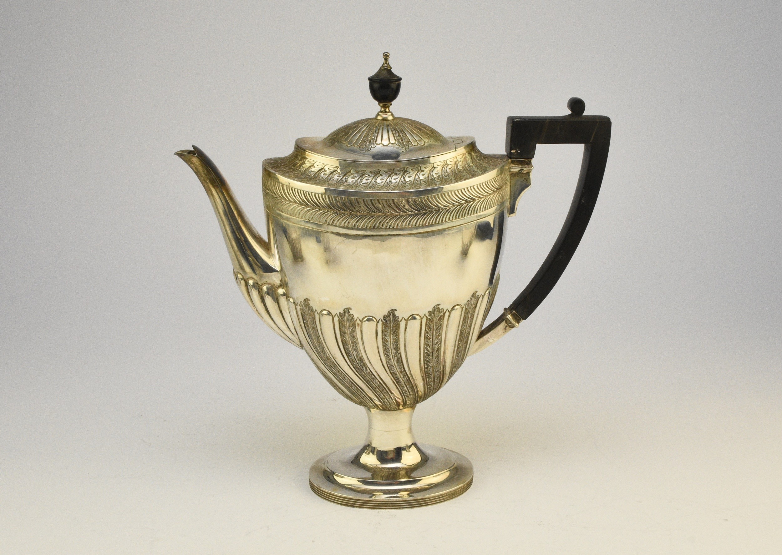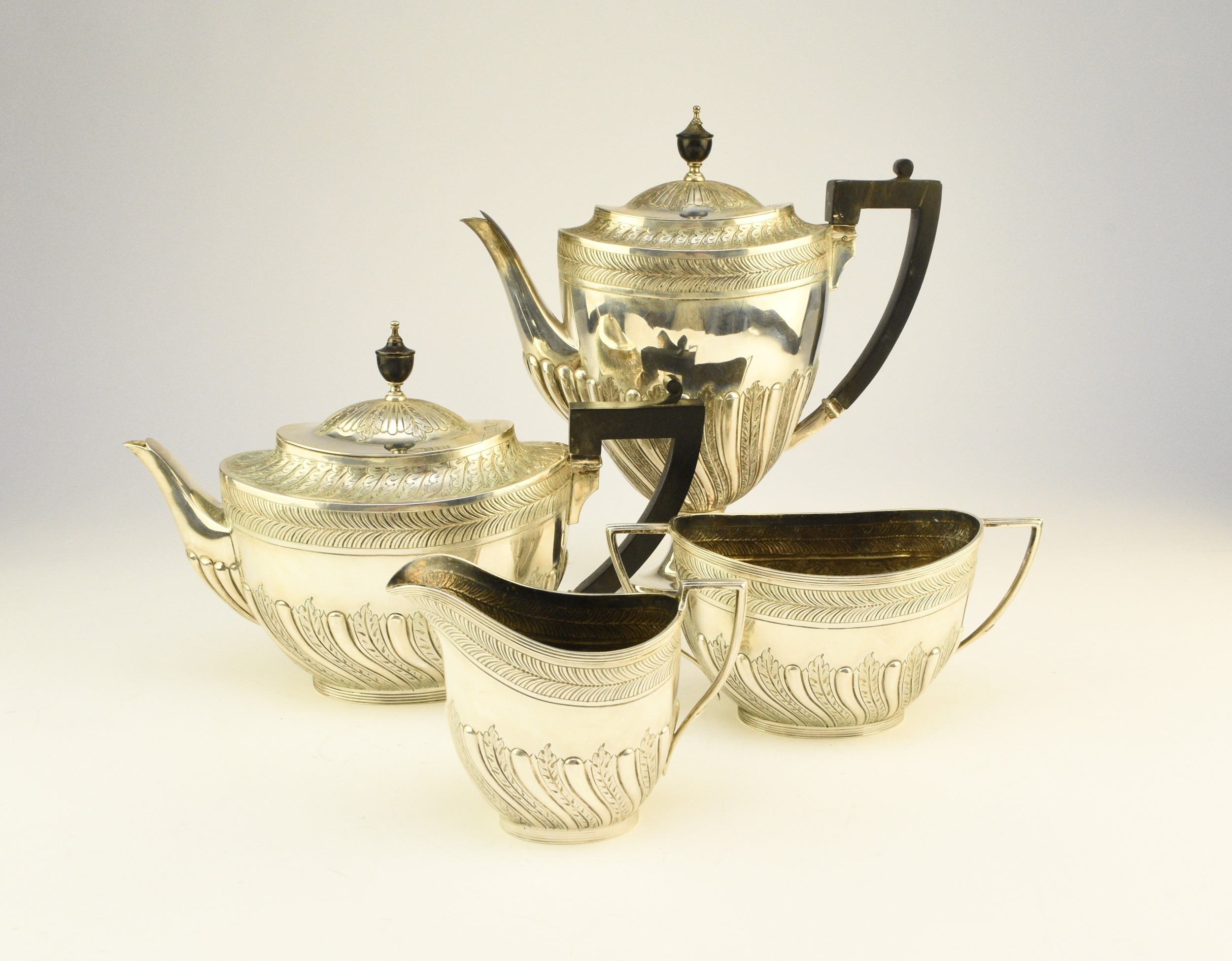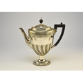 A Victorian four piece silver tea and coffee service, William Hutton & Sons, London 1886, each piece of oval form with embossed wrythn decoration, comprising; a teapot with ebonised handle and finial, 17cm high, a pedestal coffee pot with ebonised handle and finial, 27cm high, a two handled sugar bowl, 9cm high and a cream jug, 9cm high, total weight approx 49.7oz (4) Condition:All hallmarks match and a reasonably clear, general wear to all but no obvious significant visible damage, refer to images