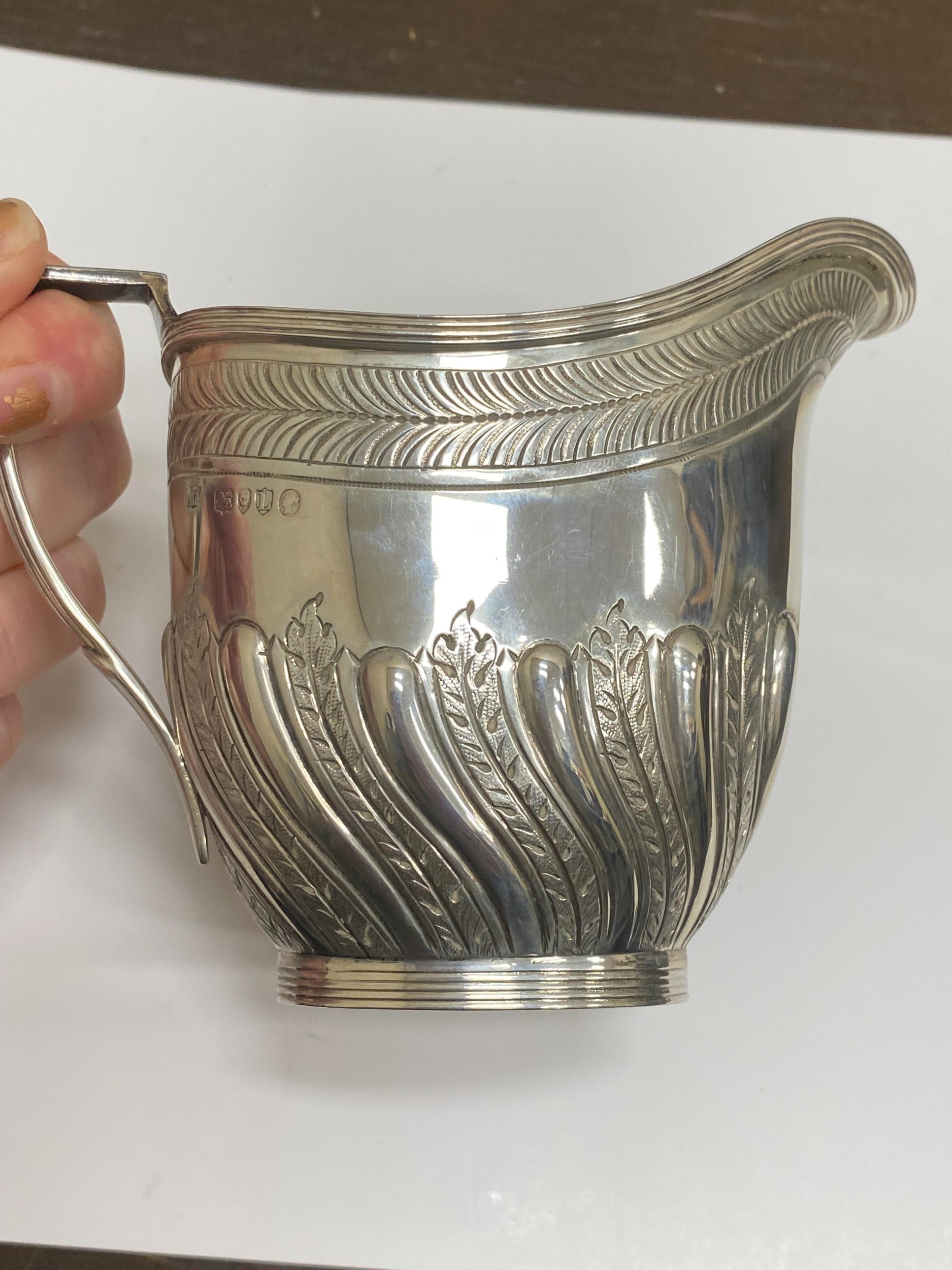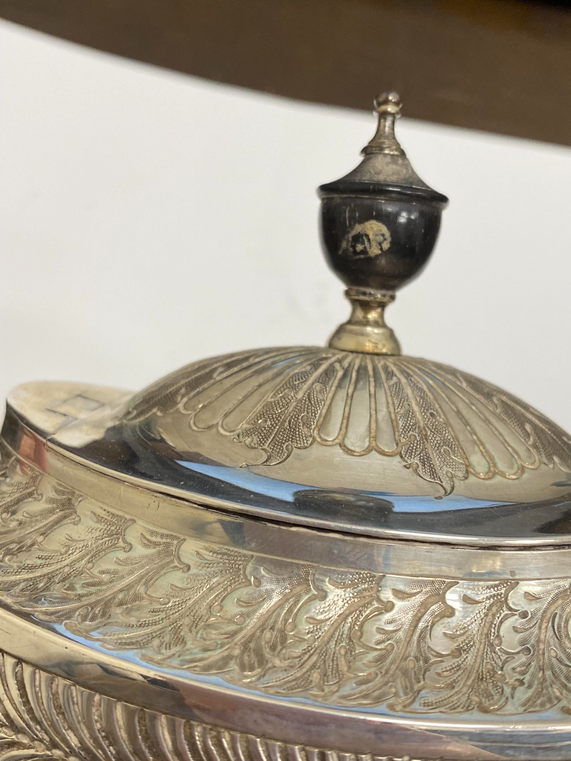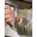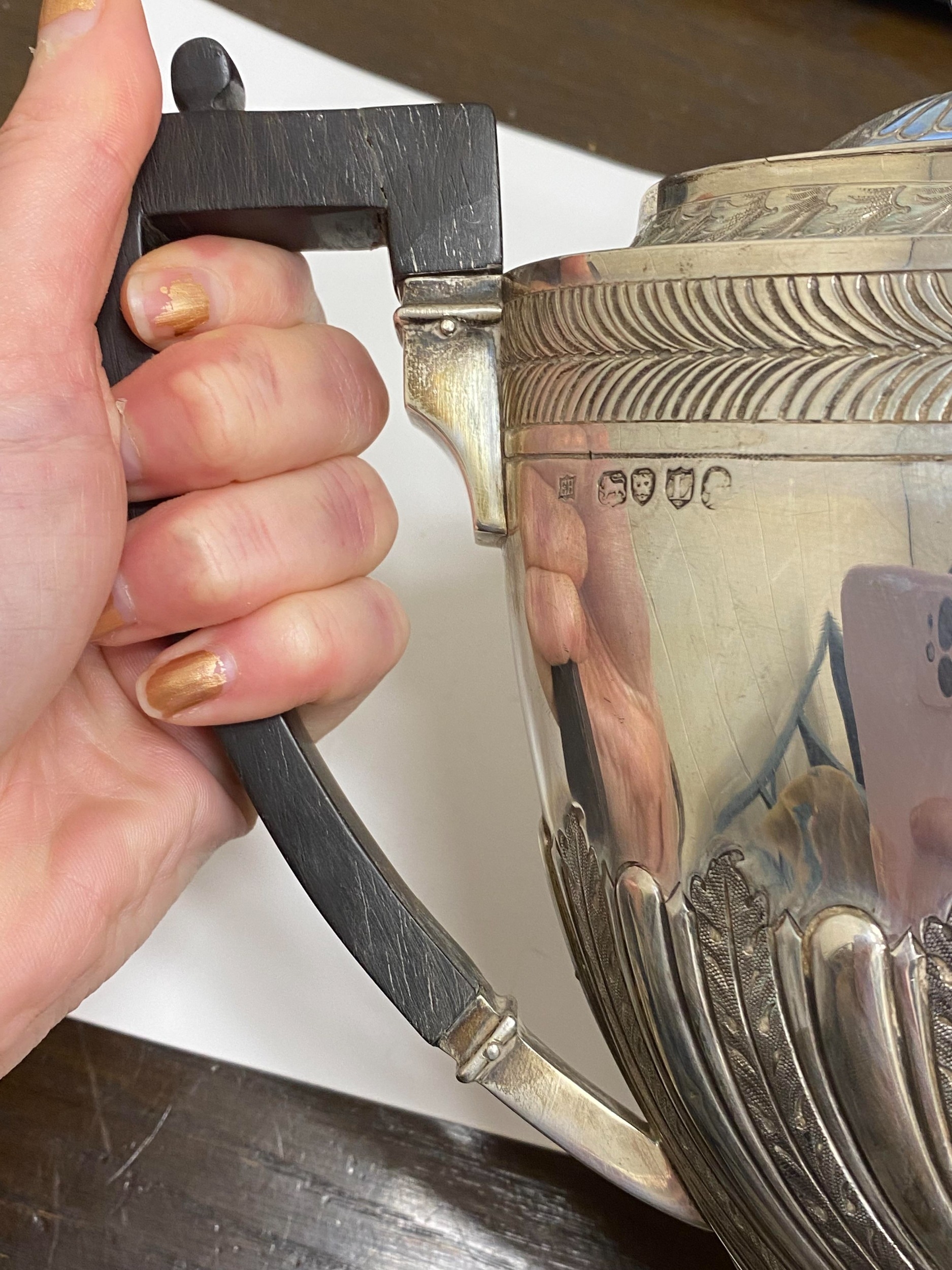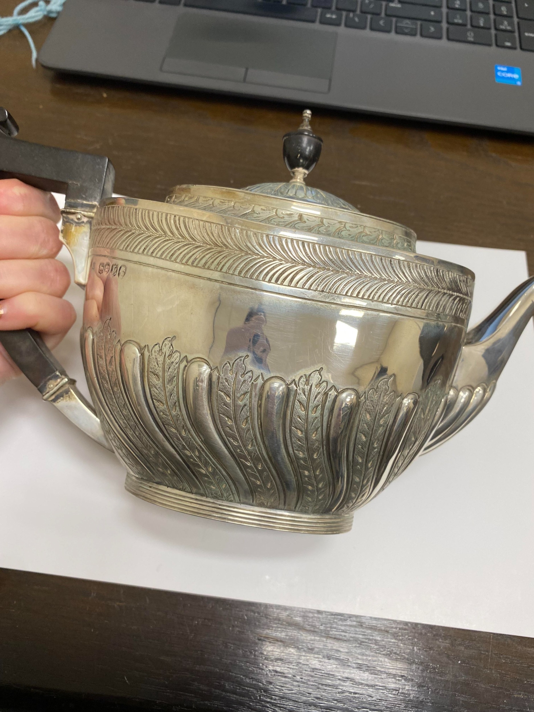 A Victorian four piece silver tea and coffee service, William Hutton & Sons, London 1886, each piece of oval form with embossed wrythn decoration, comprising; a teapot with ebonised handle and finial, 17cm high, a pedestal coffee pot with ebonised handle and finial, 27cm high, a two handled sugar bowl, 9cm high and a cream jug, 9cm high, total weight approx 49.7oz (4) Condition:All hallmarks match and a reasonably clear, general wear to all but no obvious significant visible damage, refer to images