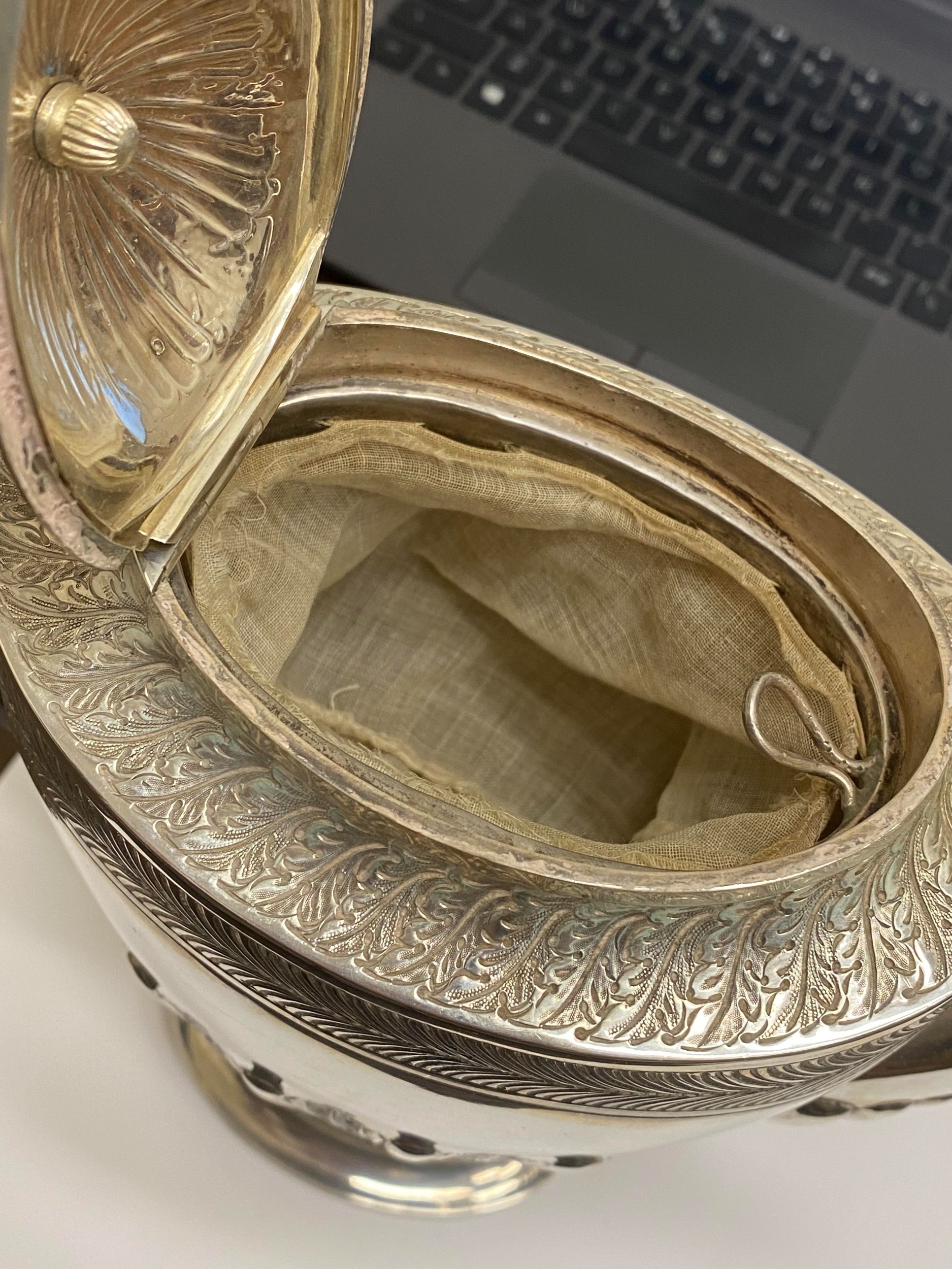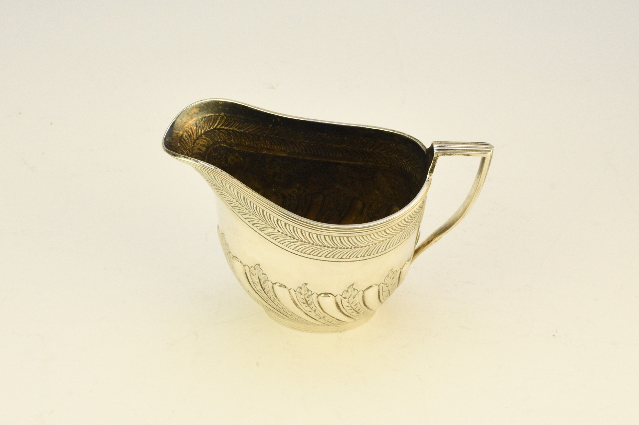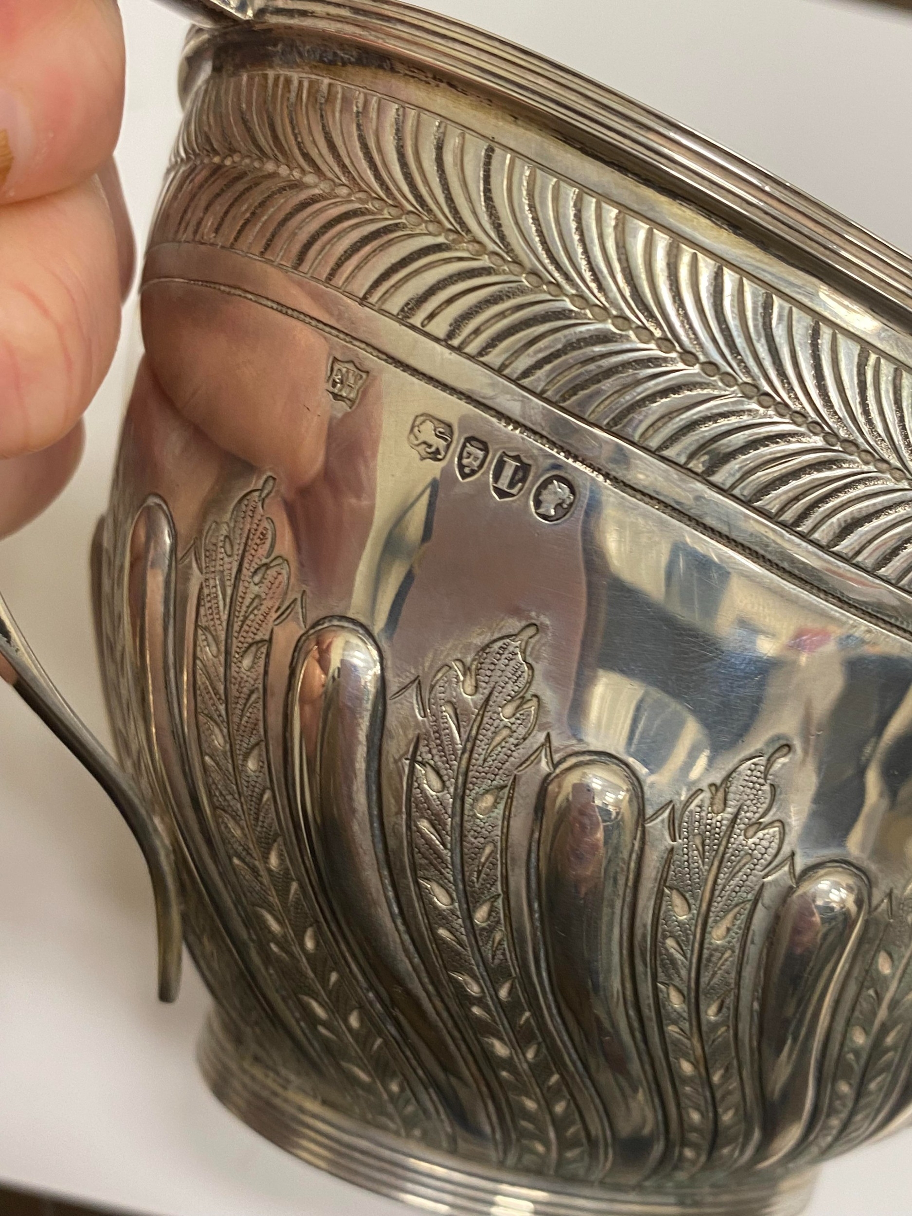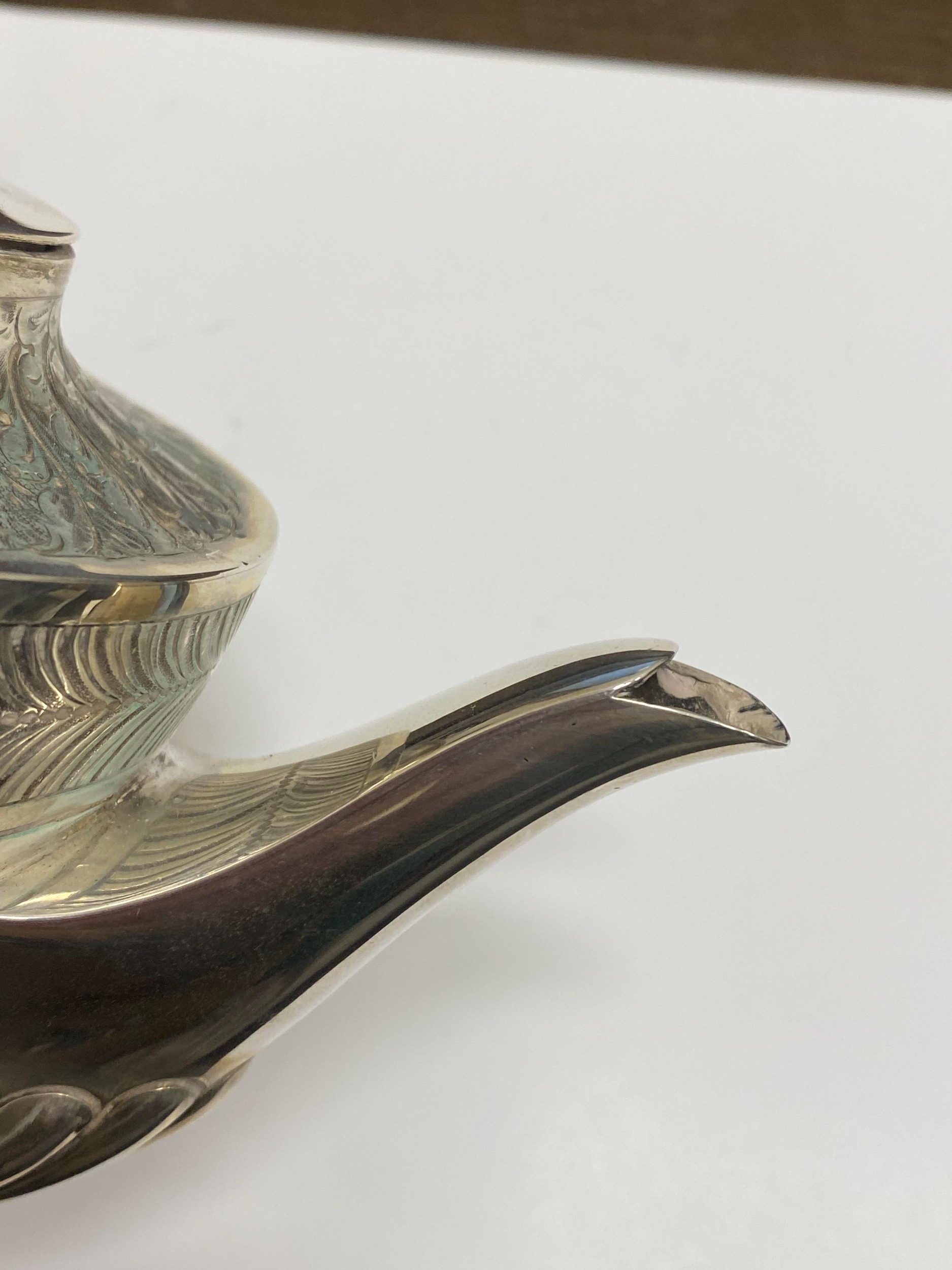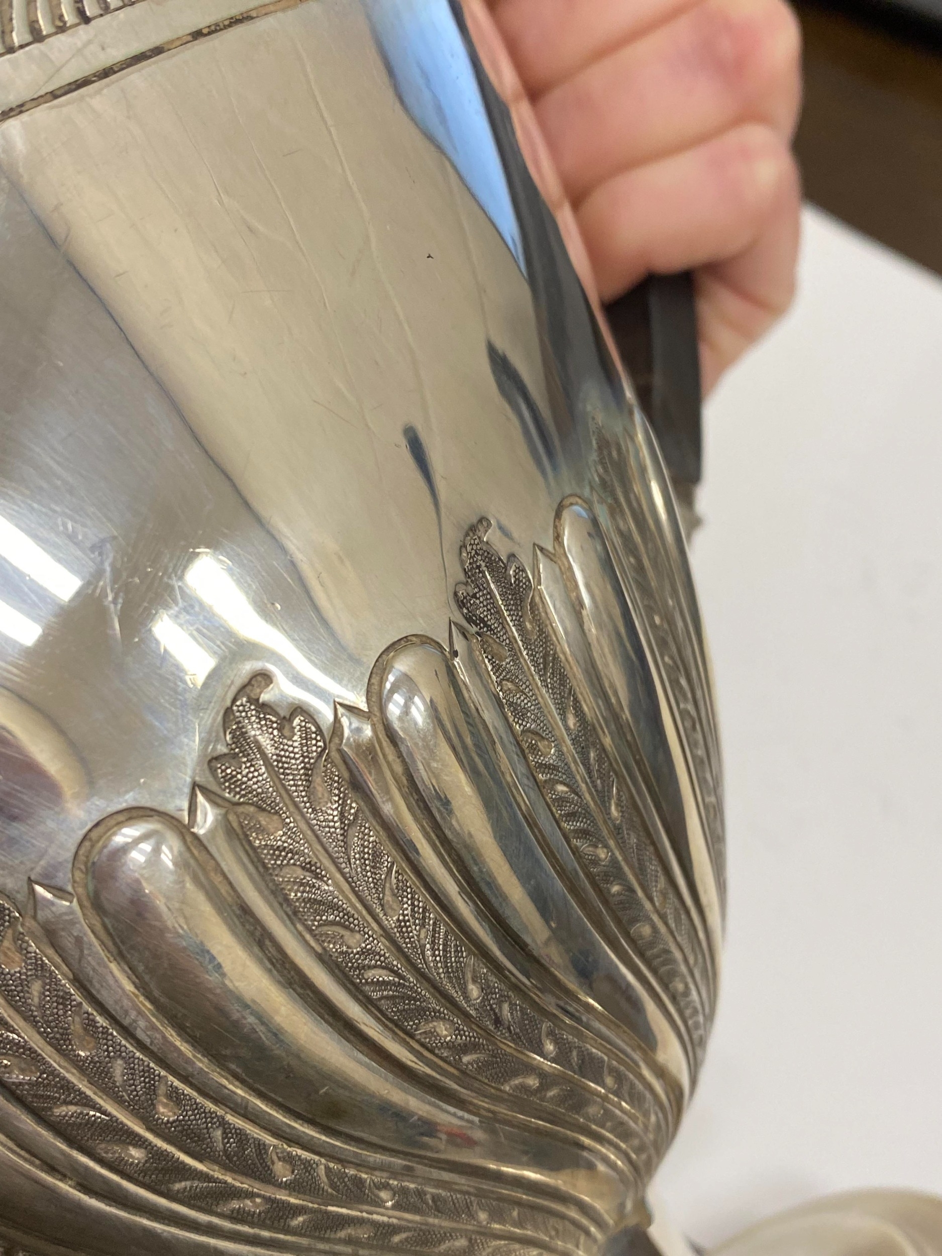 A Victorian four piece silver tea and coffee service, William Hutton & Sons, London 1886, each piece of oval form with embossed wrythn decoration, comprising; a teapot with ebonised handle and finial, 17cm high, a pedestal coffee pot with ebonised handle and finial, 27cm high, a two handled sugar bowl, 9cm high and a cream jug, 9cm high, total weight approx 49.7oz (4) Condition:All hallmarks match and a reasonably clear, general wear to all but no obvious significant visible damage, refer to images