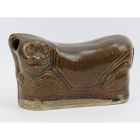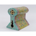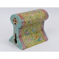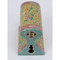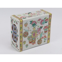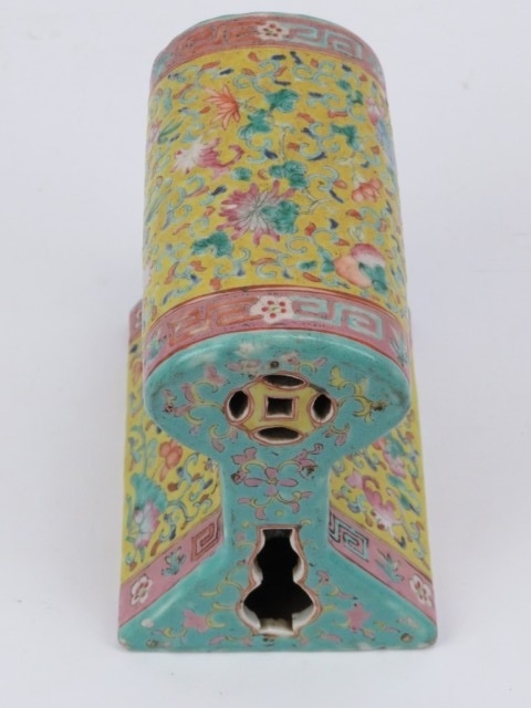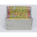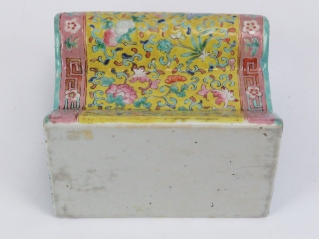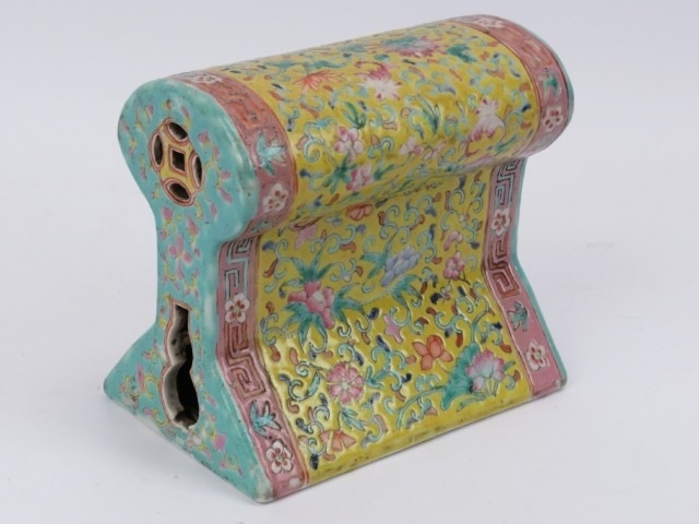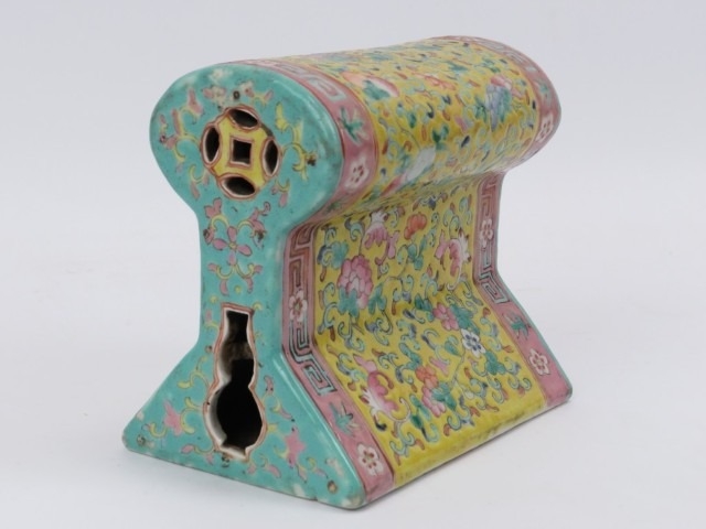 A rare Chinese famille rose polychrome enamelled porcelain brick pillow of keyhole form, 19th century. With double gourd and coin pierced end sections. 14.8 cm length.
