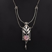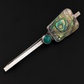 A 1920s George Edward Hunt Arts and Crafts white metal, abalone and chrysoprase brooch, long white metal bar mount set with colourful abalone, also decorated with a circular green chrysoprase cabochon, with 'GH' maker's mark, length 10cm, total weight 16g. (LDC15449)