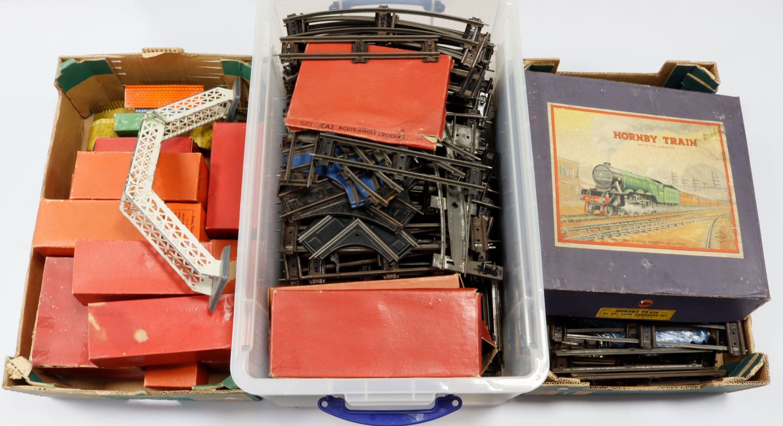 Hornby. A collection of Hornby O gauge railway items, including signals, bridge, station, track etc. (some boxed), plus an empty 101 Tank Passenger set box