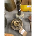 A metal industrial type candlestick made from cogs together with a model serpentine lighthouse