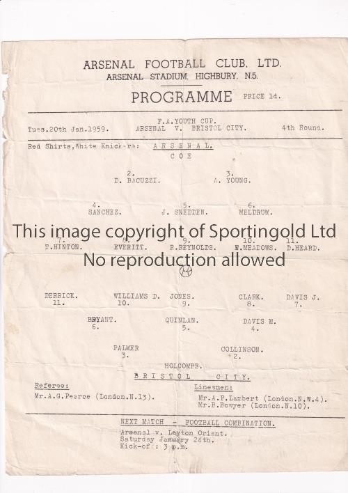 ARSENAL Single sheet programme for the home FA Youth Cup tie v Bristol City 20/1/1959, folded in four with minor tears and wear on the edges. Generally good