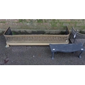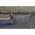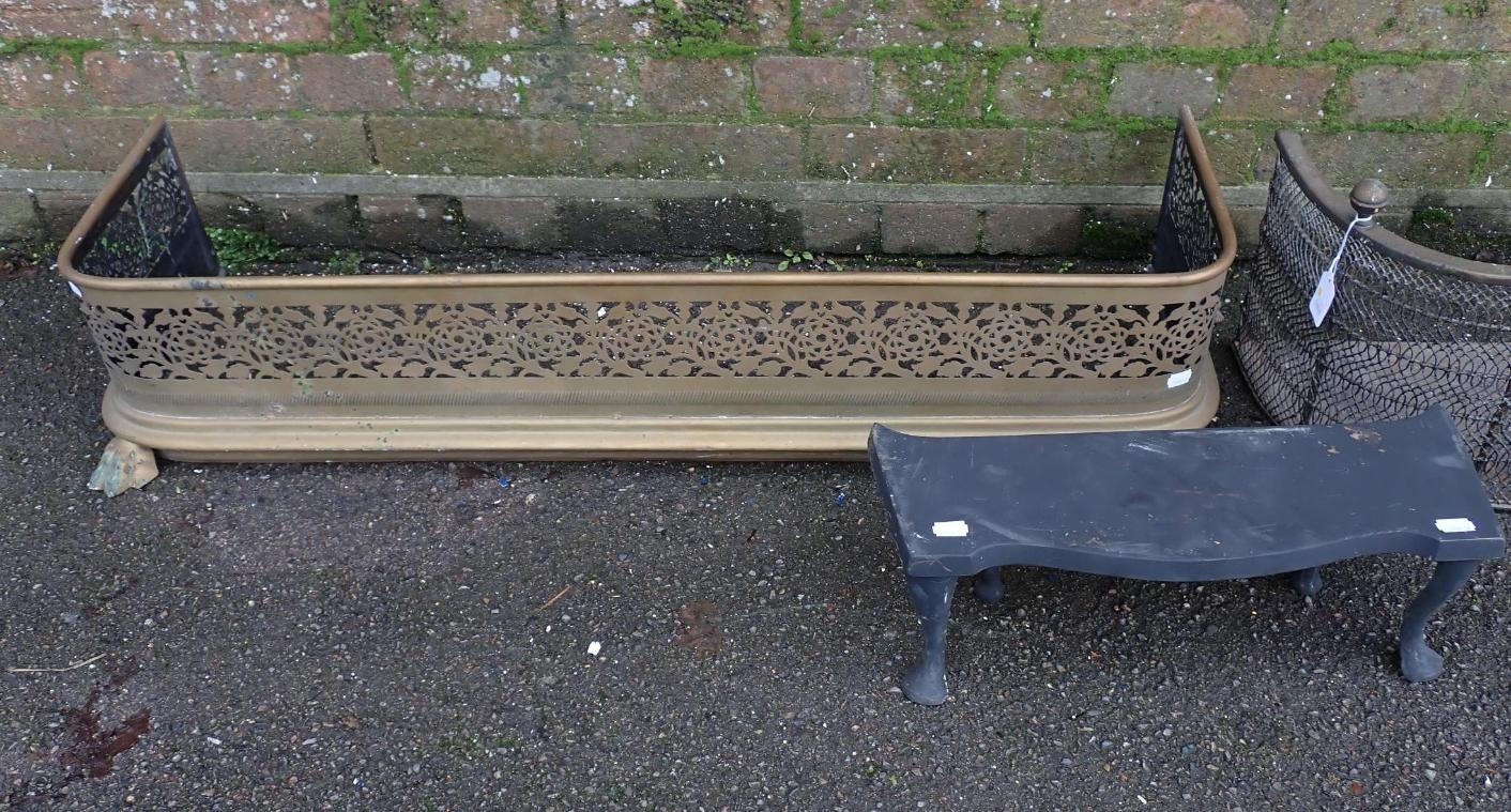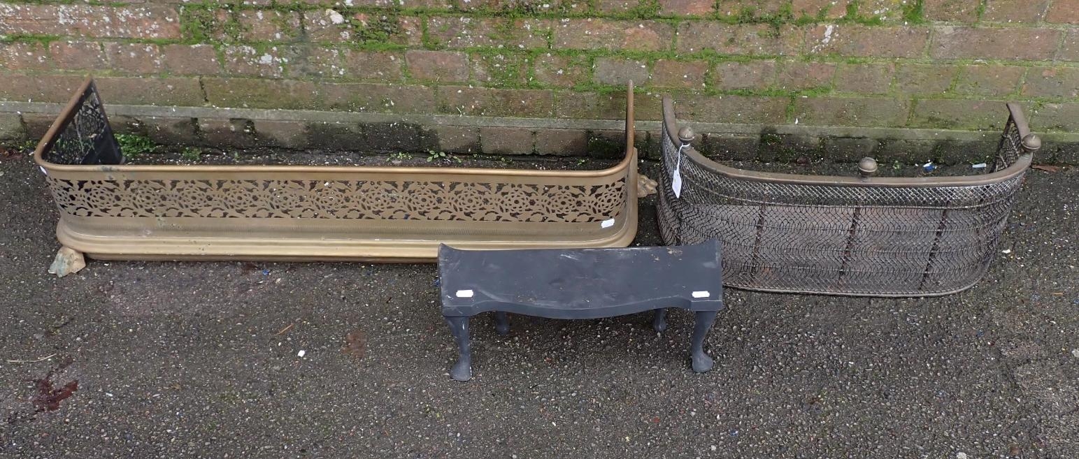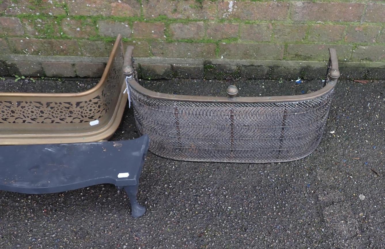 A SMALL EARLY 19th CENTURY BRASS AND WIRE FENDER61cm wide, a larger pierced brass fender, 104cm wide, and a cast iron trivet (3)