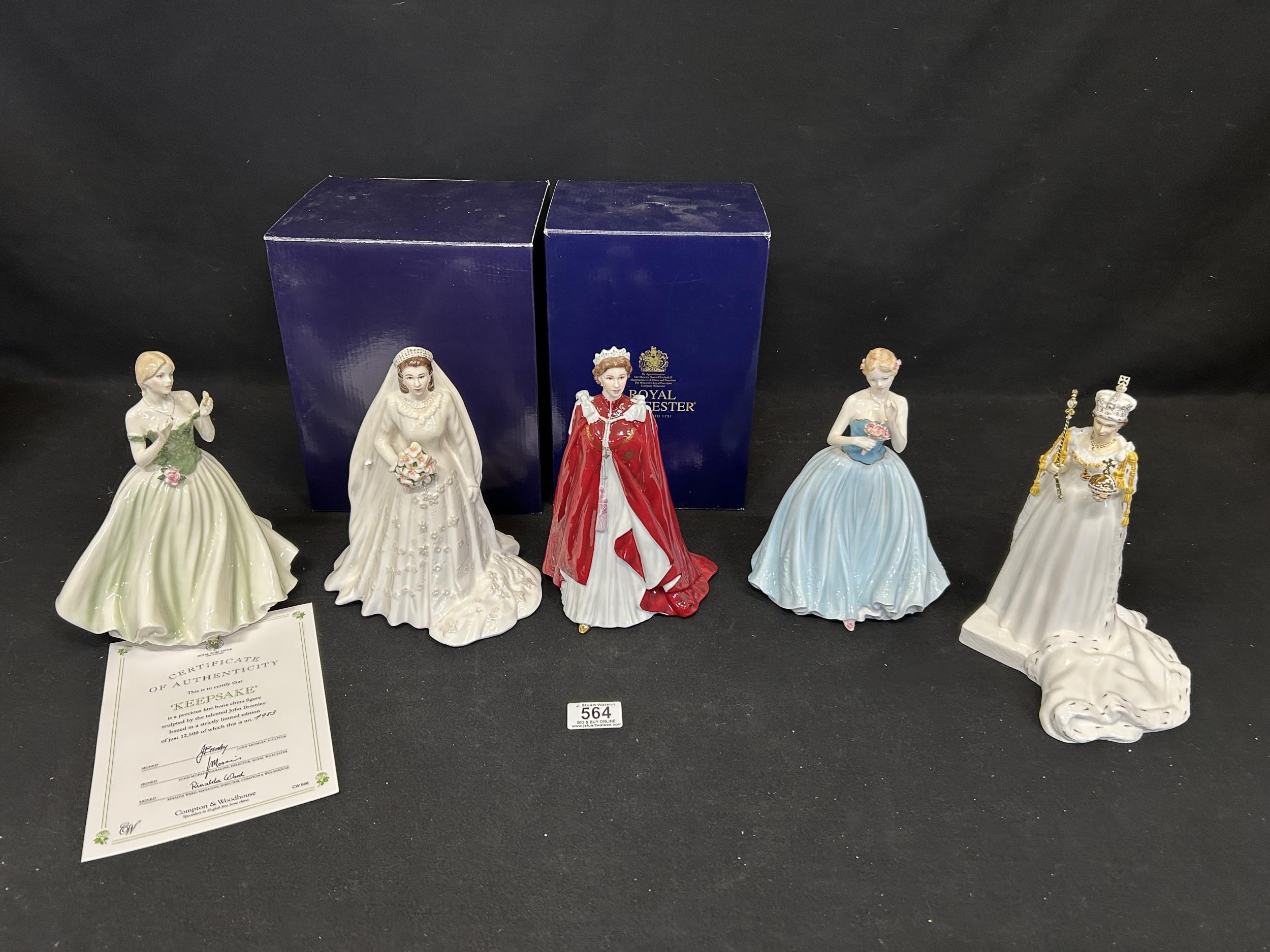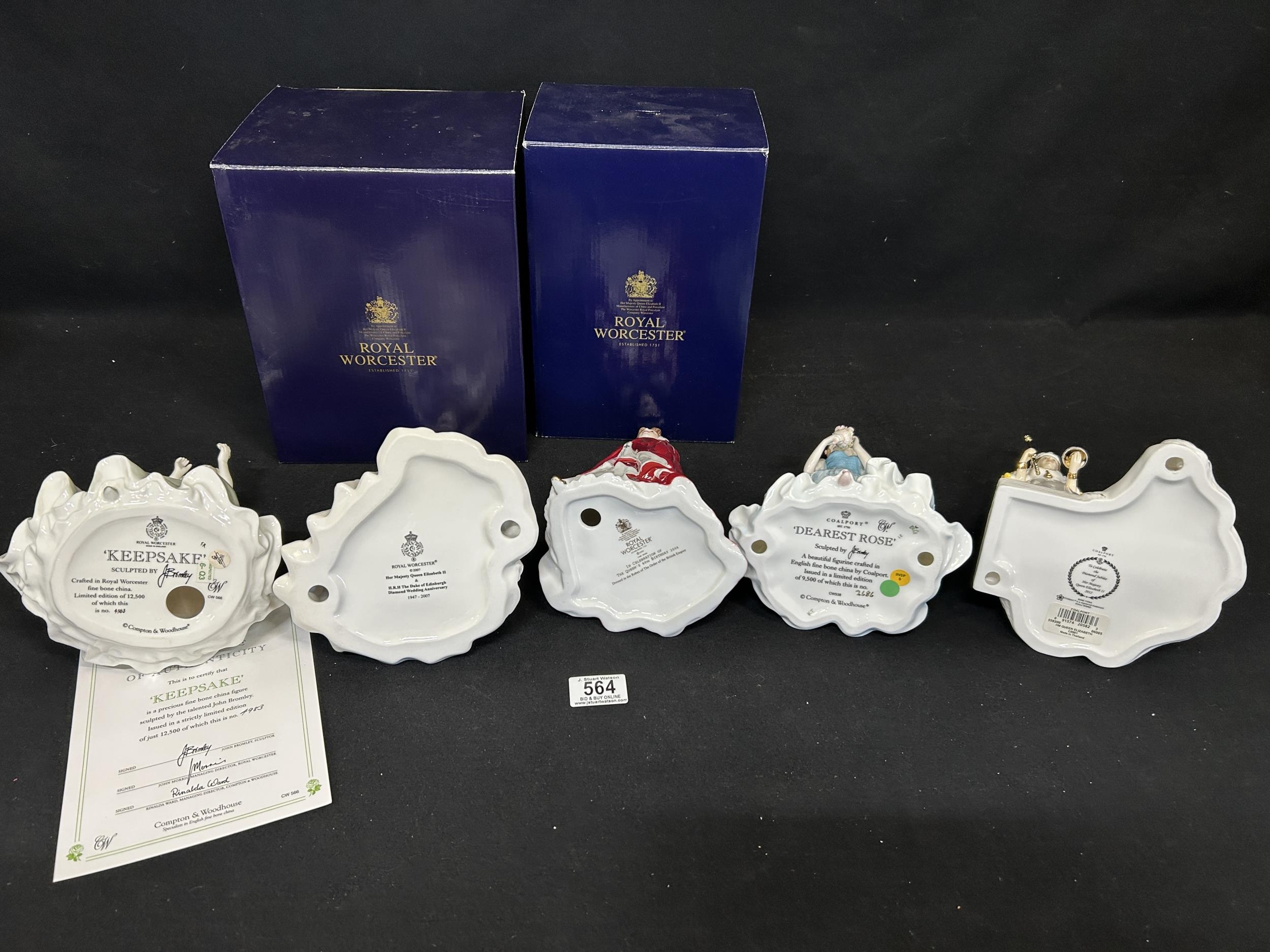 3 Royal Worcester figures, plus 2 Coalport figures, tallest 23 cms. 4 boxed (5)