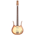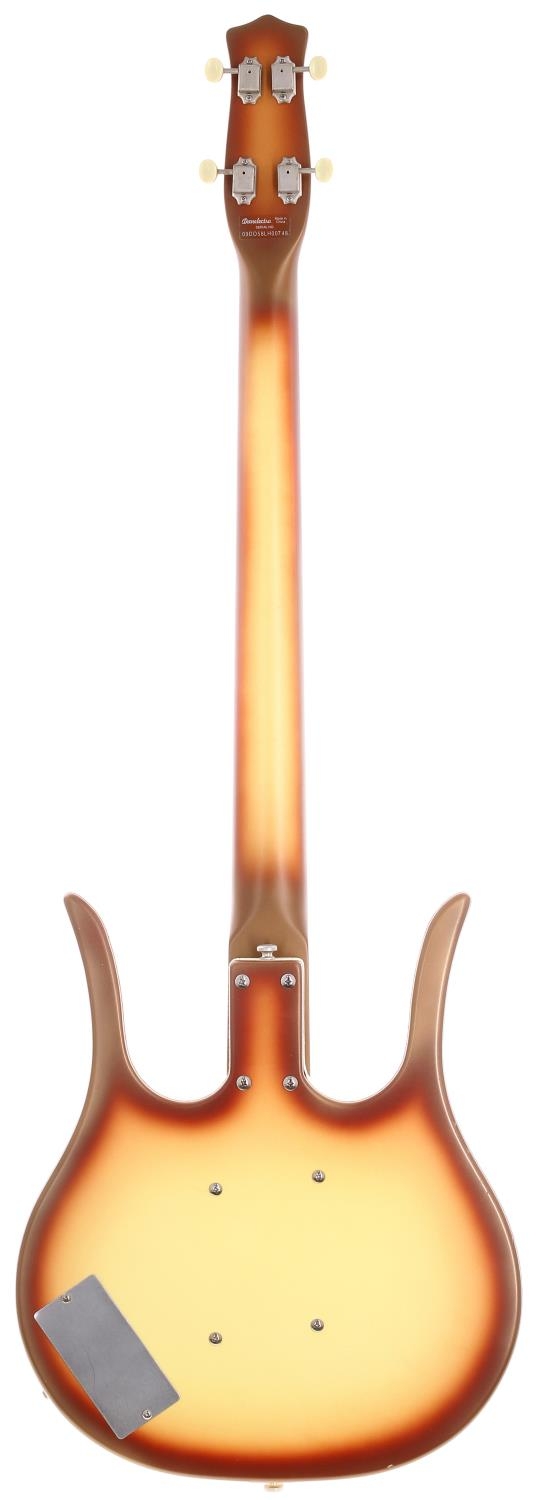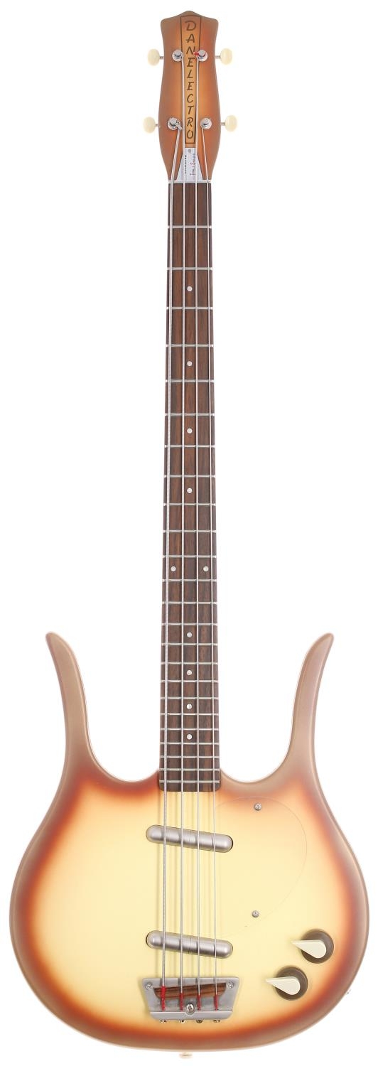 Danelectro Longhorn four string bass guitar, made in China; Body: coral burst finish, small dings to edges; Neck: good; Fretboard: rosewood; Frets: good; Electrics: working; Hardware: good; Case: oblong hard case; Overall condition: good
