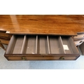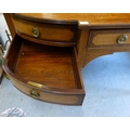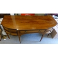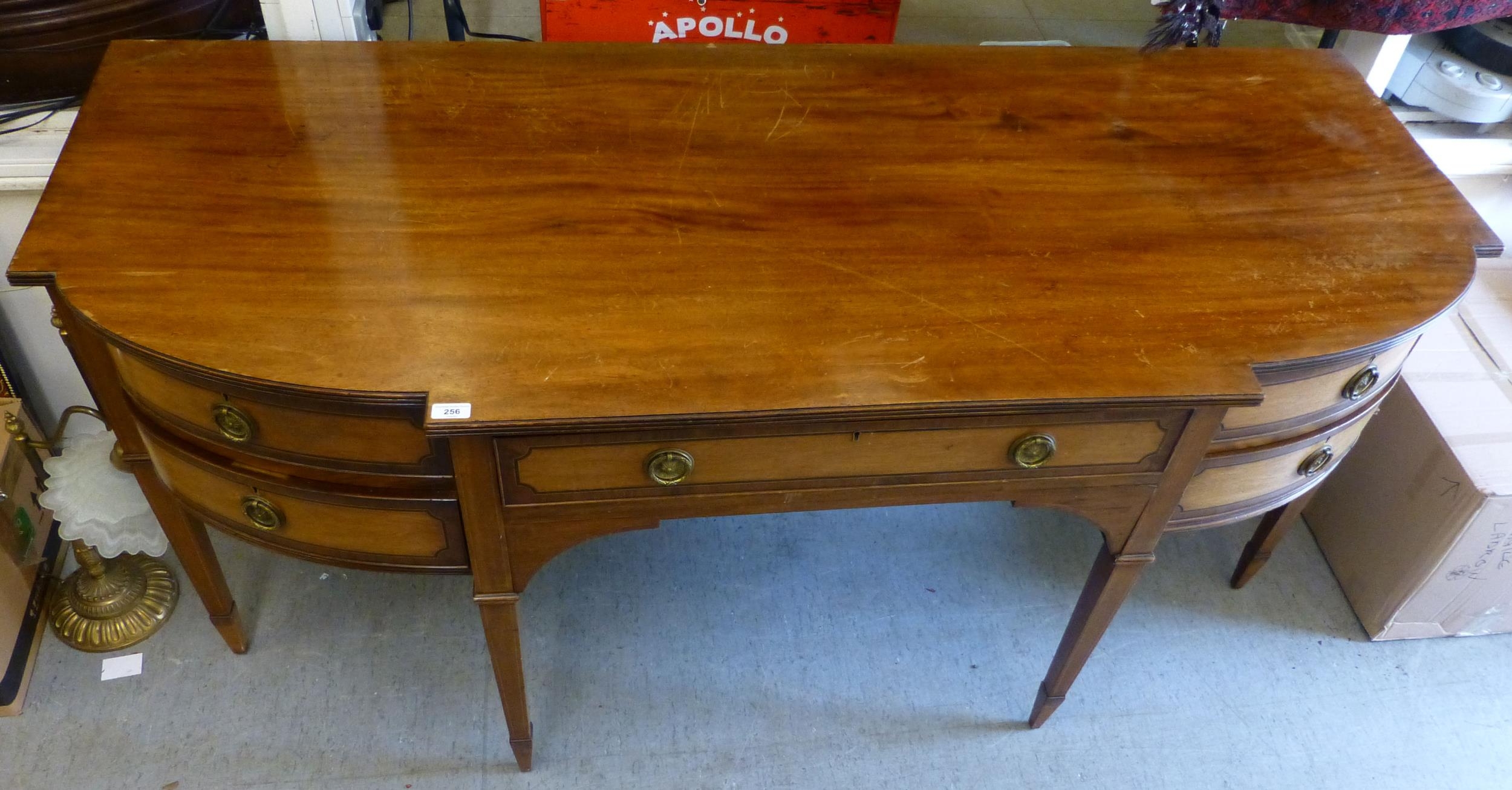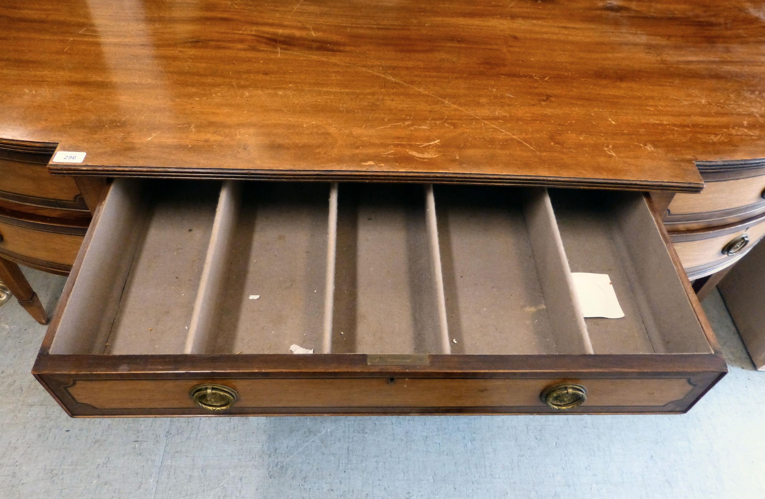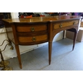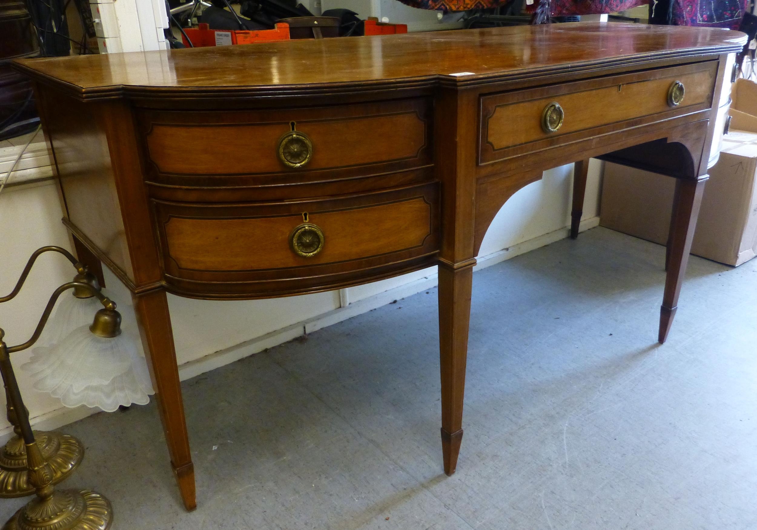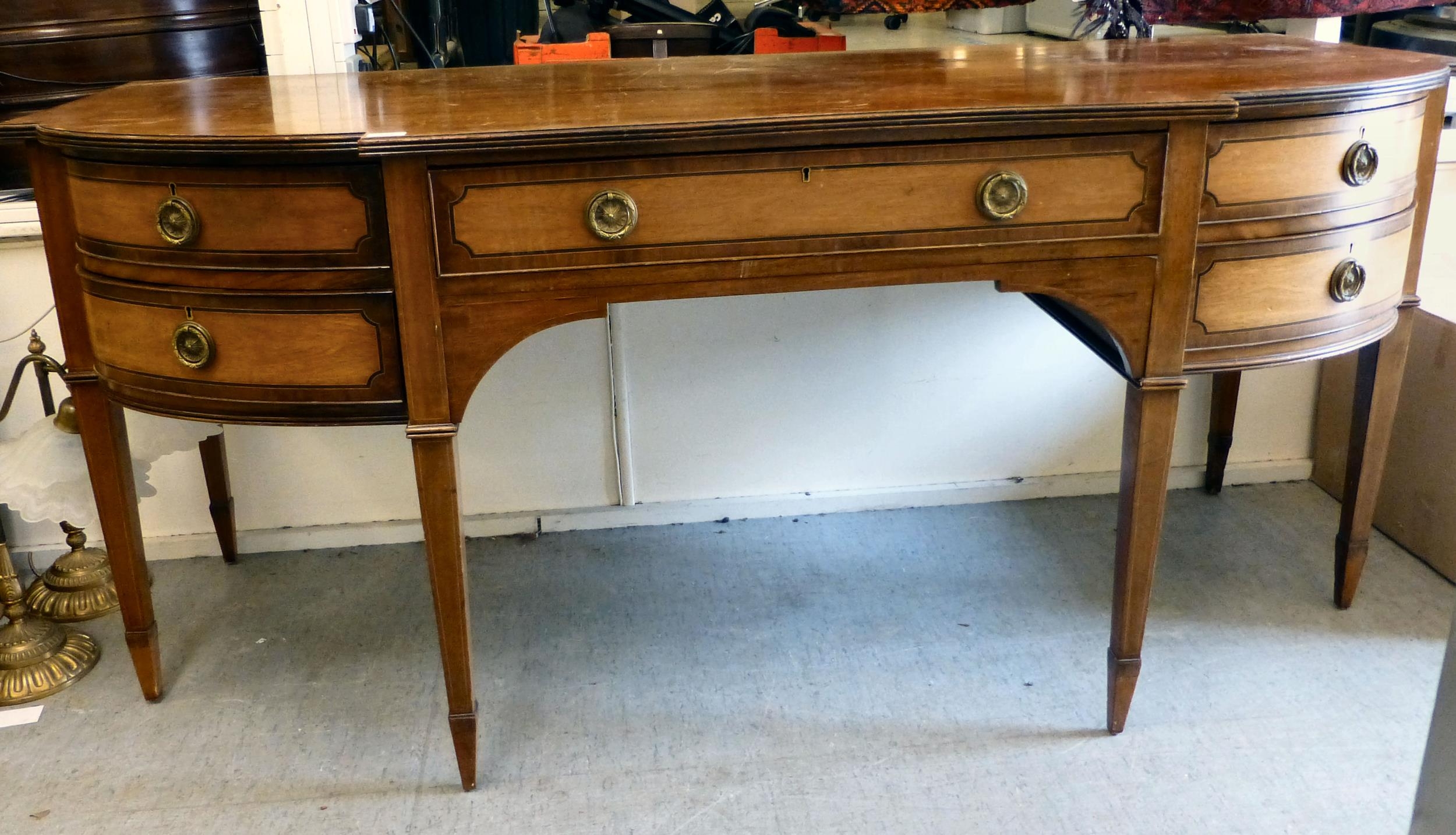 An Edwardian string inlaid mahogany breakfront sideboard with an arrangement of four short/one long drawer, raised on tapered square legs  32"h  72"w