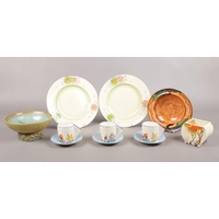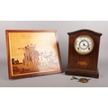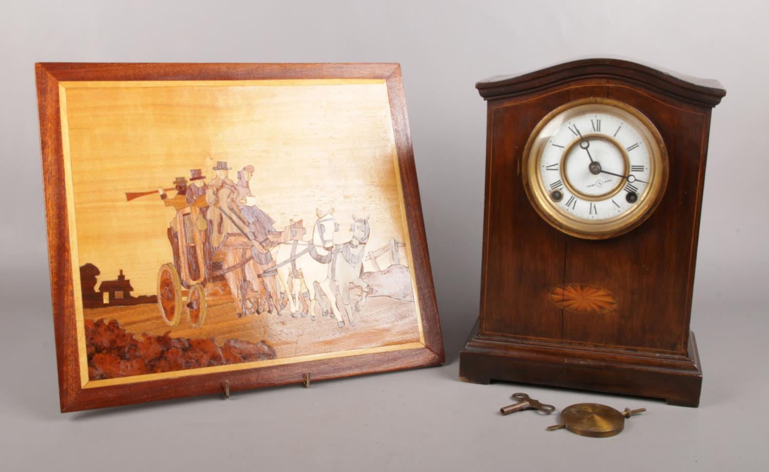 An early 20th Century Mahogany marquetry inlaid mantel clock, along with a marquetry picture. Comprising of a Trade S Mark clock with white enamel dial and Roman numerals. Comes with pendulum and key. H: 32.5cm, W: 22cm.