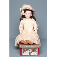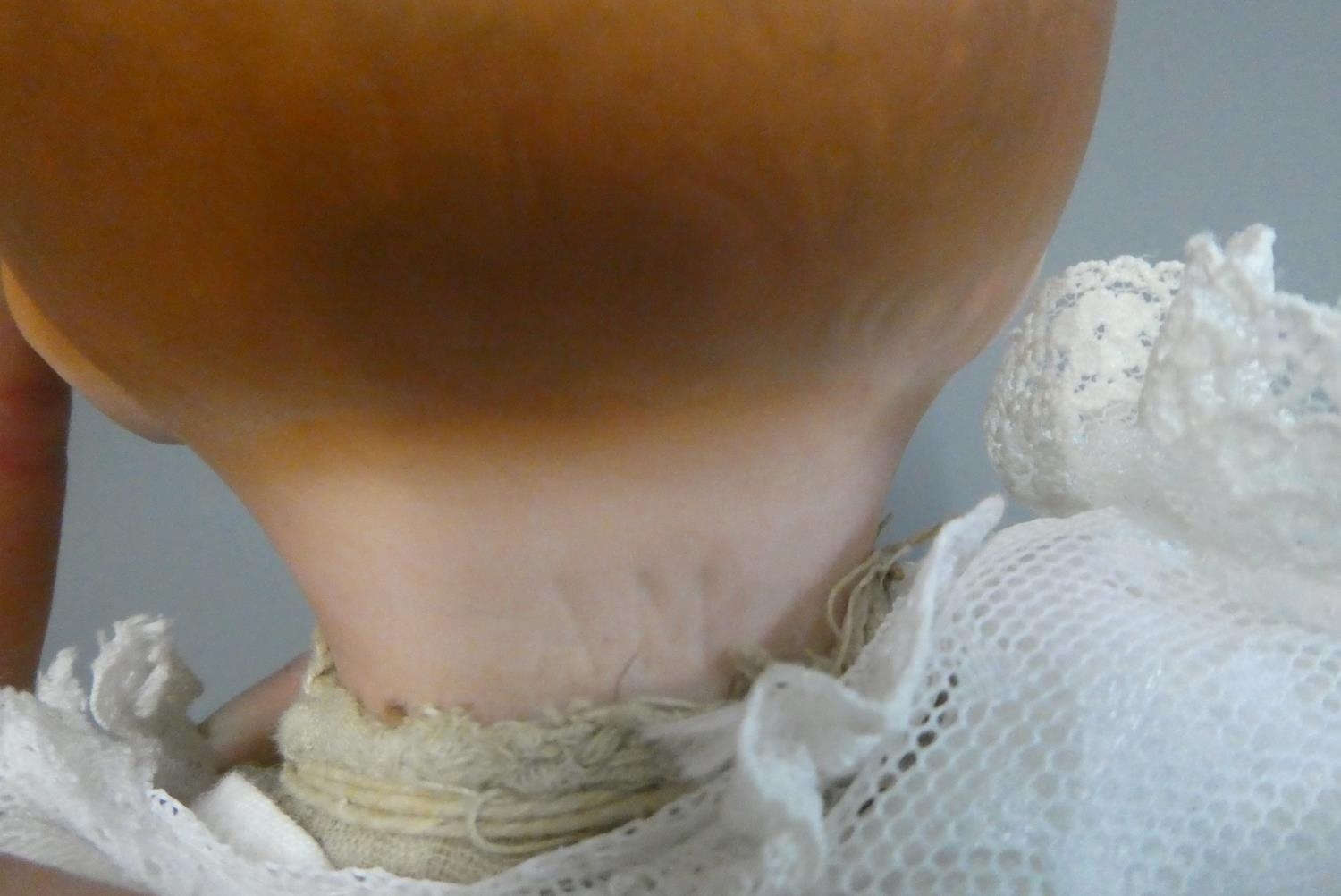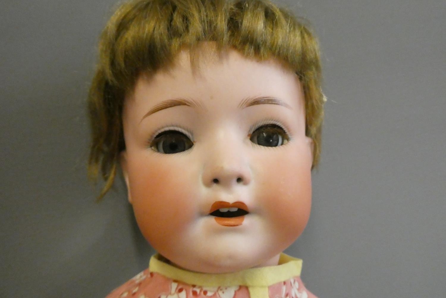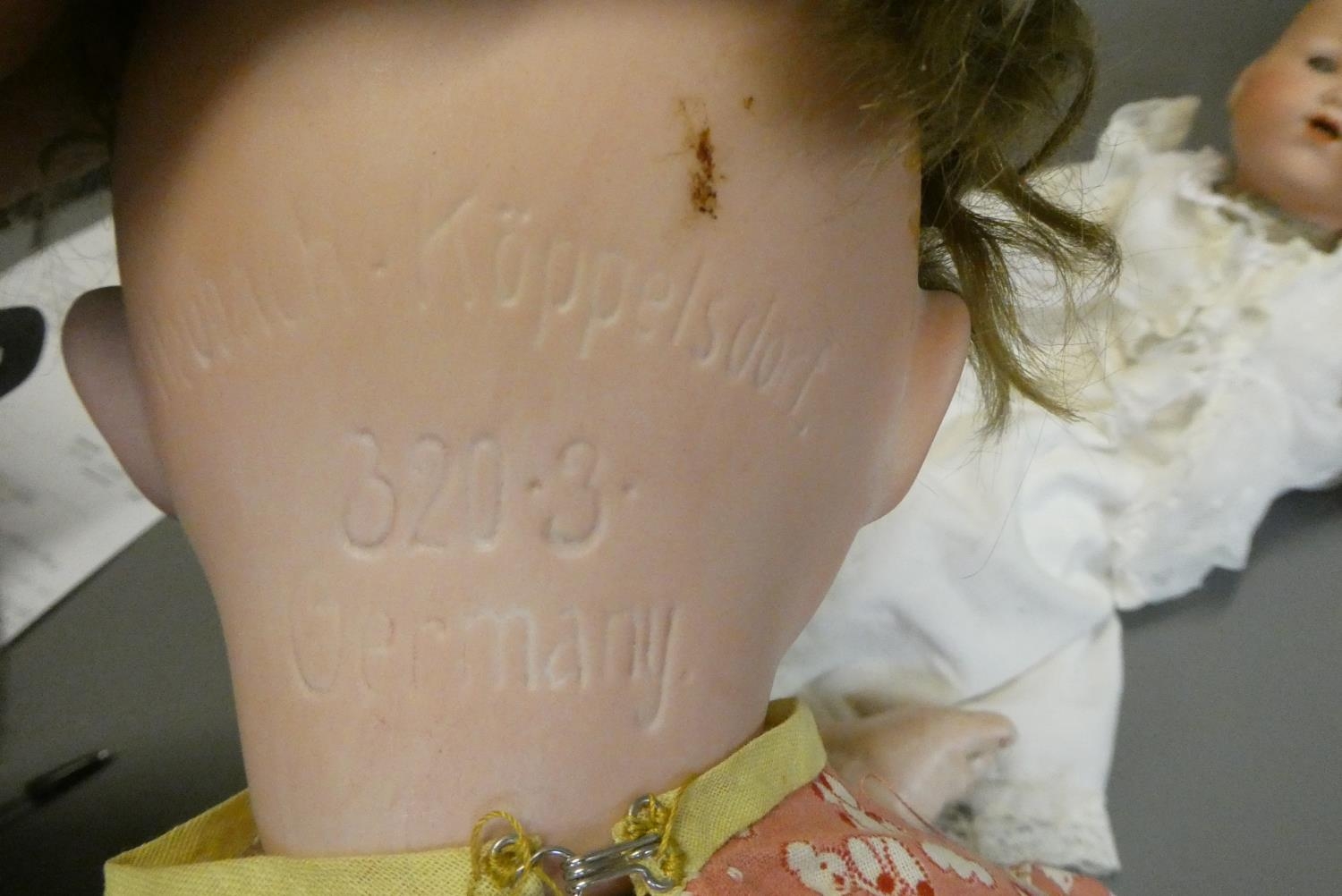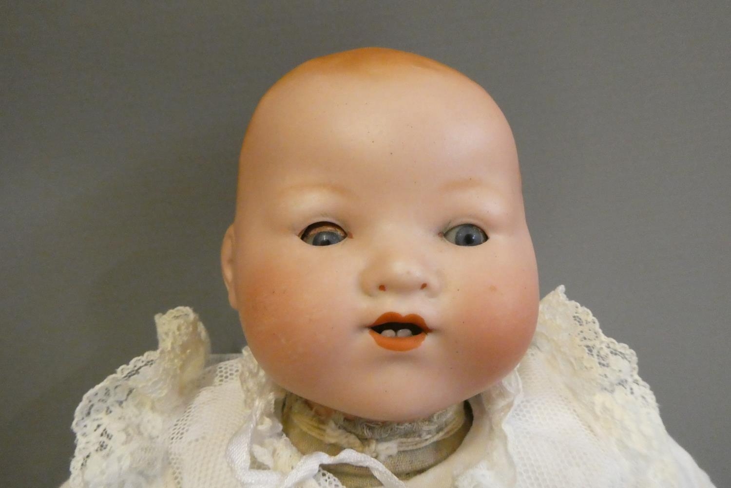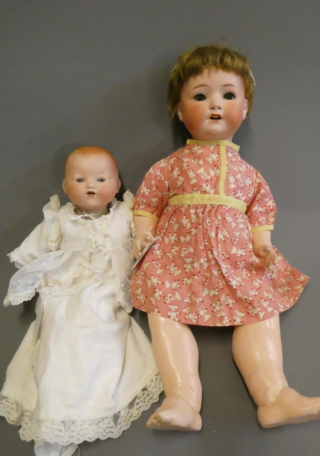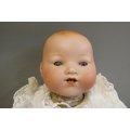 A Heubach Koppelsdorf bisque socket head doll, with blue glass sleeping eyes, open mouth, teeth and bent limb composition body, numbered 320 3, 19 1/2" long, together with a 13" Armand Marseille bisque flange neck dream baby doll, with sleeping eyes, open mouth, fabric body and composition hands (2)