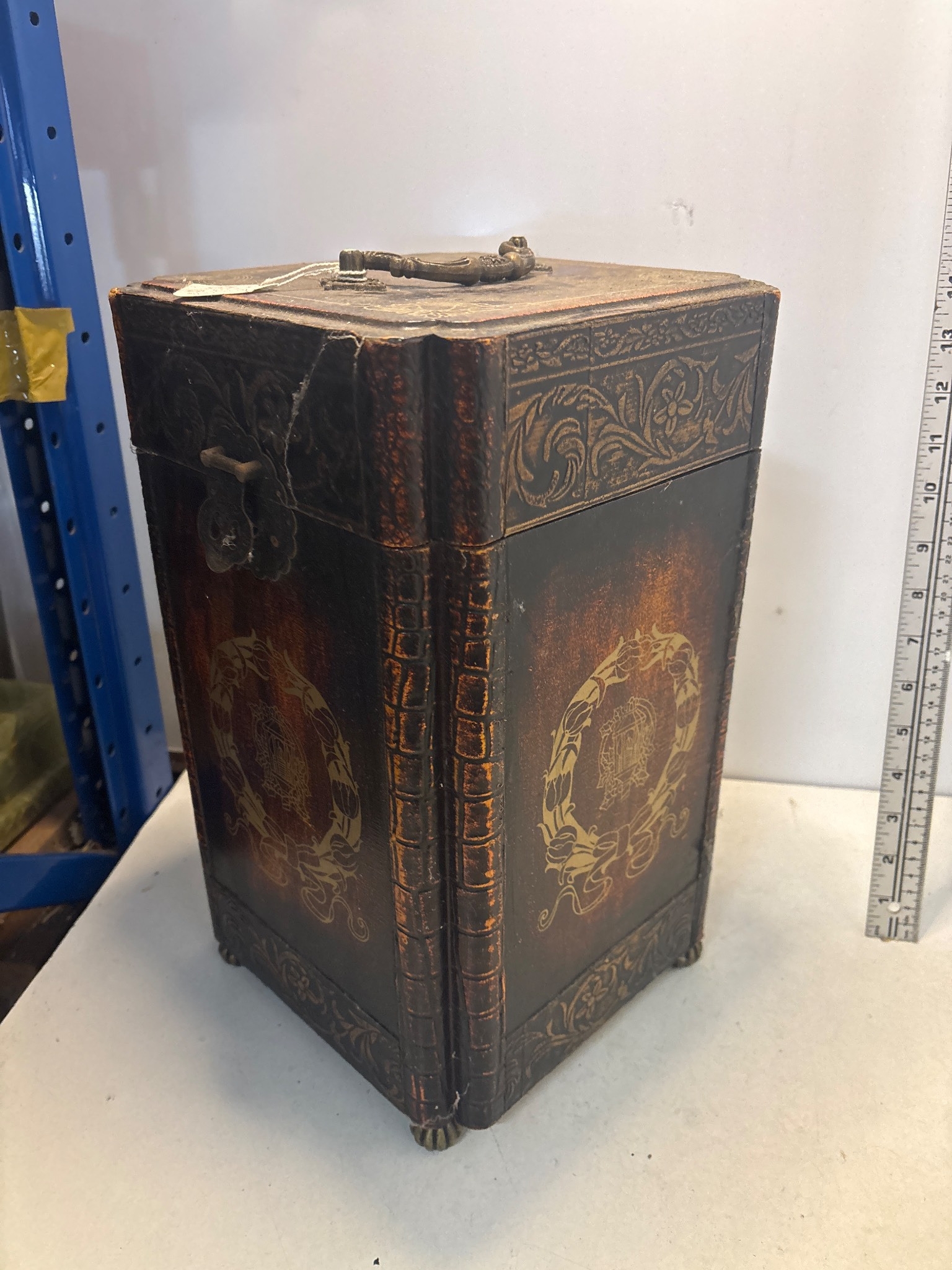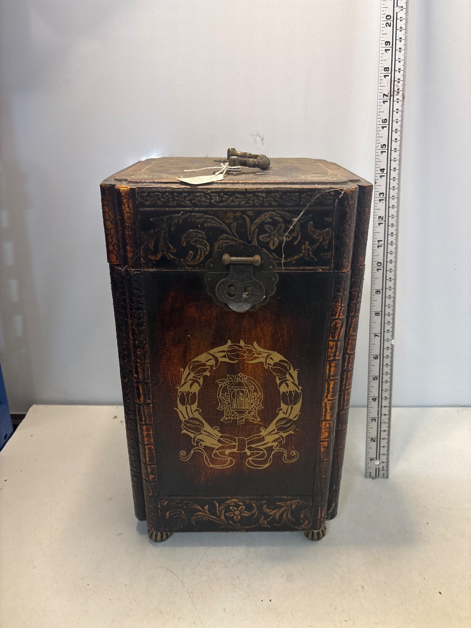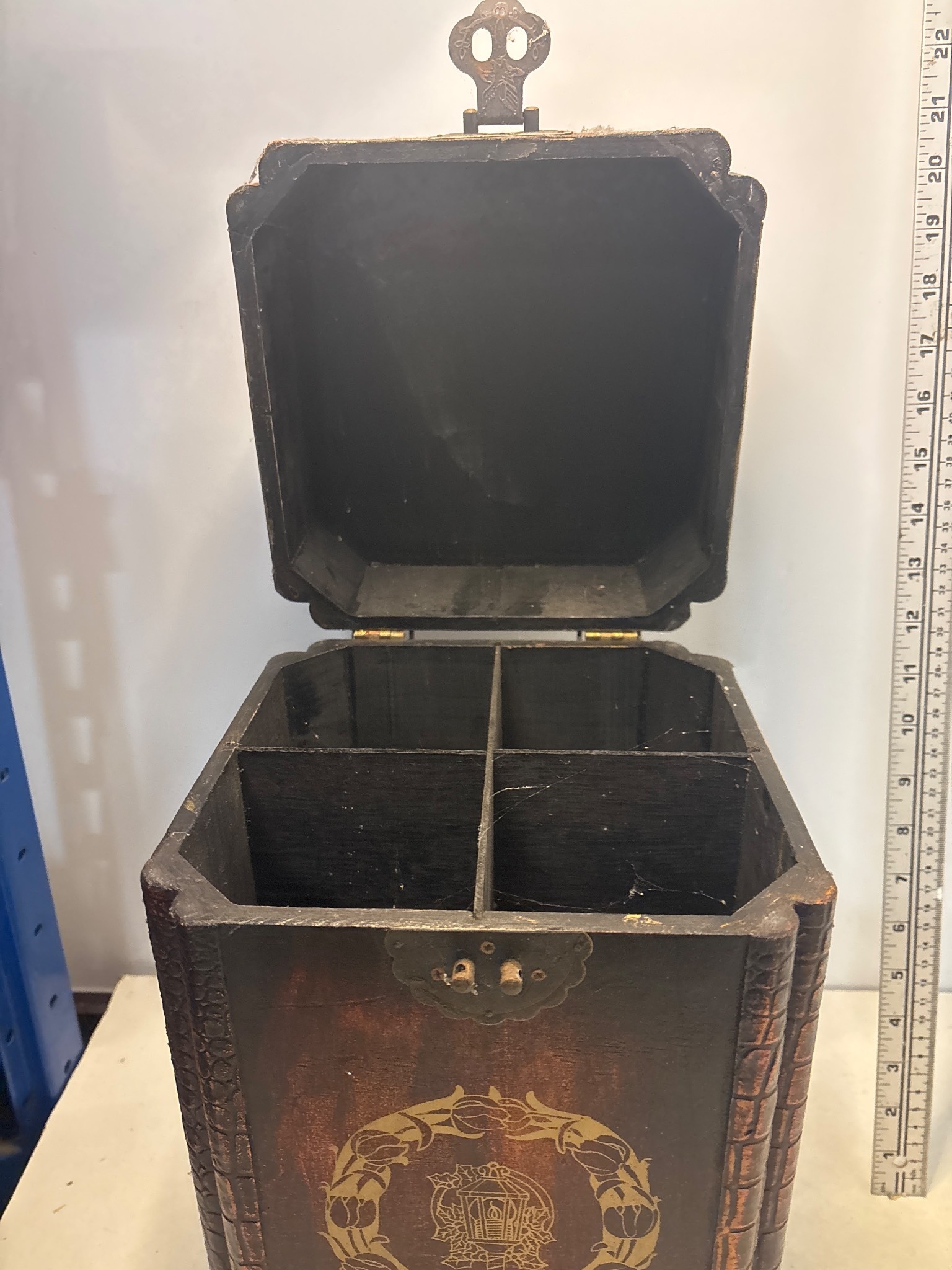 Decorative wooden wine box with lock, ornate design, divided interior.