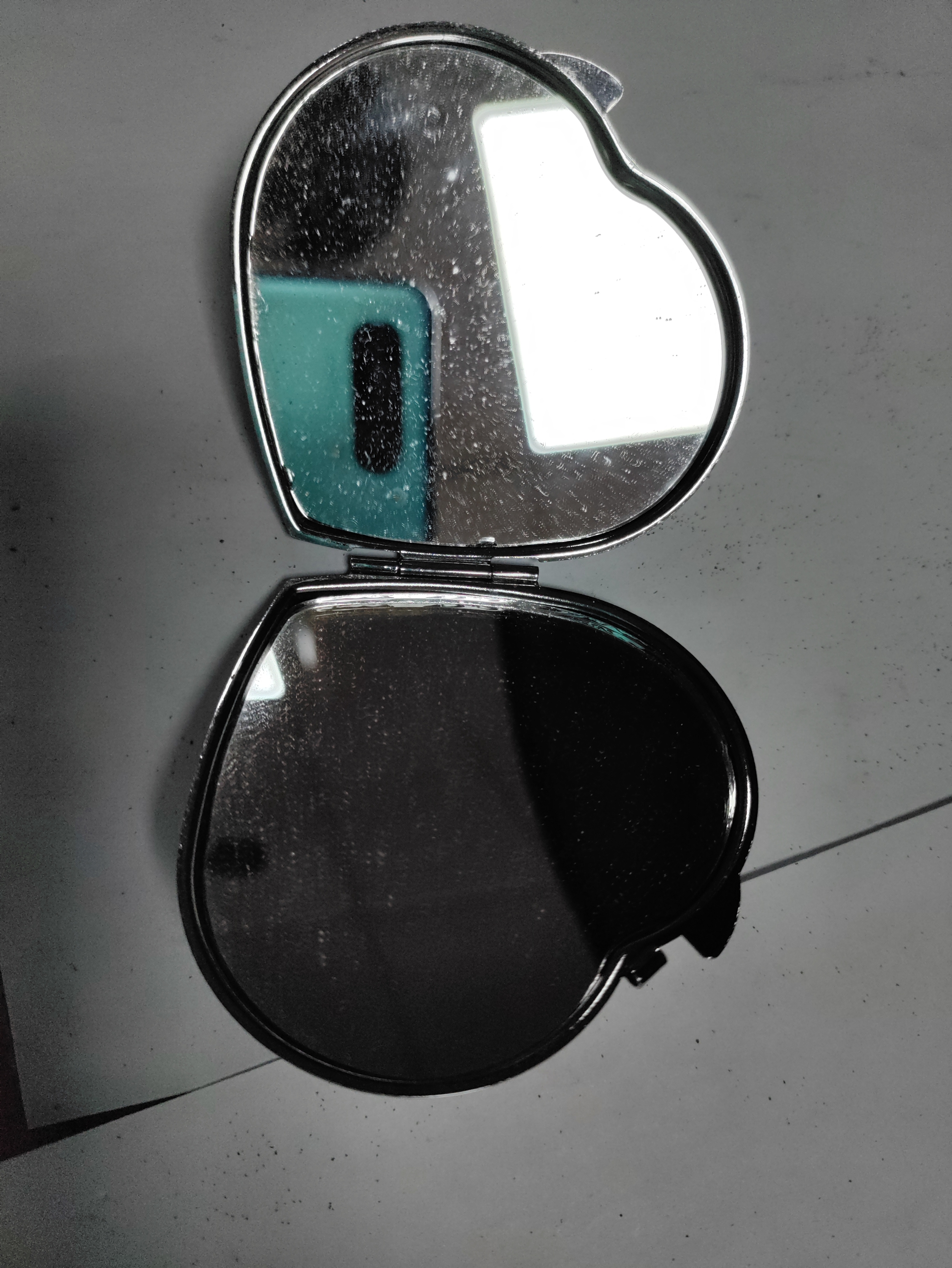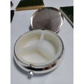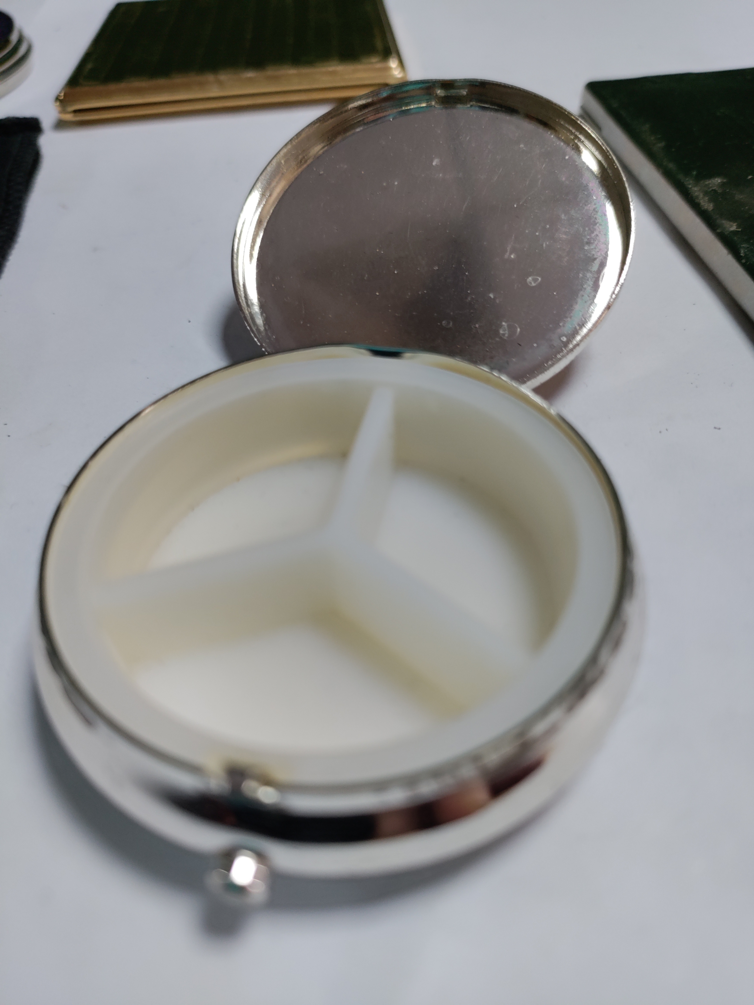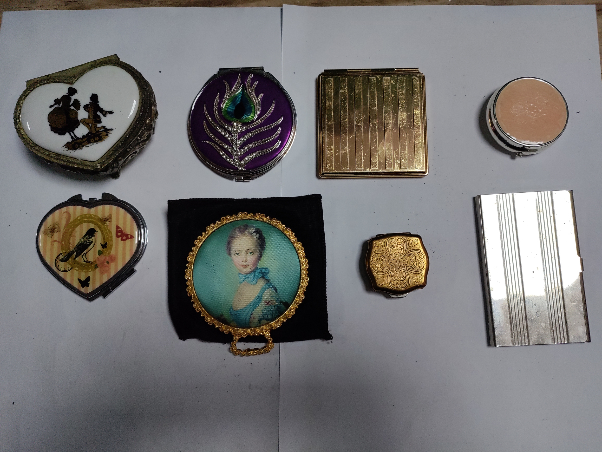 A heart shaped white metal jewellery box and a collection of hand held mirrors and a pair of pill boxes one made from brass and one from stainless steel