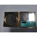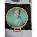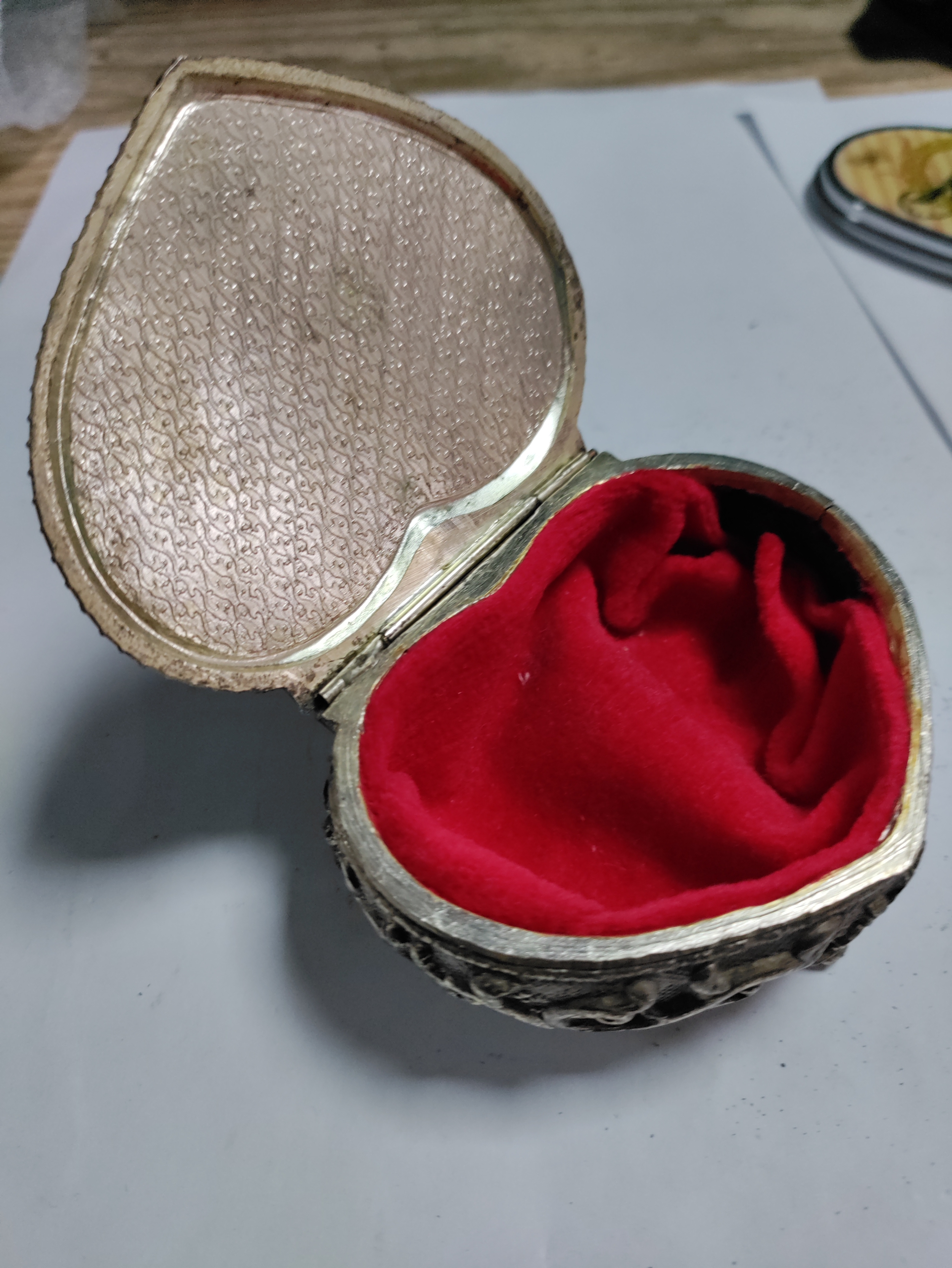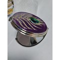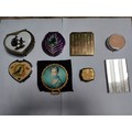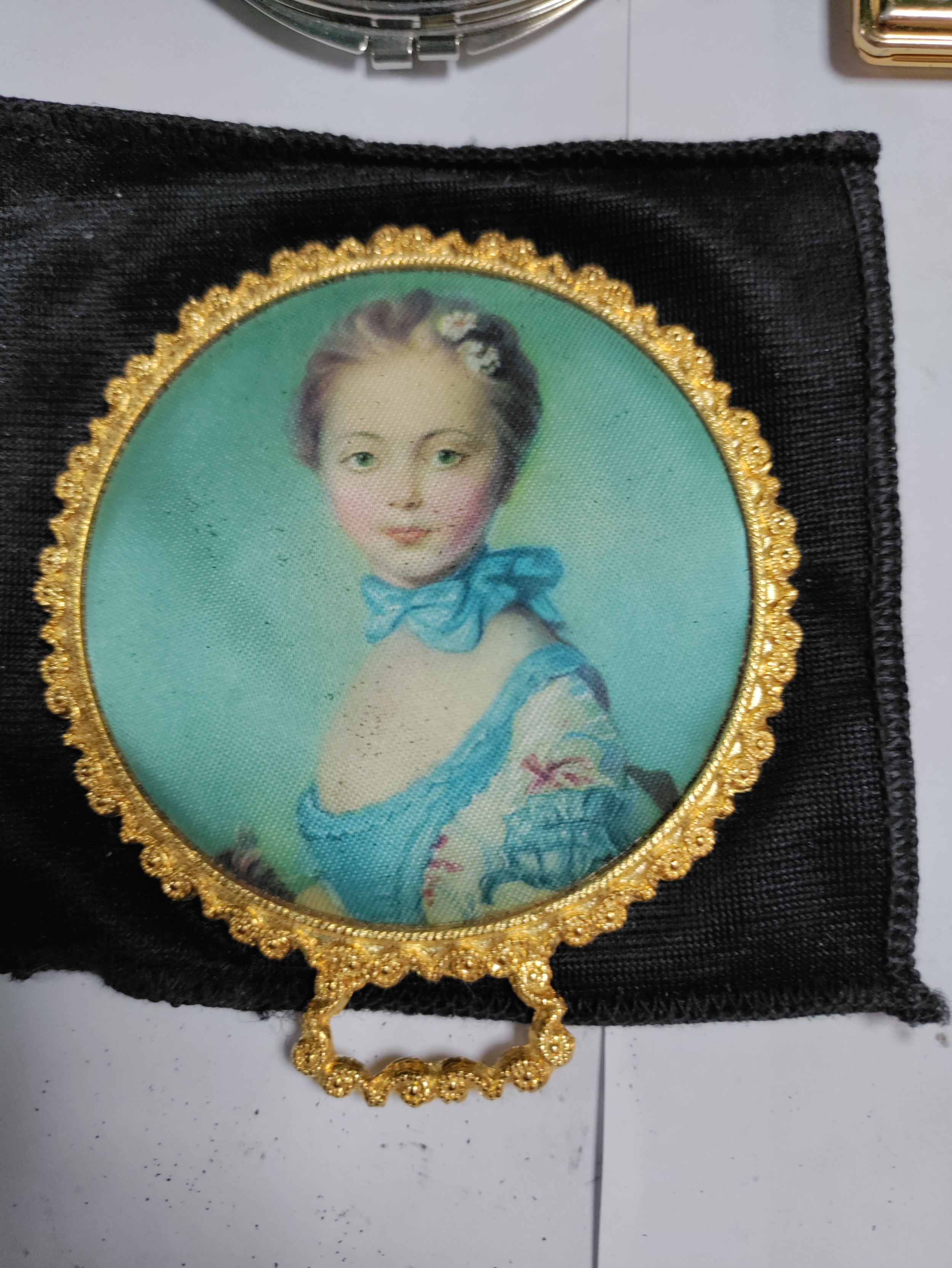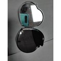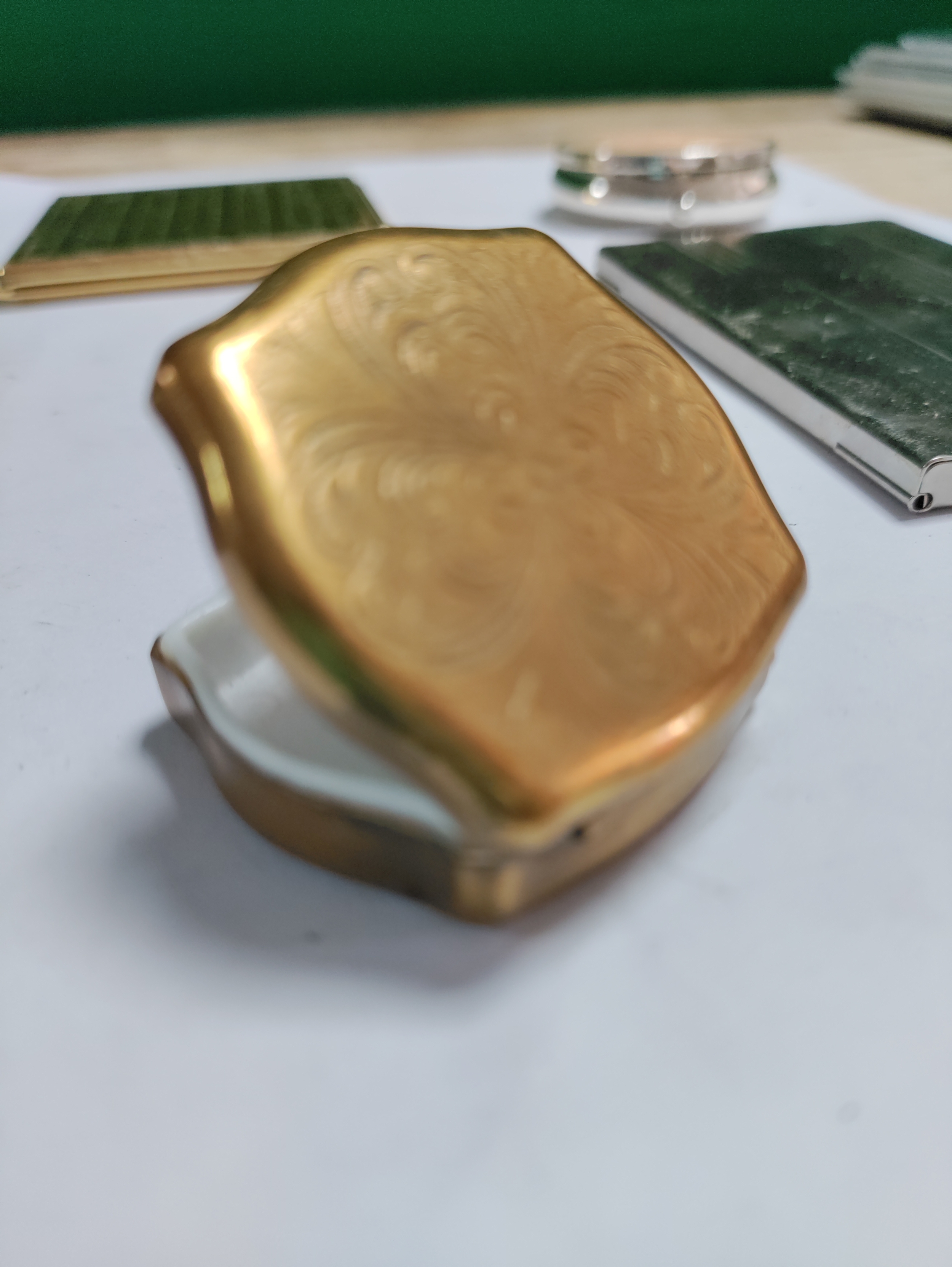 A heart shaped white metal jewellery box and a collection of hand held mirrors and a pair of pill boxes one made from brass and one from stainless steel