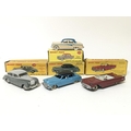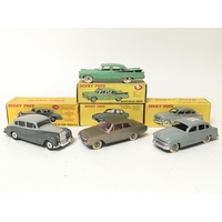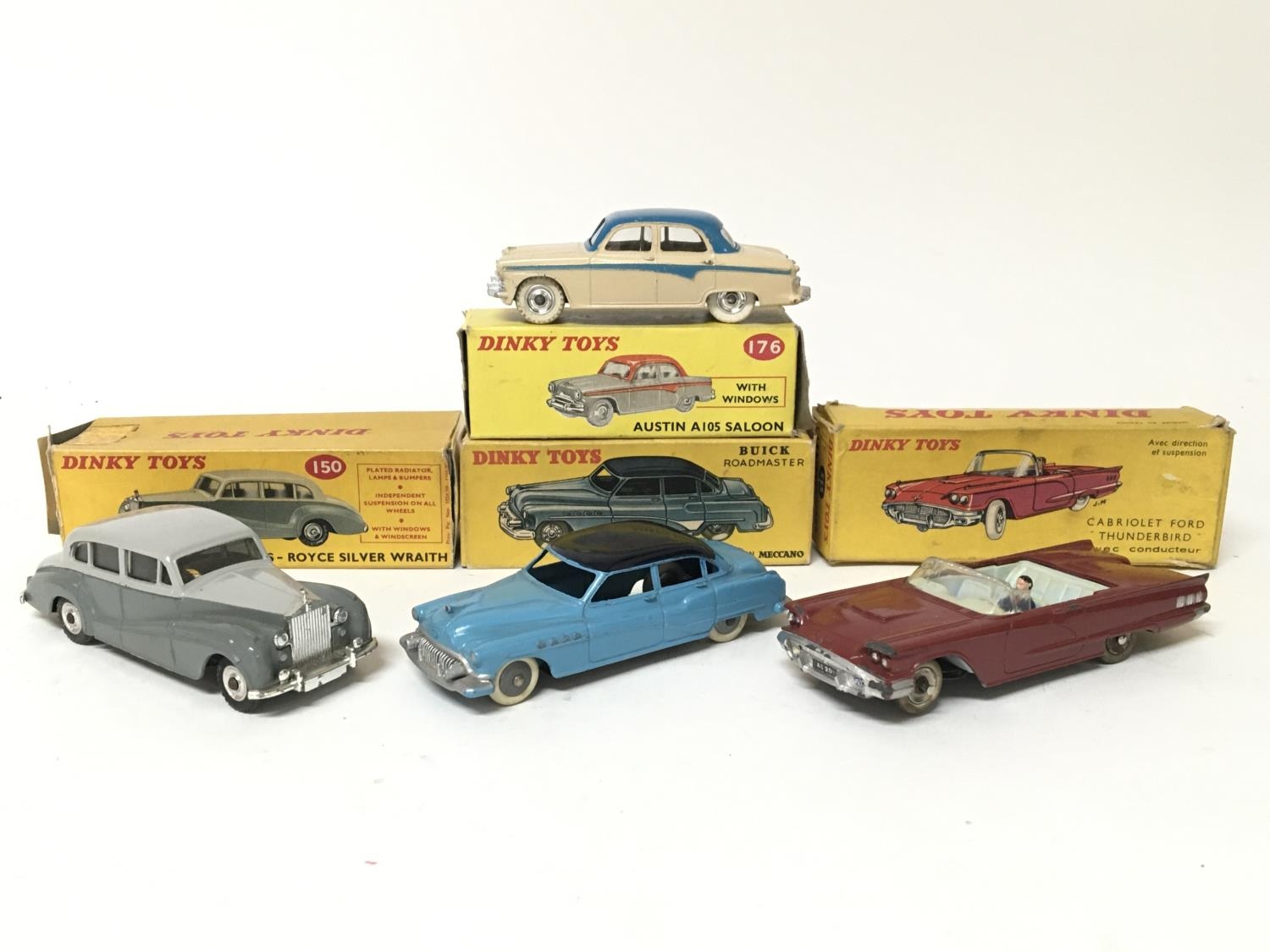 Dinky toys, #150 Rolls Royce silver wraith, #555 Ford Thunderbird cabriolet, #176 Austin A105 saloon and #24V Buick Roadmaster, boxed