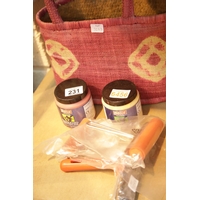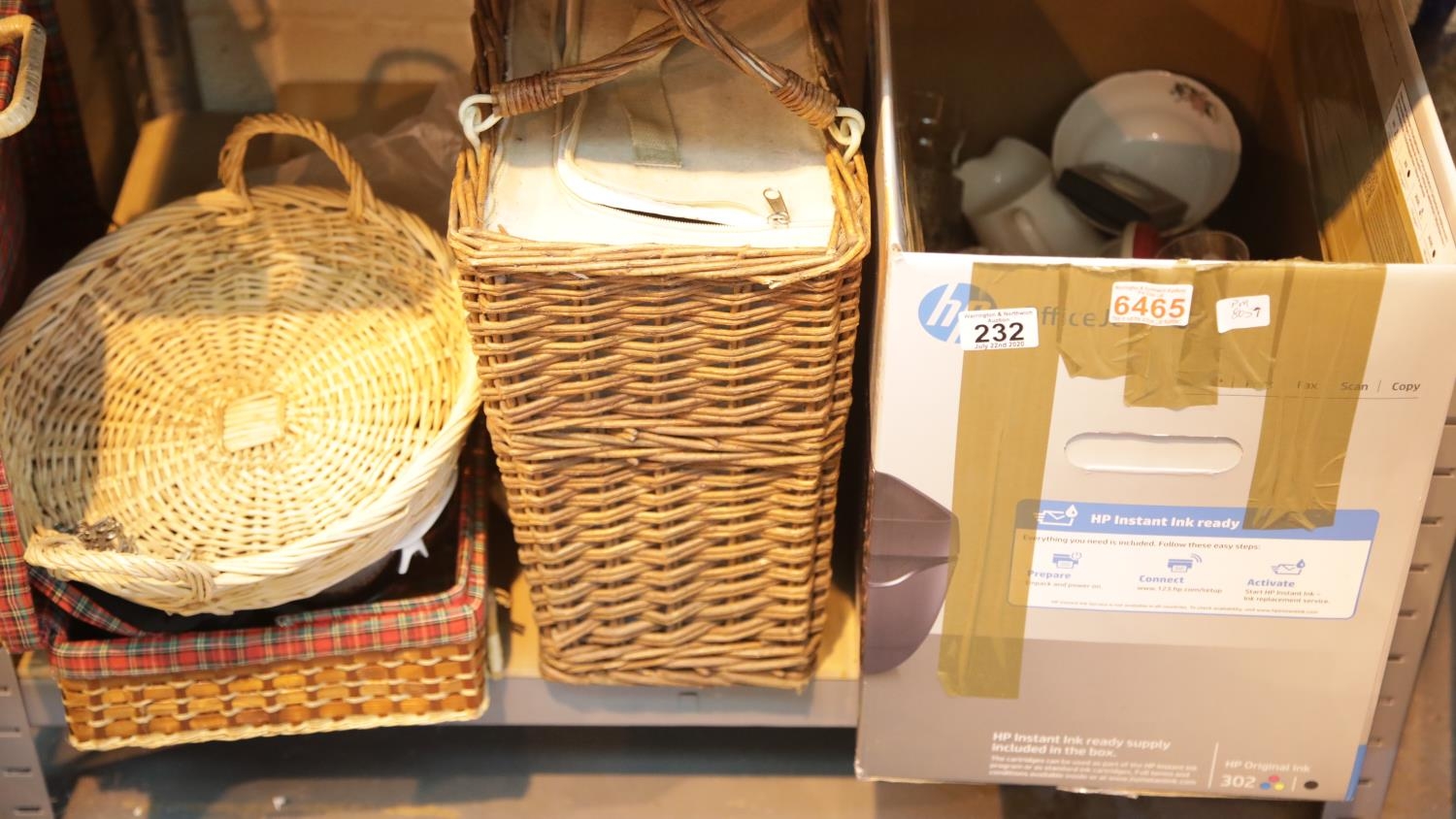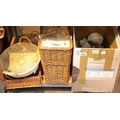 Two wicker baskets and a box of mixed items including glass, ceramics etc. This lot is not available for in-house P&P.
