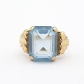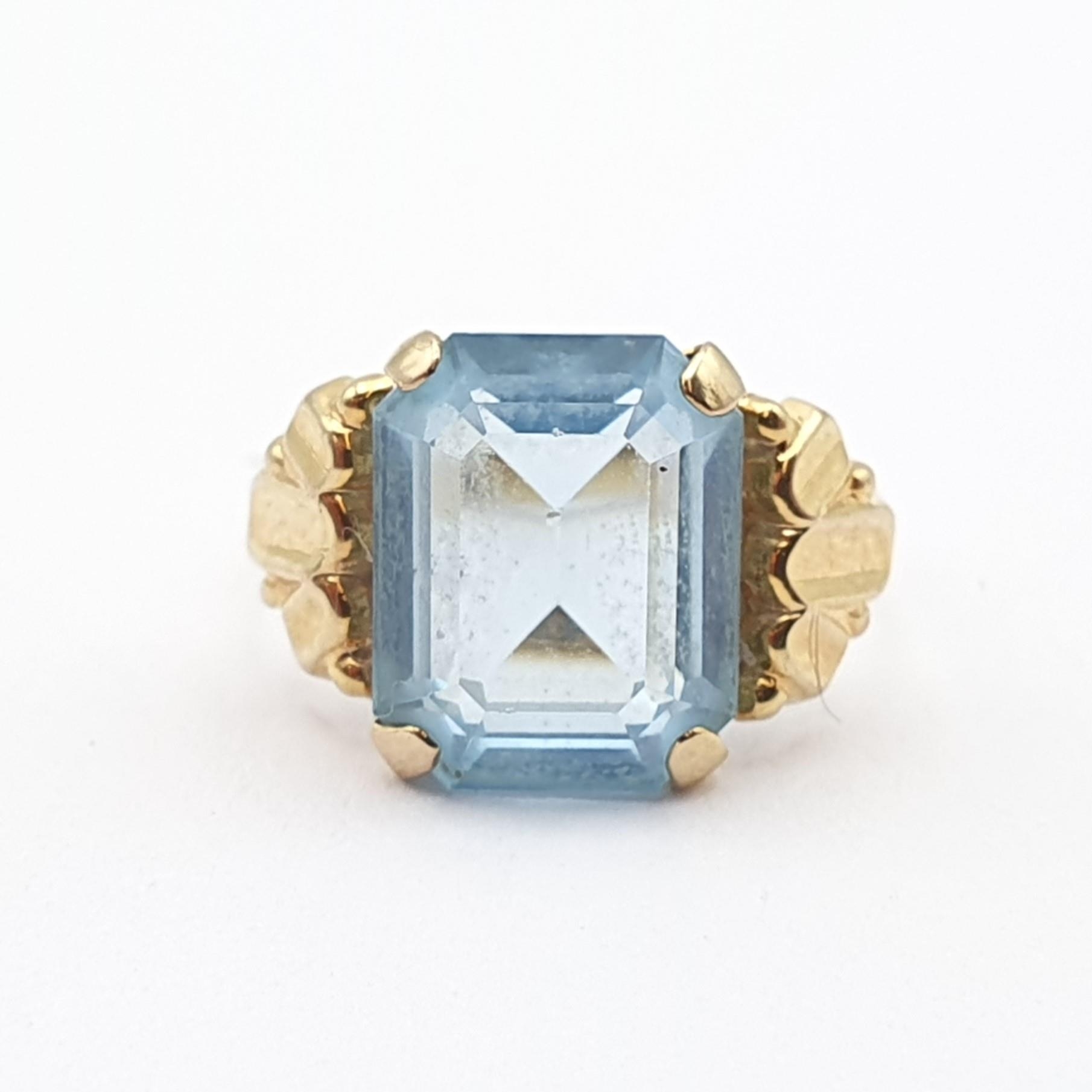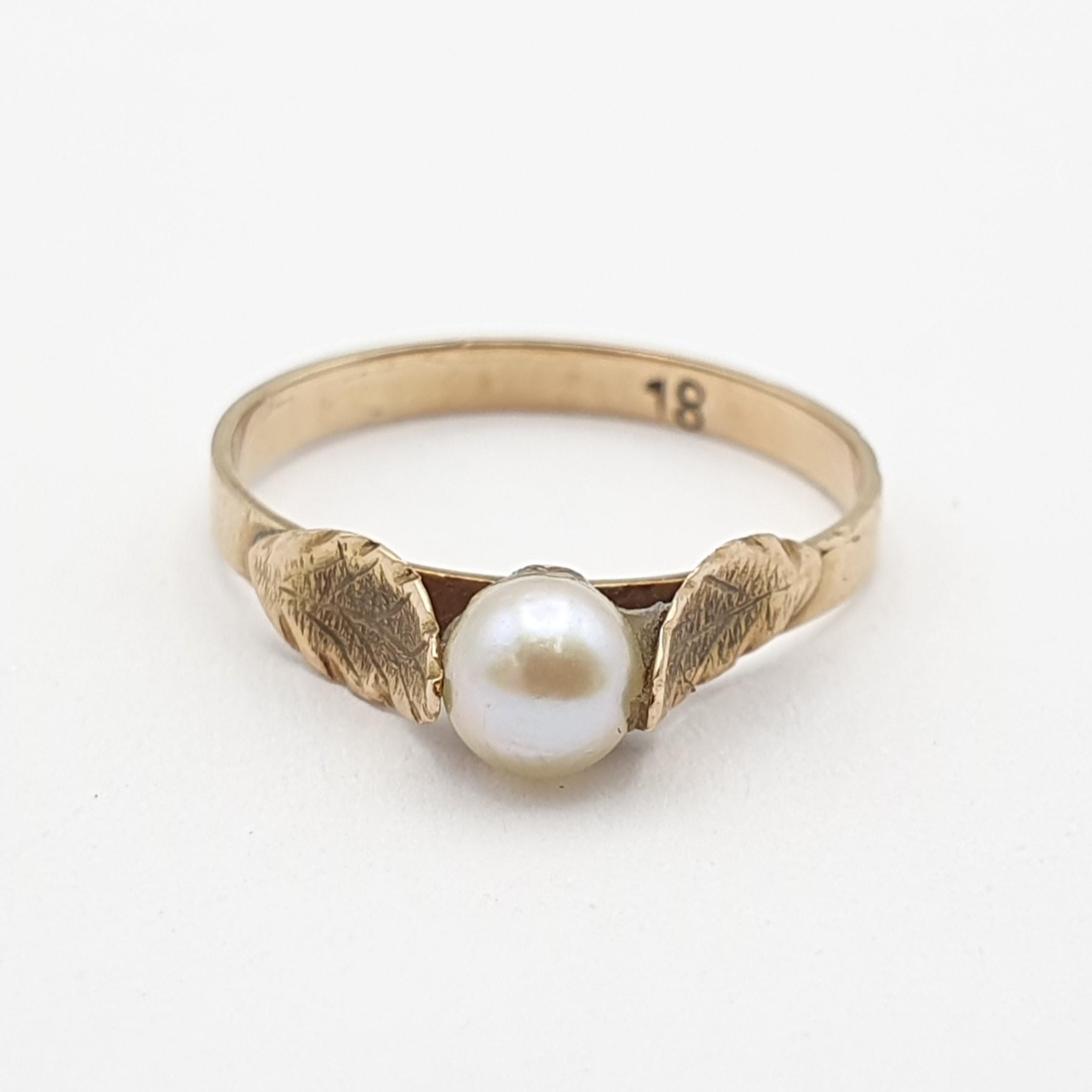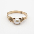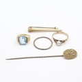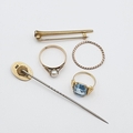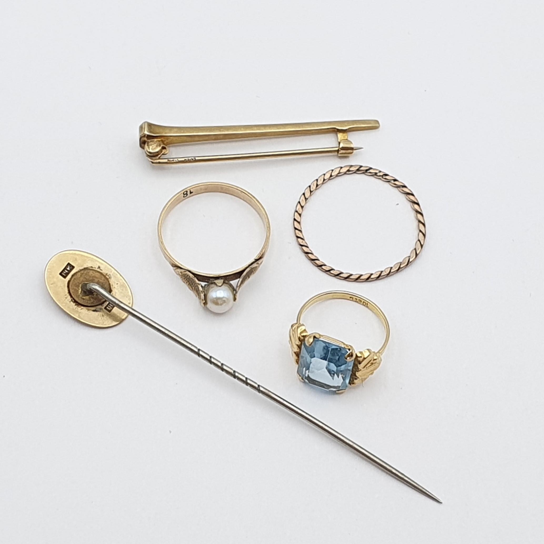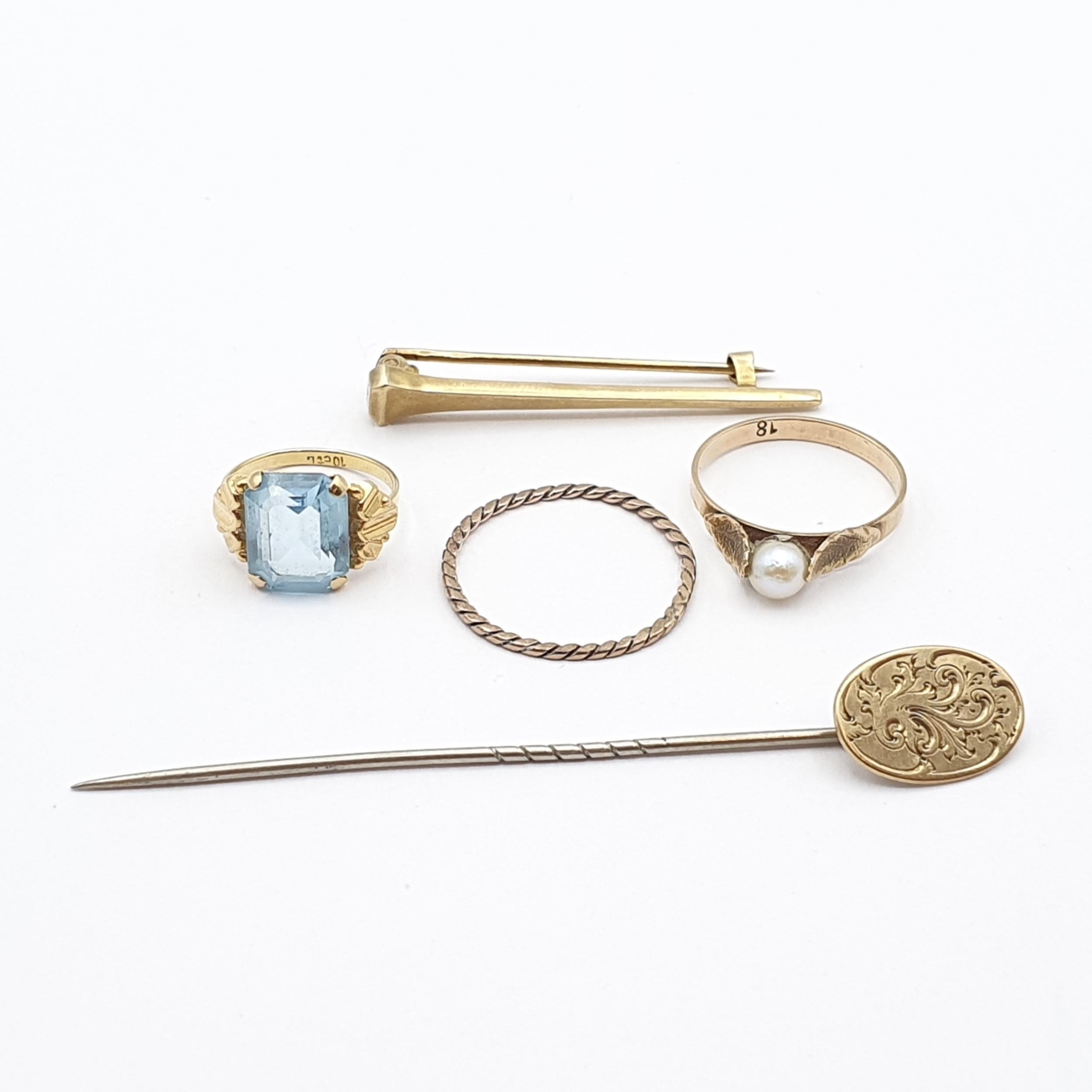 A Brooch of a nail, stamped 585, a Ring set blue paste stamped 10ct, a Ring set cultured pearl stamped 18, a rope-twist gold metal Ring and a Stick Pin stamped 14k, total weight 6.2gms