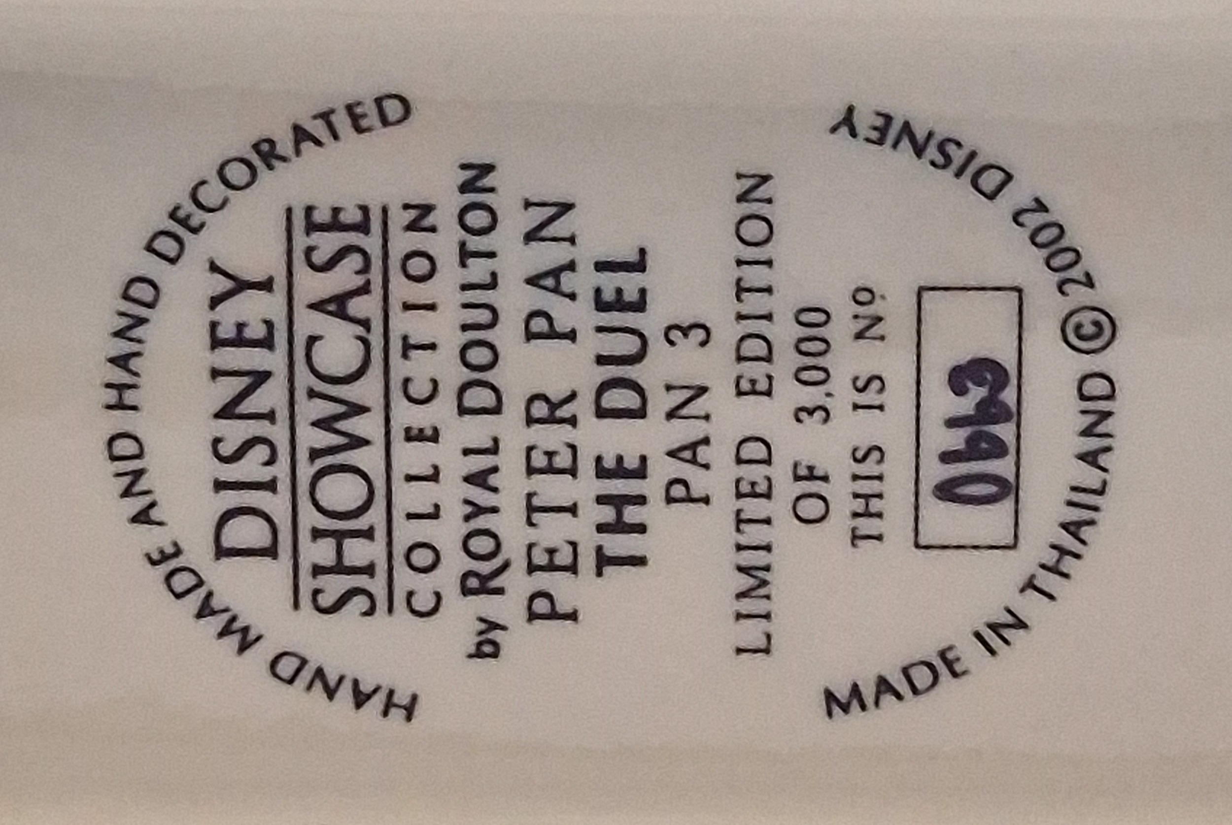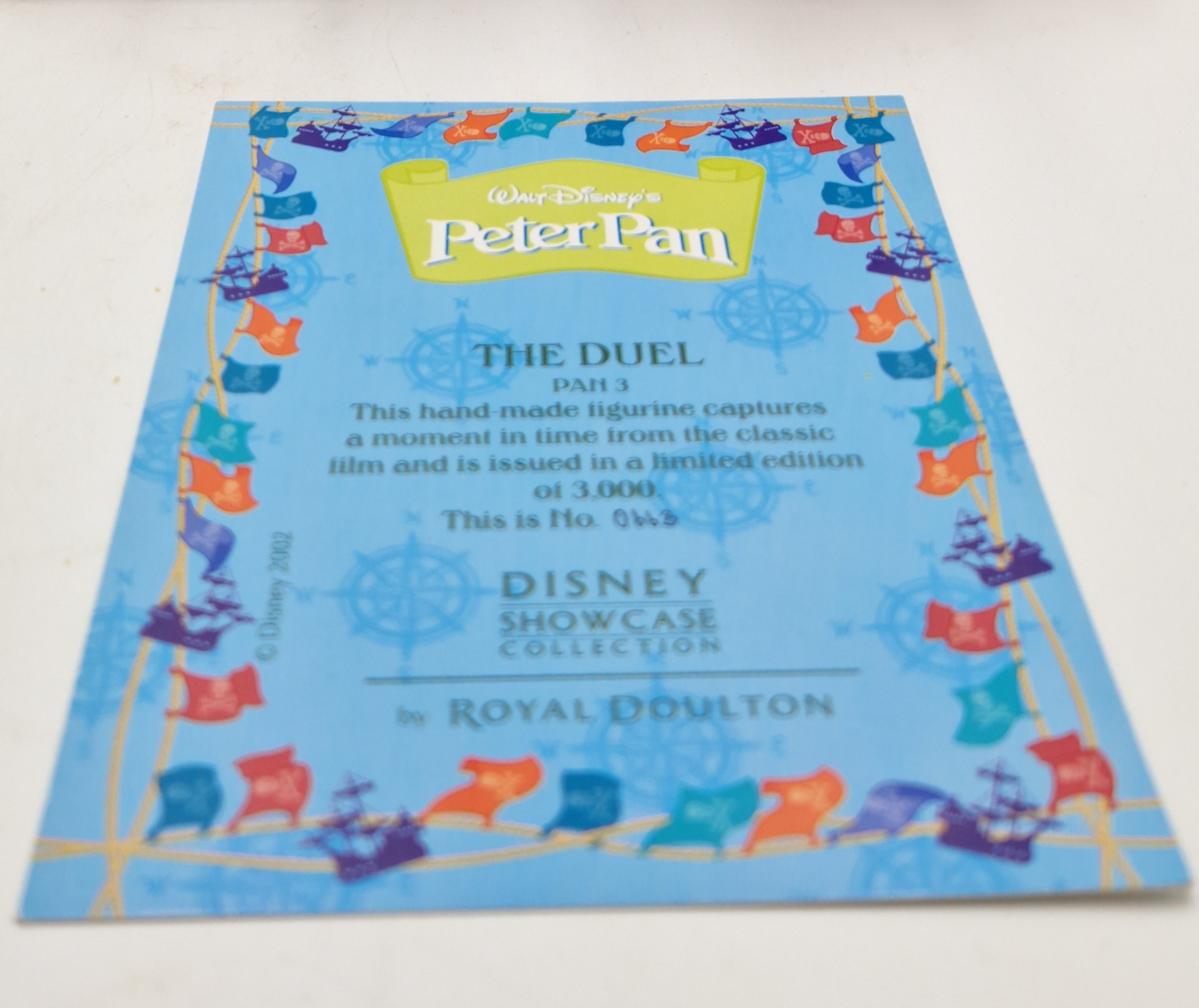 ROYAL DOULTON 15.9cm DISNEY CHARACTER TABLEAU "THE DUEL" Pan 3 FROM THE PETER PAN SERIES----DISNEY SHOWCASE COLLECTION 2002 Only (Limited Edition 3,000 This One Being No 0668) (Complete With Original Box , Card And Paperwork)
