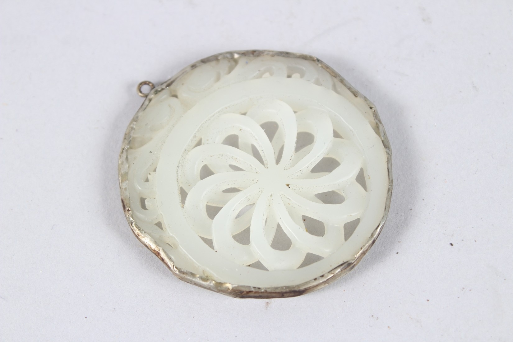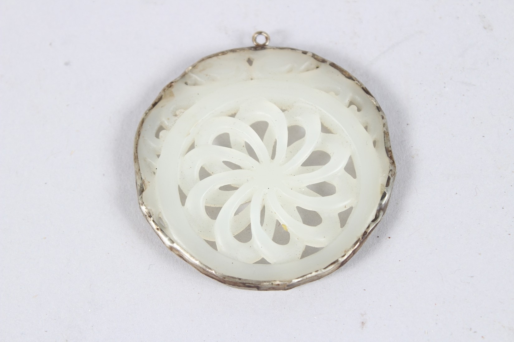 A PIERCED JADE AND SILVER PENDANT. 2ins.