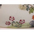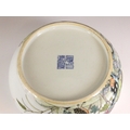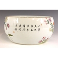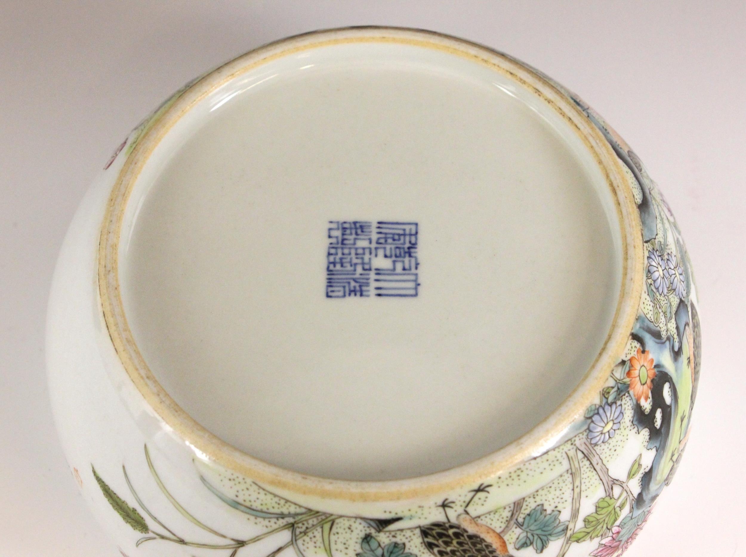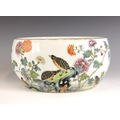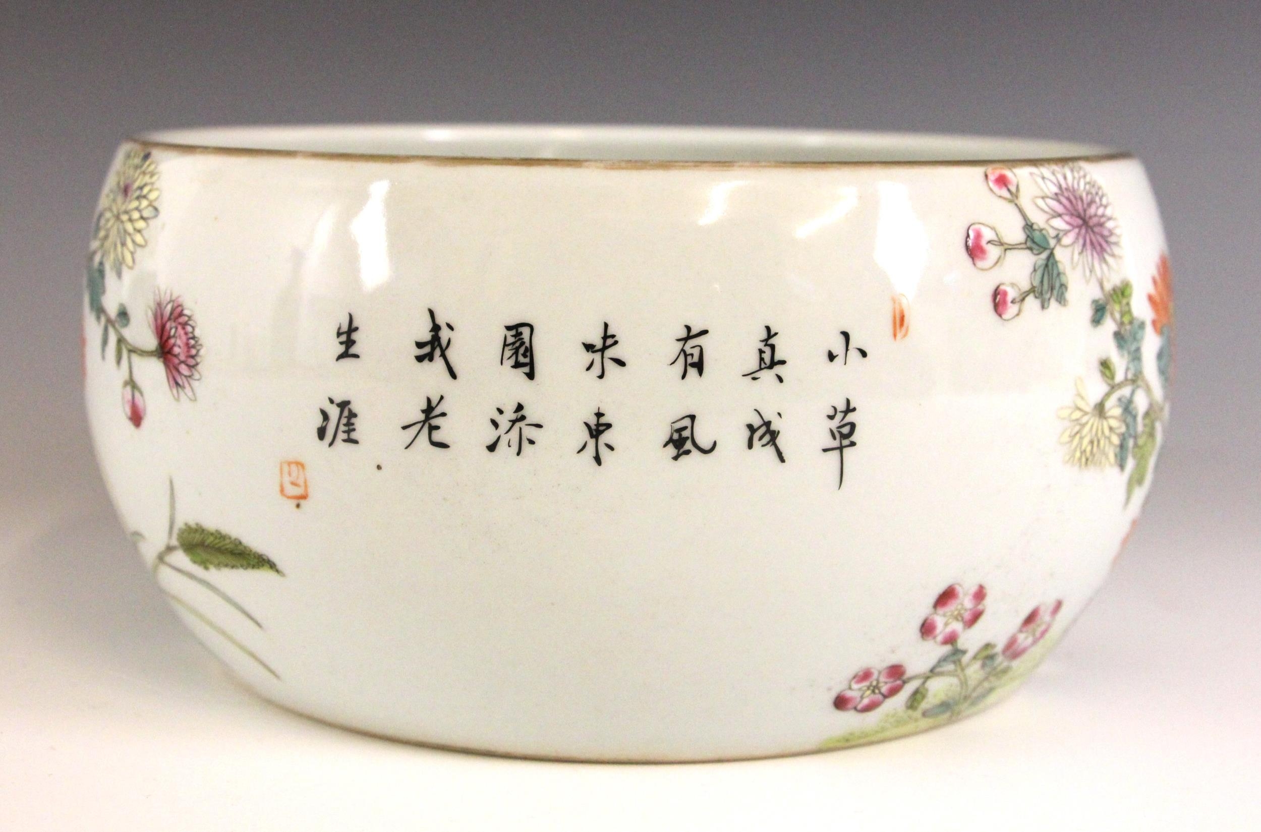 A Chinese porcelain famille rose brush washer (bitong), Qianlong seal mark, the waisted cylindrical bowl externally painted with four quail amidst extensive floral blooms, signed, blue seal mark to the underside, 19.5cm wide