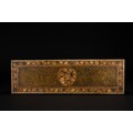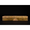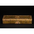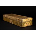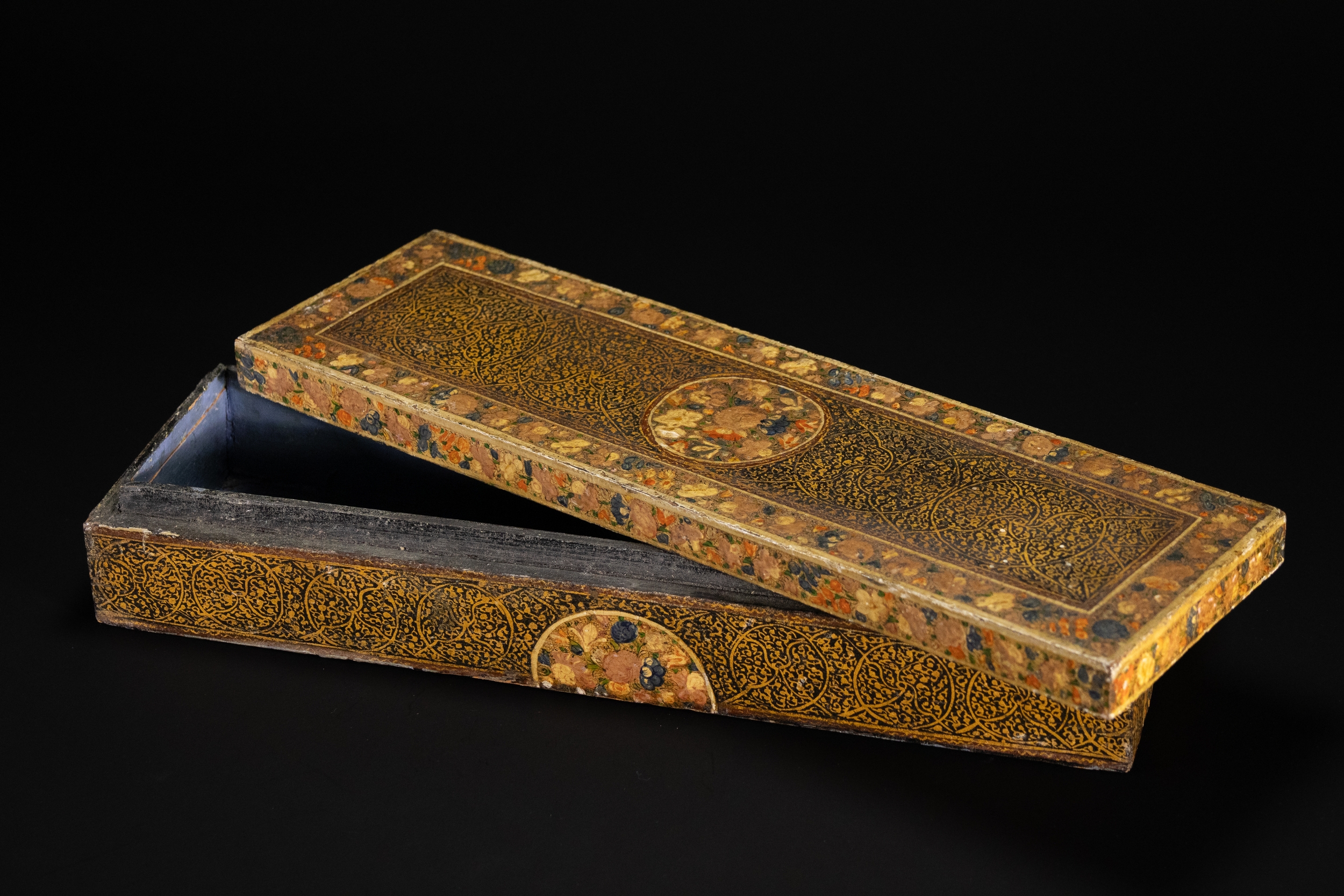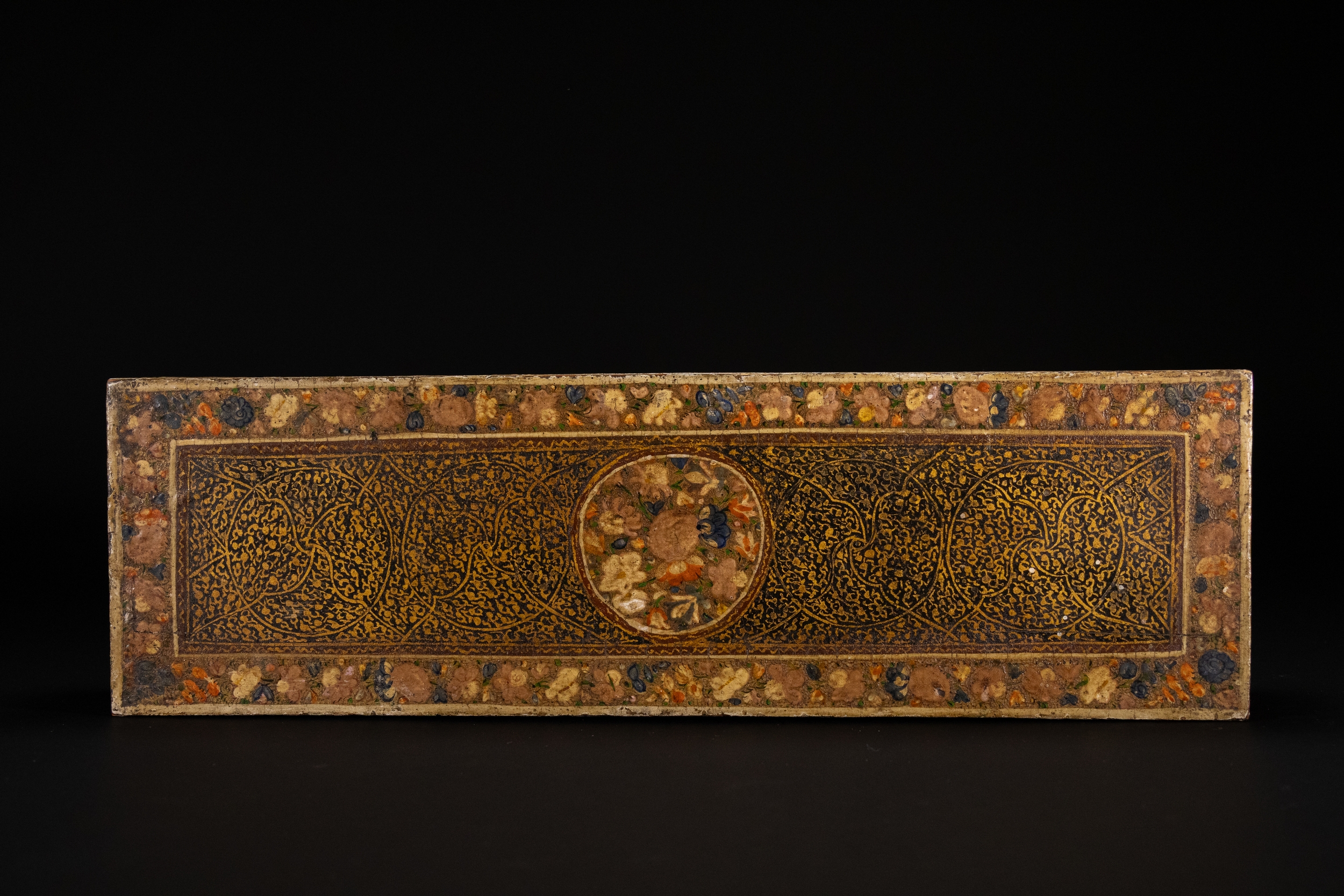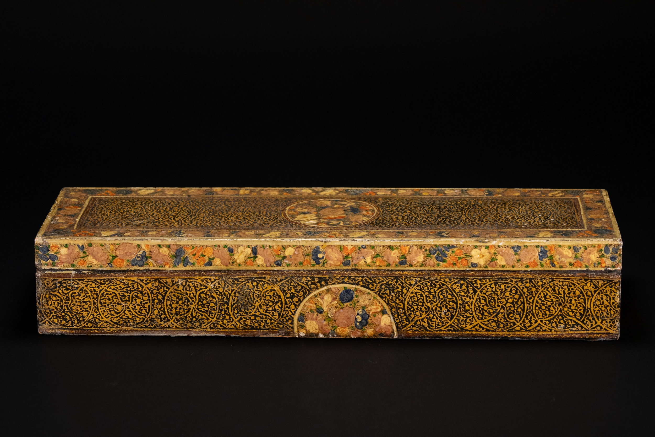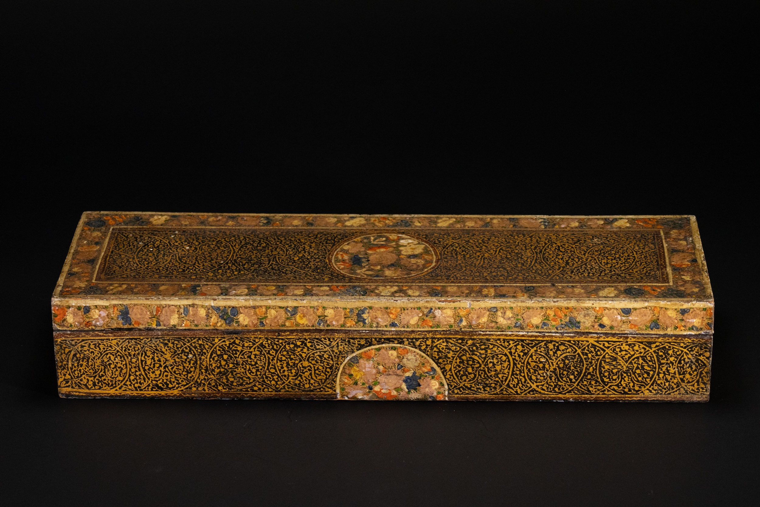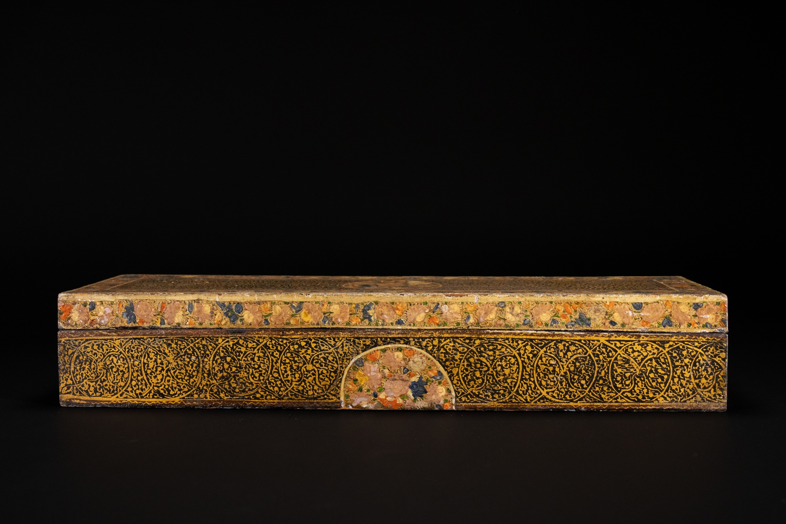 A Kashmiri papier-mâché rectangular lidded box, decorated in rich gilt arabesque scrolls across the top and sides, framed by floral borders with multicoloured blossoms in red, blue, cream, and green. The centre of the lid features a circular medallion of densely painted flowers, echoed by half-medallions on the sides.