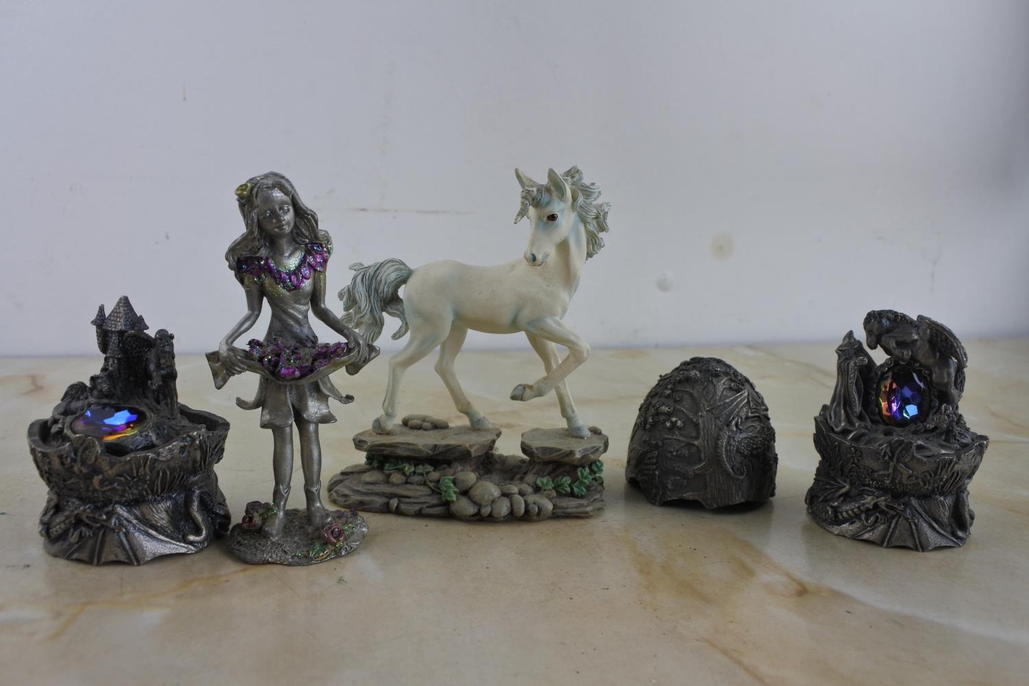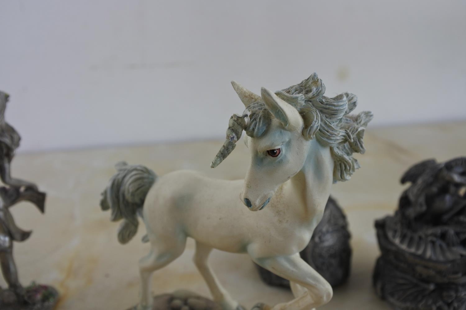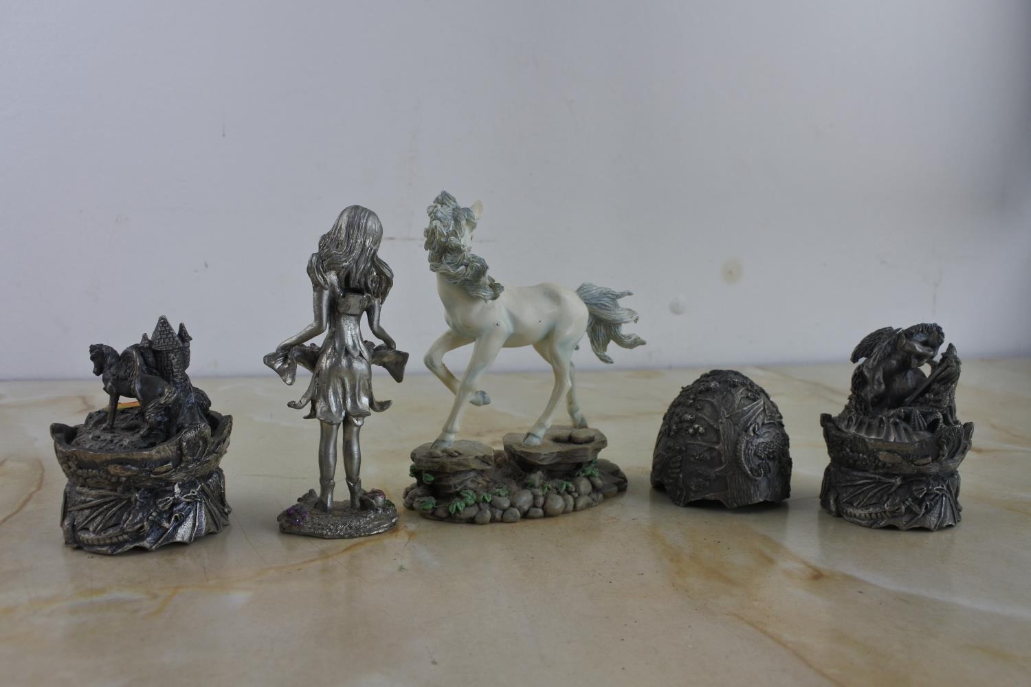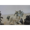 A collection of ornamental figurines including The Tudor Mint collection 'The Castle of Pegasus' and 'The Leaping Pegasus'
