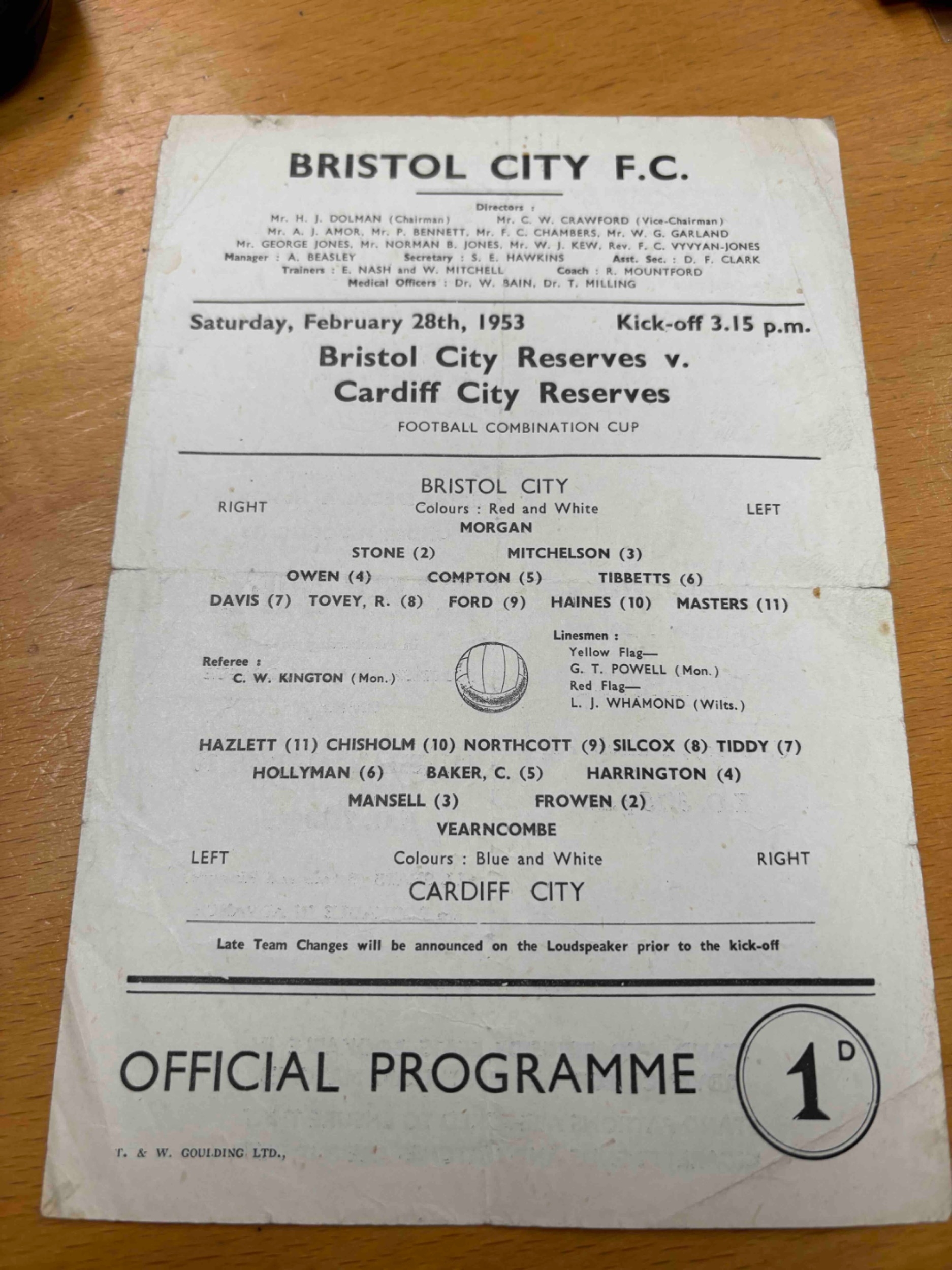 1952/53 Bristol City Reserves v Cardiff City Reserves. Football Combination Cup. S/S fold and slight tear.