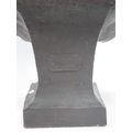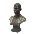 A Goldscheider Pottery Bust of a Nubian Boy, looking straight ahead and wearing a green jacket, raised upon a square base, impressed mark 'F. Goldscheider Reproduction Reservee' and number 1045, 55cm high.