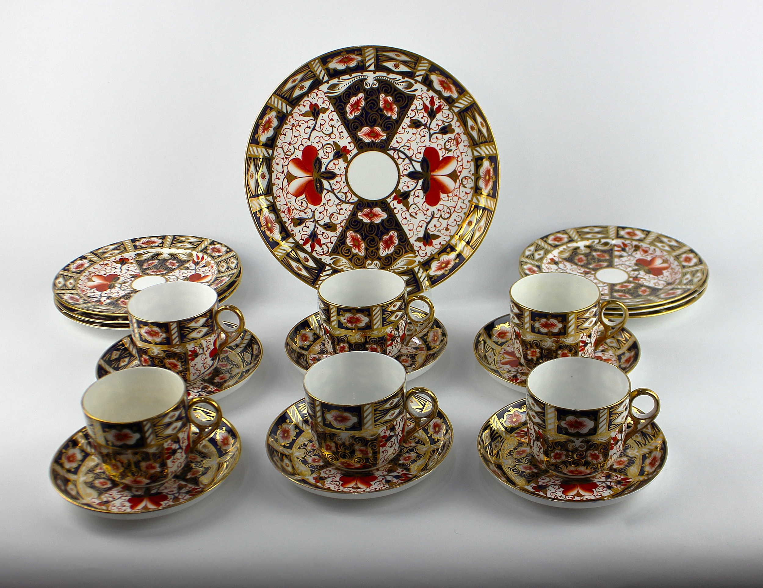 A Royal Crown Derby 'Japan' palette tea set, pattern number 2451, comprising six cups, six saucers, six side plates, and a 23cm diameter serving dish, (19).