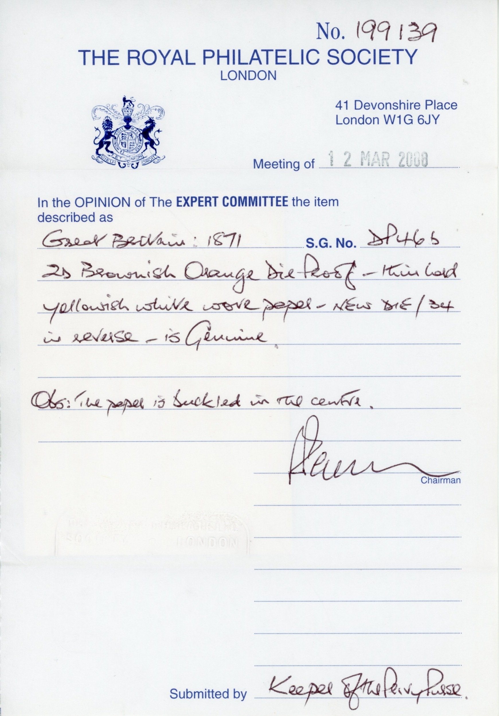 GB Spec DP46b 1871 2d Ormond Hill Die proof