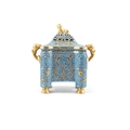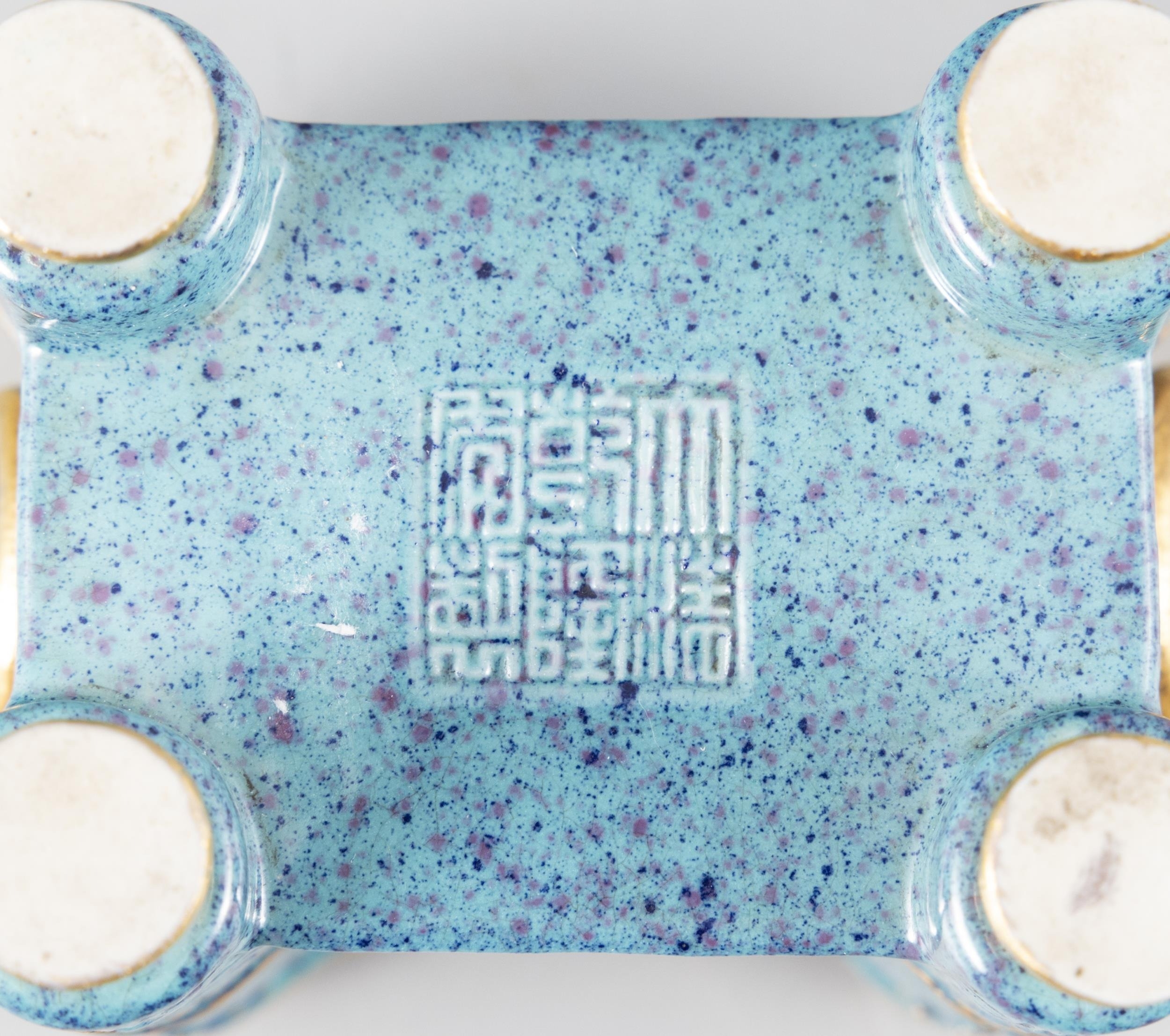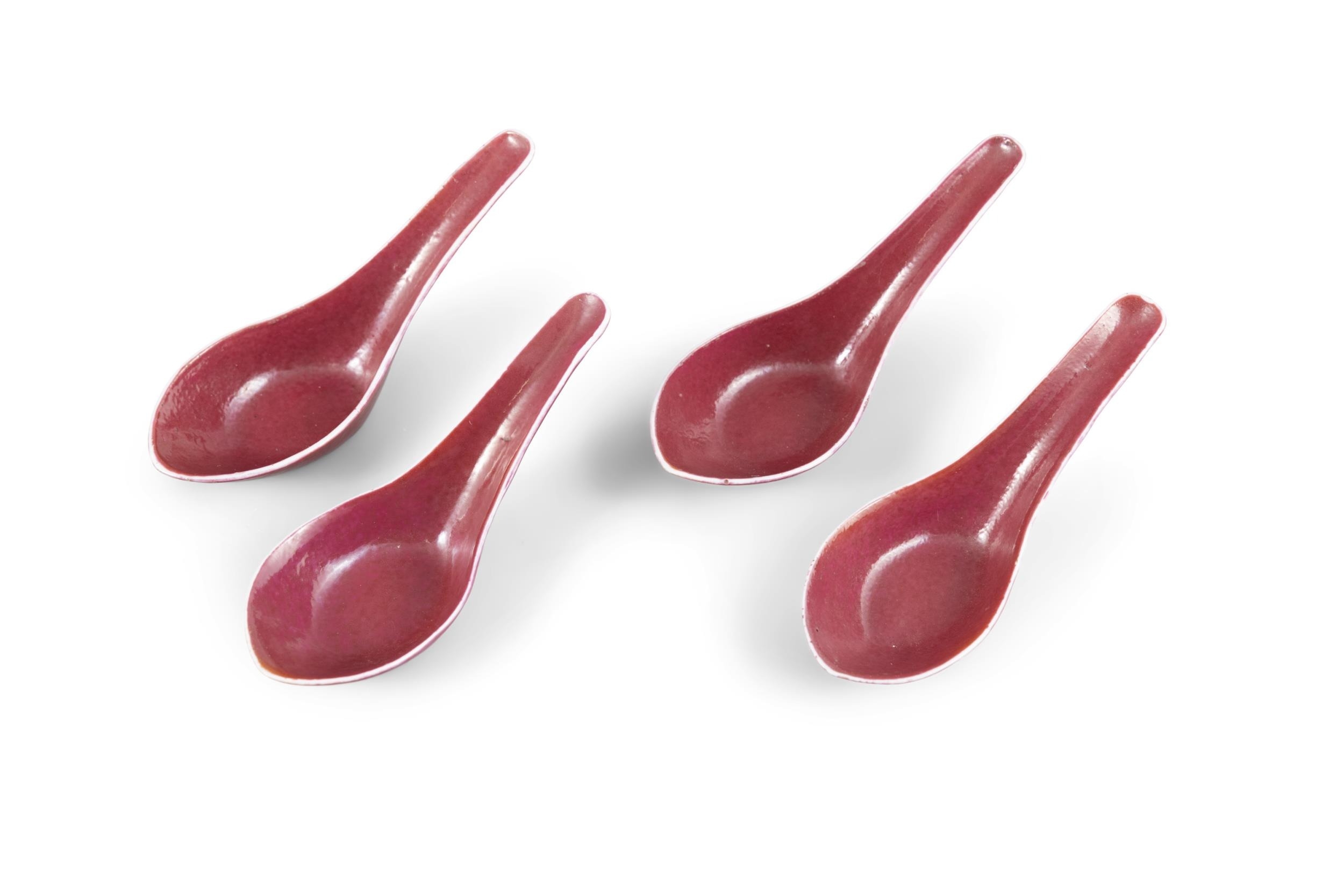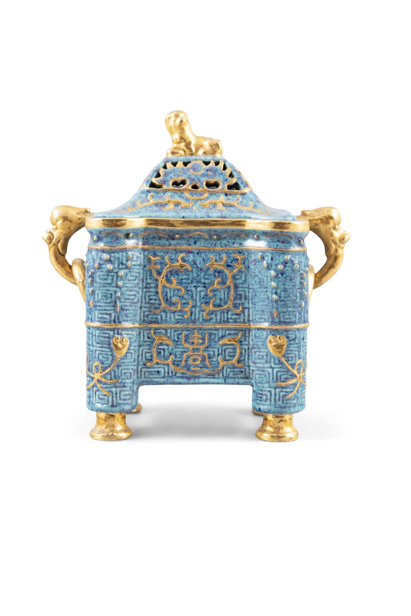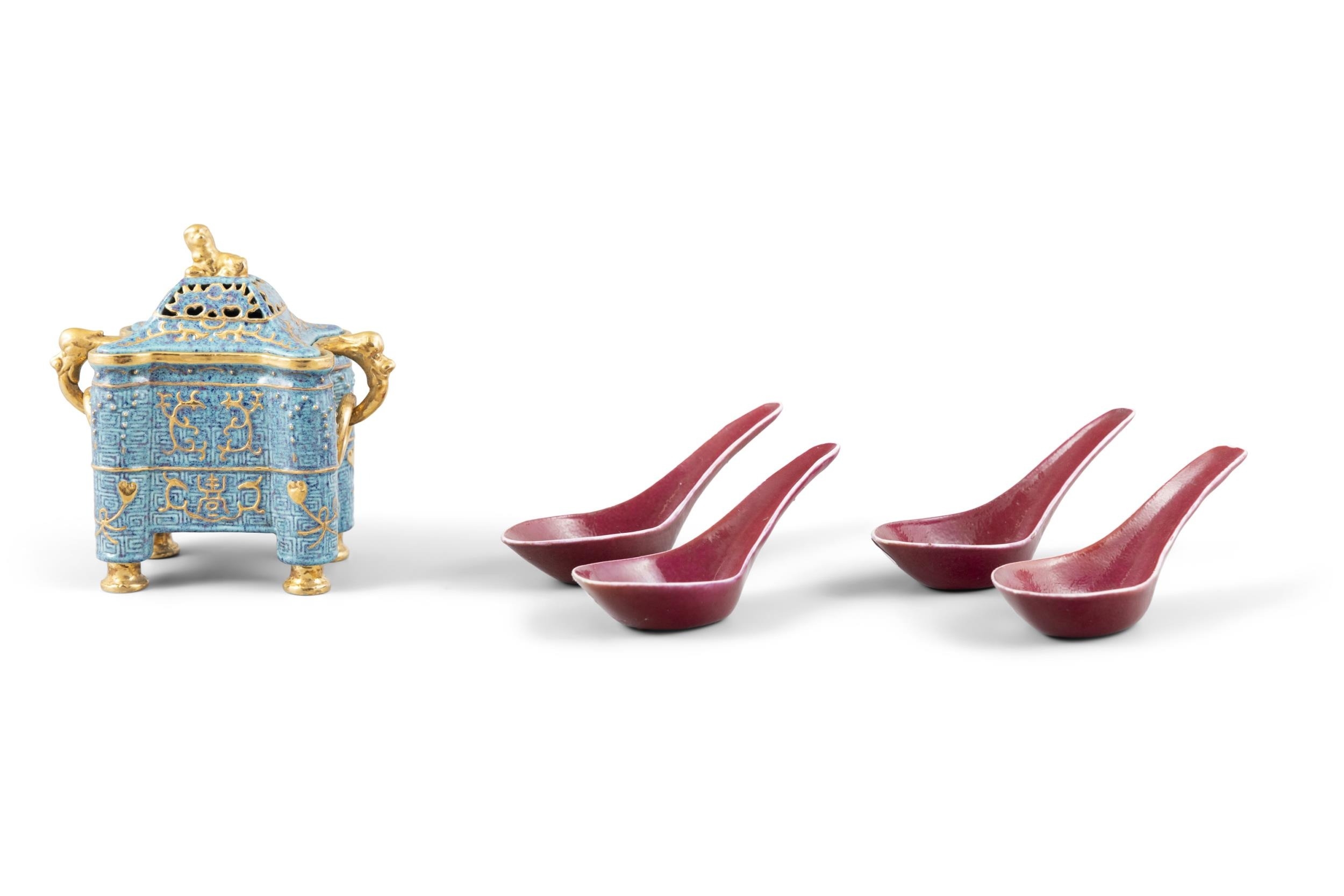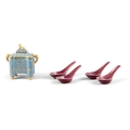 A GROUP OF PORCELAINS WITH A GILT AND LUJUN GLAZED BRONZE IMITATION COVERED INCENSE BURNER AND FOUR PINK-GLAZED SPOONS ??20?? ?????????????????? China, 20th century H: 11.8cm L: 12.3cm