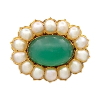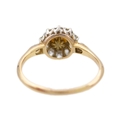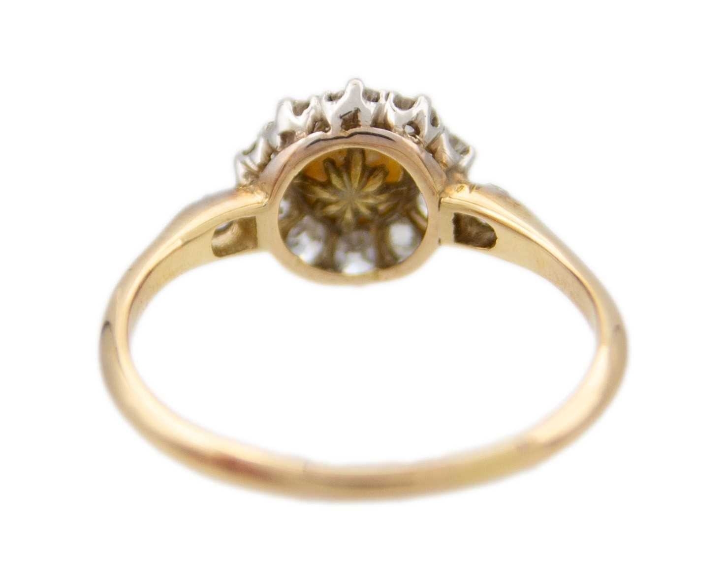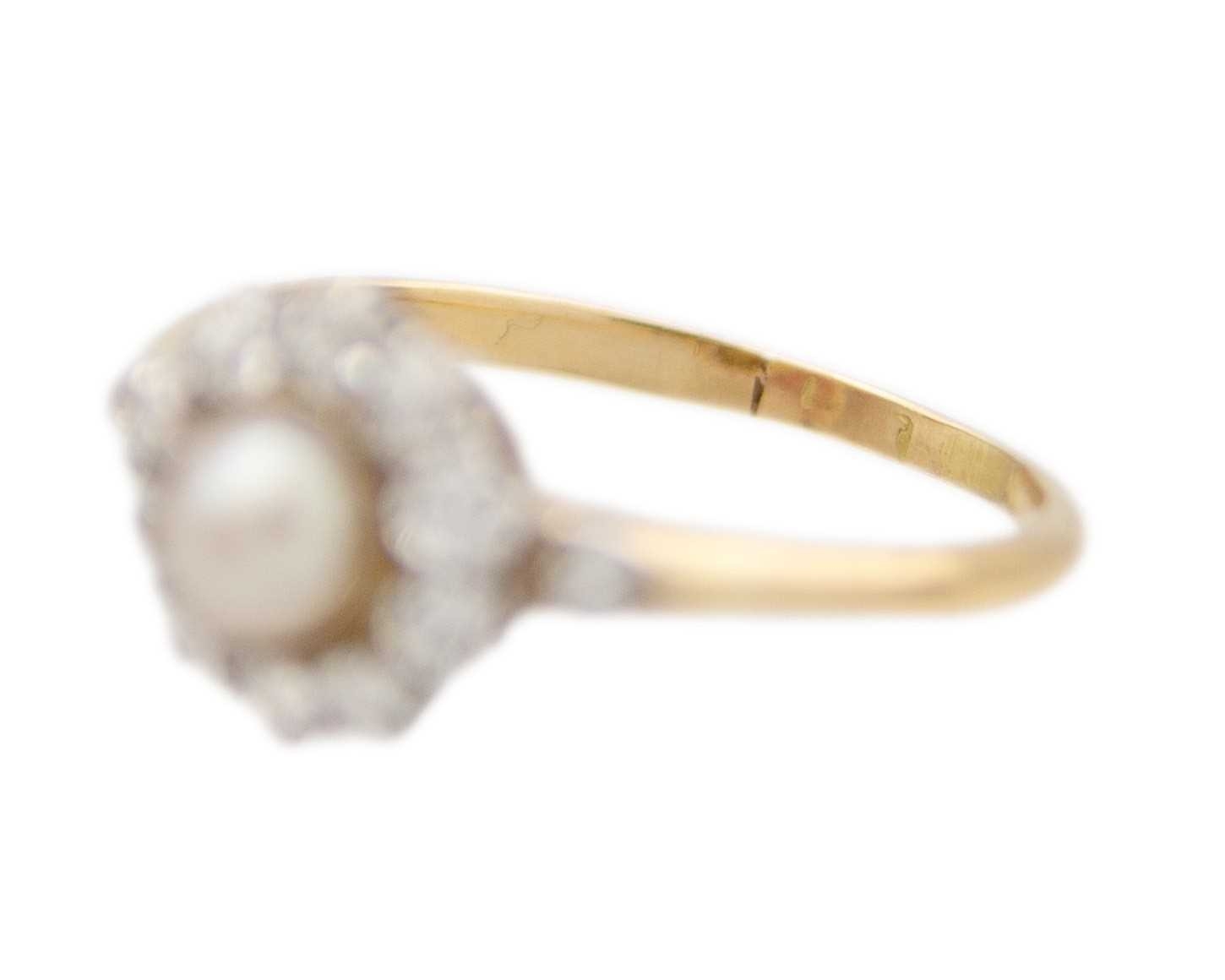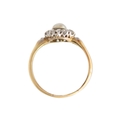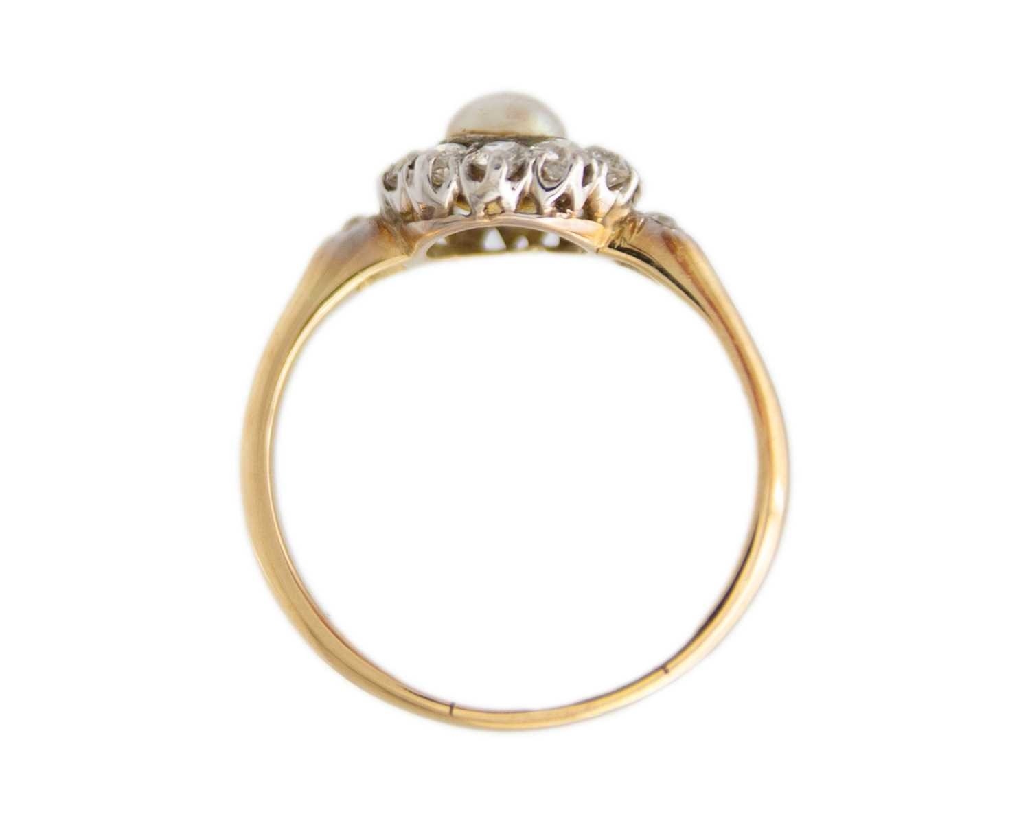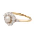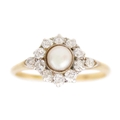 A high purity gold pearl and diamond cluster ring. The cultured pearl is 5.6mm in diameter, surrounded by ten old-English round-cut brilliant white diamonds, 2.5mm in diameter each, with a same cut diamond on each shoulder, 2.2mm approx., total diamond weight 0.60ct approx., tests as 18k gold, indistinct stamp, ring size O1/2, total weight 2.54g. No damage to the pearl or diamonds, the shank shows signs of resizing, and the ring is in good used condition.