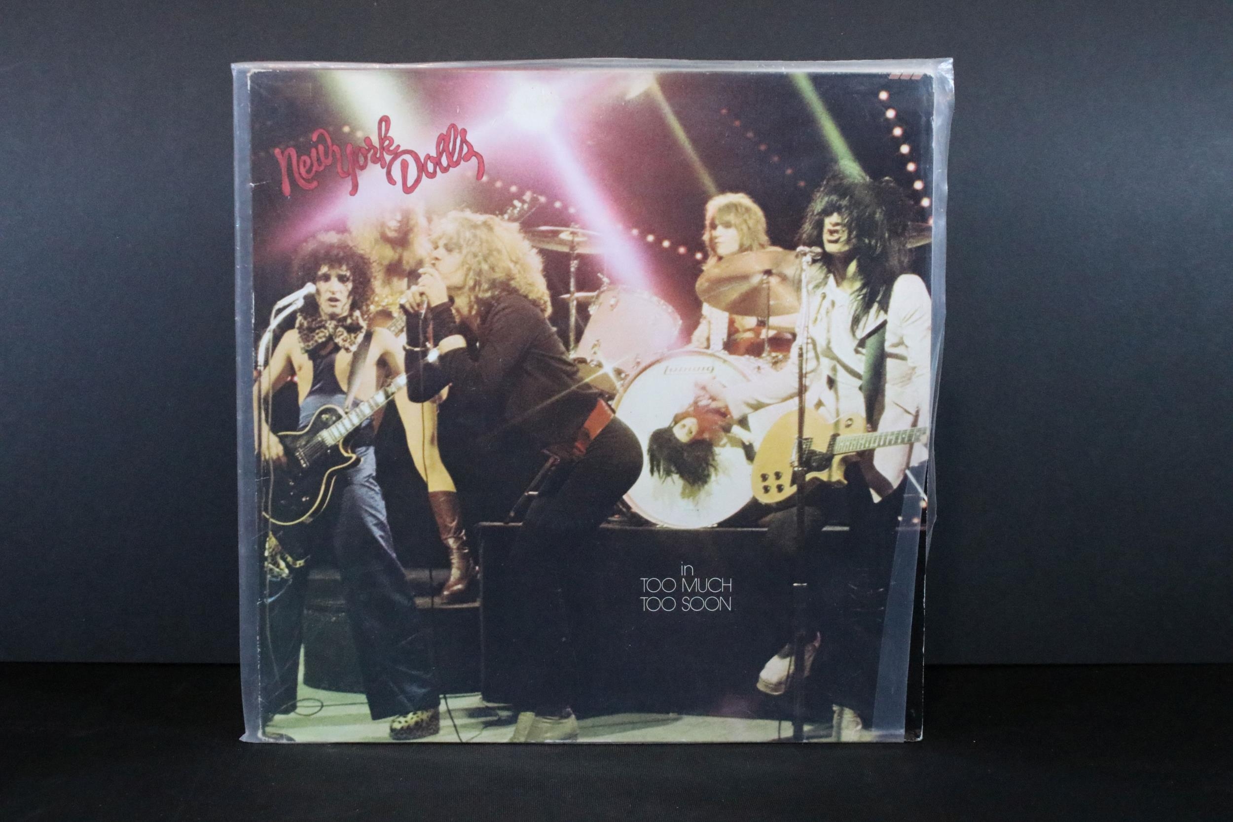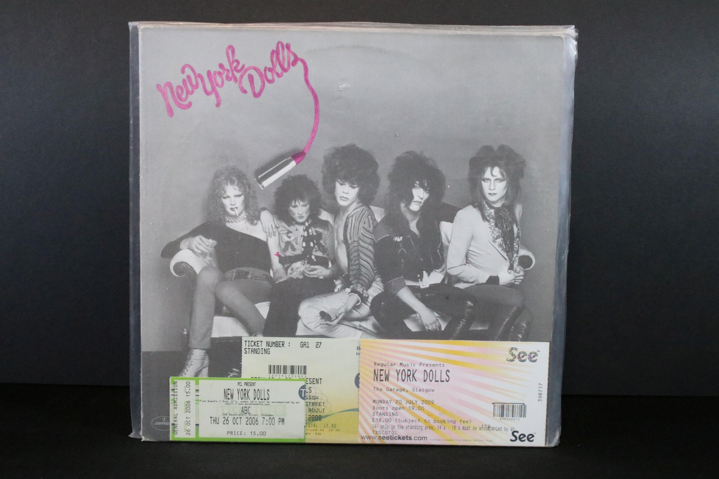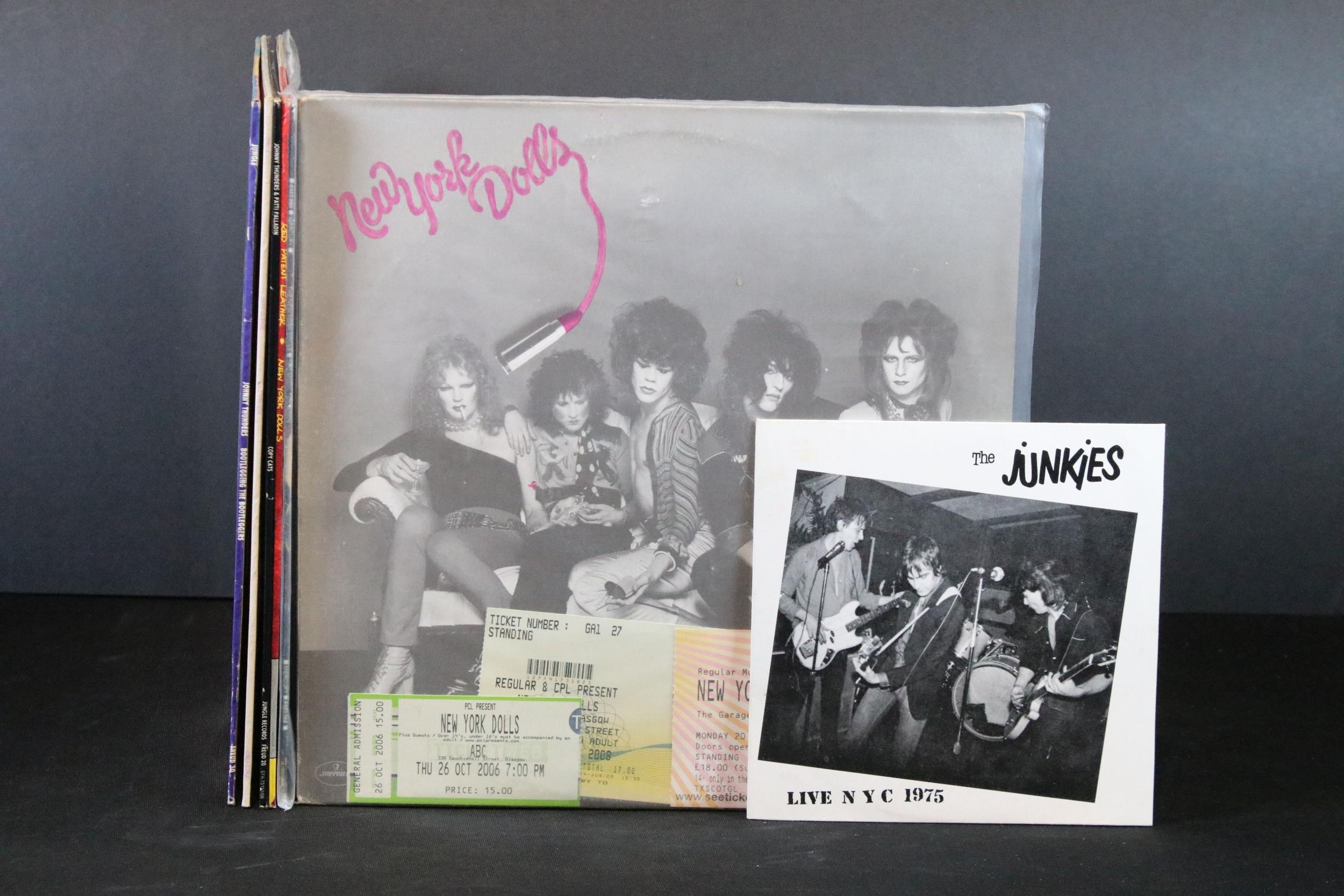 Vinyl - 6 The New York Dolls and members LPs, 1 7" and 3 UK ticket stubs from the 2000s to include Too Much Too Soon (Dutch pressing), self titled (Dutch pressing), Red Patent Leather (red vinyl French pressing) and three Johnny Thunders LPs, plus The Junkies Live NYC 1975 (7") Vg+ overall